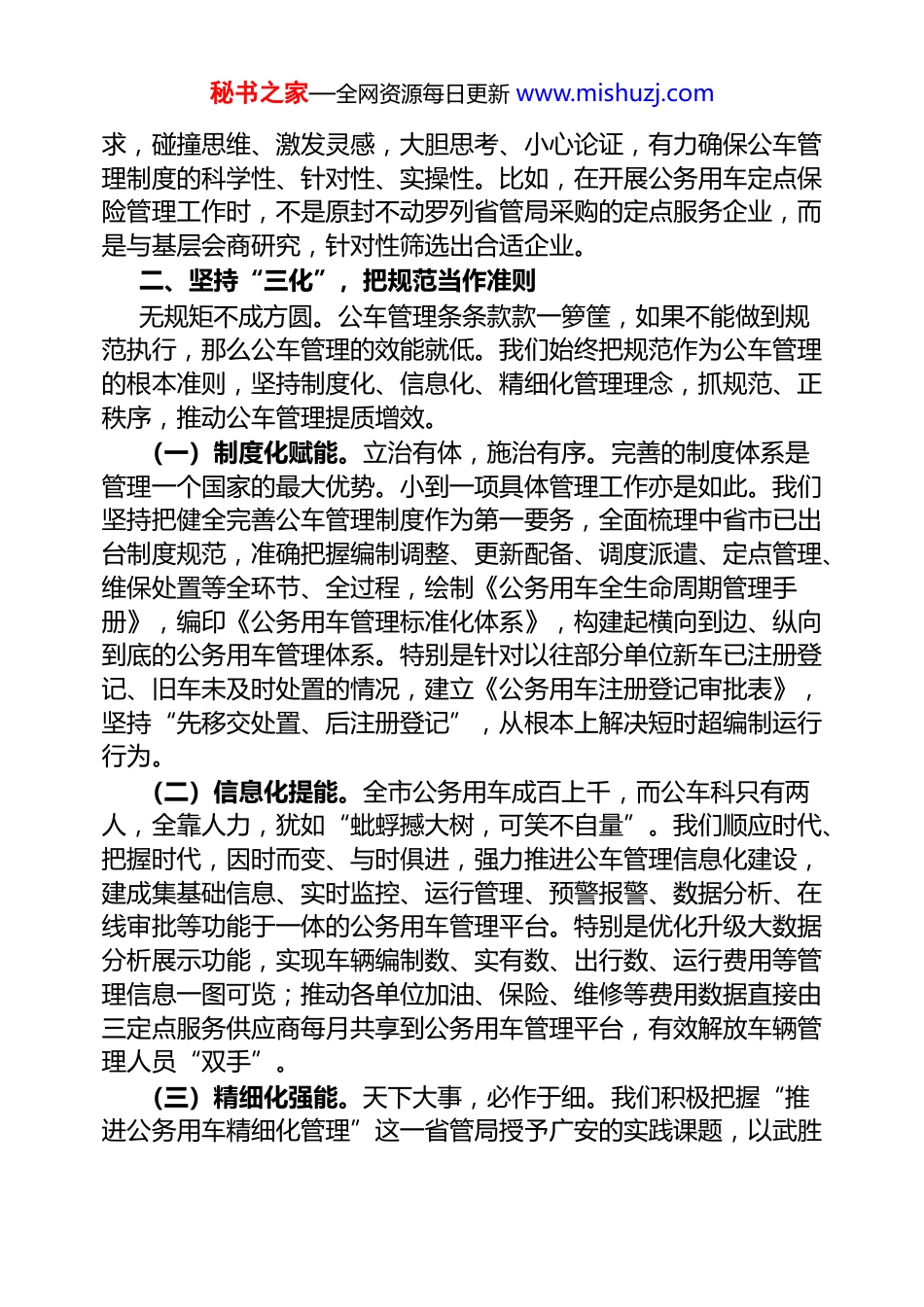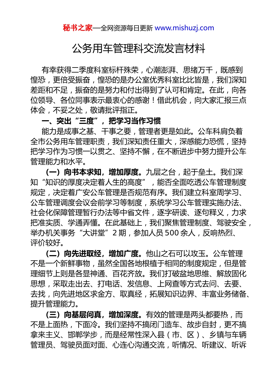 秘书之家—全网资源每日更新 www.mishuzj.com公务用车管理科交流发言材料有幸获得二季度科室标杆殊荣,心潮澎湃、思绪万千,既感到惶恐,更倍受振奋,惶恐的是办公室优秀科室比比皆是,我们深知差距和不足,振奋的是努力和付出得到了认可和肯定。在此,向各位领导、各位同事表示最衷心的感谢!借此机会,向大家汇报三点体会,不妥之处,敬请批评指正。一、突出“三度”,把学习当作习惯能力是成事之基、干事之要,管理者更是如此。公车科肩负着全市公务用车管理职责,我们深知责任重大,深感能力恐慌,坚持把学习作为习惯一以贯之、坚持不懈,在不断进步中努力提升公车管理能力和水平。(一)向书本求知,增加厚度。九层之台,起于垒土。我们深知“知识的厚度决定着人生的高度”,能否全面吃透公车管理制度规定,决定着广安公车管理是否规范有序。我们建立科室周学习、公车管理调度会议会前学习等制度,系统学习公车管理实施办法、社会化保障管理暂行办法等中省文件,逐字研读、逐句释义,力求把准实质、学通弄懂。在此基础上,我们聚焦管理制度、驾驶安全,举办机关事务“大讲堂”2 期,参加人员 500 余人,反响热烈、评价较好。(二)向先进取经,增加广度。他山之石可以攻玉。公车管理不是一个新鲜事物,虽然全国各地根植于相同的制度规定,但是管理细节上则是各显神通、百花齐放。我们打破盆地思维、解放固化思想,采取走出去、打电话、发信息、上网查等方式去问、去要、去找,向先进地区求金方、取真经,拓展知识边界、丰富业务储备、提升管理能力。(三)向基层问真,增加深度。有效的管理是两头都要热,而不是上面热,下面冷。我们坚持不搞闭门造车、故步自封,更不搞拿来主义、邯郸学步,而是经常性深入县(市、区)、乡镇与车辆管理员、驾驶员面对面、心连心沟通交流,听情况、听建议、听诉秘书之家—全网资源每日更新 www.mishuzj.com求,碰撞思维、激发灵感,大胆思考、小心论证,有力确保公车管理制度的科学性、针对性、实操性。比如,在开展公务用车定点保险管理工作时,不是原封不动罗列省管局采购的定点服务企业,而是与基层会商研究,针对性筛选出合适企业。二、坚持“三化”,把规范当作准则无规矩不成方圆。公车管理条条款款一箩筐,如果不能做到规范执行,那么公车管理的效能就低。我们始终把规范作为公车管理的根本准则,坚持制度化、信息化、精细化管理理念,抓规范、正秩序,推动公车管理提质增效。(一)制度化赋能。立治有体,施治有序。完善的制度体系是管理一个国家的最大优势。小到一项具体管理工作亦是如此。我们坚持把健全完善公车管理制度作为第一要务,全面梳理中省市已出台制度规范,准确把握编制调整、更新配备、调度派遣、定点管理、维保处置等全环节、全过程,绘制《公务用车全生命周期管理手册》,编印《公务用车管理标准化体系》,构建起横向到边、纵向到底的公务用车管理体系。特别是针对以往部分单位新车已注册登记、旧车未及时处置的情况,建立《公务用车注册登记审批表》,坚持“先移交处置、后注册登记”,从根本上解决短时超编制运行行为。(二)信息化提能。全市公务用车成百上千,而公车科只有两人,全靠人力,犹如“蚍蜉撼大树,可笑不自量”。我们顺应时代、把握时代,因时而变、与时俱进,强力推进公车管理信息化建设,建成集基础信息、实时监控、运行管理、预警报警、数据分析、在线审批等功能于一体的公务用车管理平台。特别是优化升级大数据分析展示功能,实现车辆编制数、实有数、出行数、运行费用等管理信息一图可览;推动各单位加油、保险、维修等费用数据直接由三定点服务供应商每月共享到公务用车管理平台,有效解放车辆管理人员“双手”。(三)精细化强能。天下大事,必作于细。我们积极把握“推进公务用车精细化管理”这一省管局授予广安的实践课题,以武胜秘书之家—全网资源每日更新 www.mishuzj.com县机关事务服务中心为试点,探索出“224”管理模式,即推行集中管车、集中管人“两个集中”,建立一车一档、一人一档“两个档案”,抓实精细化调度、专卡式加油、清单式维修、自助式服务“四个重点”,得到省管...