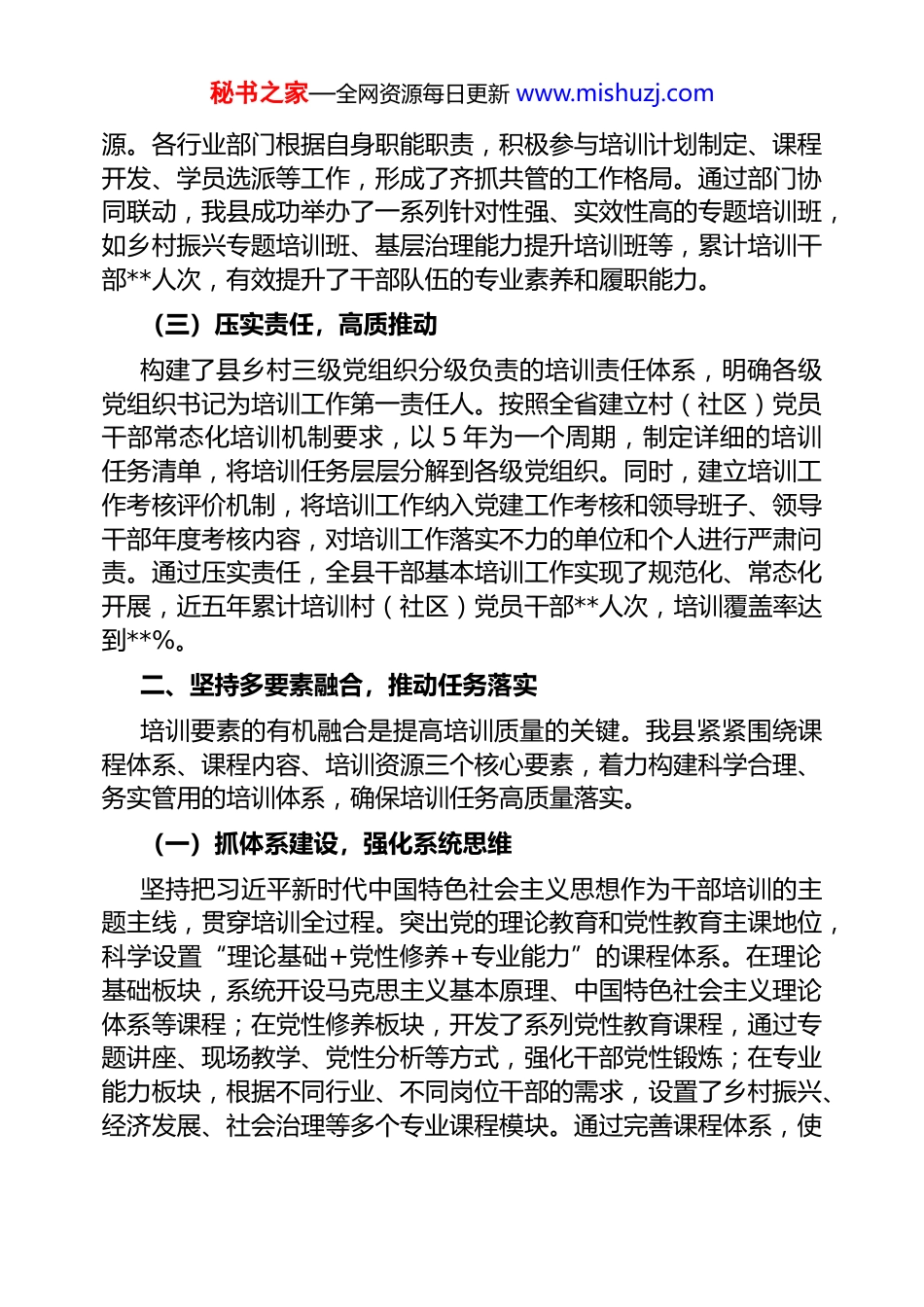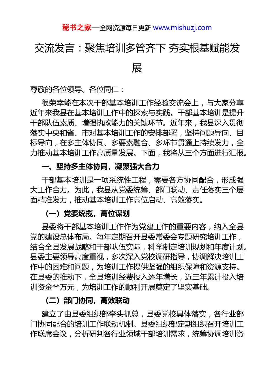 秘书之家—全网资源每日更新 www.mishuzj.com交流发言:聚焦培训多管齐下 夯实根基赋能发展尊敬的各位领导、各位同仁:很荣幸能在本次干部基本培训工作经验交流会上,与大家分享近年来我县在基本培训工作中的探索与实践。干部基本培训是提升干部队伍素质、增强执政能力的关键环节。近年来,我县深入贯彻落实中央和省、市对基本培训工作的安排部署,坚持问题导向、目标导向,在多主体协同、多要素融合、多环节贯通上持续发力,全力推动基本培训工作高质量发展。下面,我将从三个方面进行汇报。一、坚持多主体协同,凝聚强大合力干部基本培训是一项系统性工程,需要各方协同配合,形成强大工作合力。为此,我县从党委统筹、部门联动、责任落实三个层面精准发力,推动基本培训工作高位启动、高效落实。(一)党委统揽,高位谋划县委将干部基本培训工作作为党建工作的重要内容,纳入全县党的建设总体布局。每年定期召开县委常委会专题研究培训工作,结合全县发展战略和干部队伍实际,科学制定培训规划和年度计划。县委主要领导高度重视,多次深入党校调研指导,协调解决培训工作中的困难和问题,为培训工作提供坚强的组织保障和资源支持。在县委的推动下,全县培训经费投入逐年增长,近三年累计投入培训资金**万元,为培训工作的顺利开展奠定了坚实基础。(二)部门协同,高效联动建立了由县委组织部牵头抓总,县委党校具体落实,各行业部门协同配合的培训工作联动机制。县委组织部定期组织召开培训工作联席会议,分析研判各行业领域干部培训需求,统筹协调培训资秘书之家—全网资源每日更新 www.mishuzj.com源。各行业部门根据自身职能职责,积极参与培训计划制定、课程开发、学员选派等工作,形成了齐抓共管的工作格局。通过部门协同联动,我县成功举办了一系列针对性强、实效性高的专题培训班,如乡村振兴专题培训班、基层治理能力提升培训班等,累计培训干部**人次,有效提升了干部队伍的专业素养和履职能力。(三)压实责任,高质推动构建了县乡村三级党组织分级负责的培训责任体系,明确各级党组织书记为培训工作第一责任人。按照全省建立村(社区)党员干部常态化培训机制要求,以 5 年为一个周期,制定详细的培训任务清单,将培训任务层层分解到各级党组织。同时,建立培训工作考核评价机制,将培训工作纳入党建工作考核和领导班子、领导干部年度考核内容,对培训工作落实不力的单位和个人进行严肃问责。通过压实责任,全县干部基本培训工作实现了规范化、常态化开展,近五年累计培训村(社区)党员干部**人次,培训覆盖率达到**%。二、坚持多要素融合,推动任务落实培训要素的有机融合是提高培训质量的关键。我县紧紧围绕课程体系、课程内容、培训资源三个核心要素,着力构建科学合理、务实管用的培训体系,确保培训任务高质量落实。(一)抓体系建设,强化系统思维坚持把习近平新时代中国特色社会主义思想作为干部培训的主题主线,贯穿培训全过程。突出党的理论教育和党性教育主课地位,科学设置“理论基础+党性修养+专业能力”的课程体系。在理论基础板块,系统开设马克思主义基本原理、中国特色社会主义理论体系等课程;在党性修养板块,开发了系列党性教育课程,通过专题讲座、现场教学、党性分析等方式,强化干部党性锻炼;在专业能力板块,根据不同行业、不同岗位干部的需求,设置了乡村振兴、经济发展、社会治理等多个专业课程模块。通过完善课程体系,使秘书之家—全网资源每日更新 www.mishuzj.com干部培训更加系统、全面,为干部成长提供了有力的理论支撑和知识储备。(二)抓课程开发,提升培训质效紧扣党和国家事业发展需要以及干部队伍能力短板,大力推进课程开发工作。以市(州)为单位建立基本培训统筹协调机制为契机,整合全县优质资源,筹备建设了具有地方特色的教研室。组织党校教师、行业专家深入开展调研,结合县情实际,开发了一批具有针对性和实用性的优质特色课程。目前,已累计开发优质特色课程**门,其中入选省市两级好课程**门、精品课程**门、达标课程**门。在课程开发过程中,注重课程内容的更新和优化,及时将党的最新理论成果、政策法规...