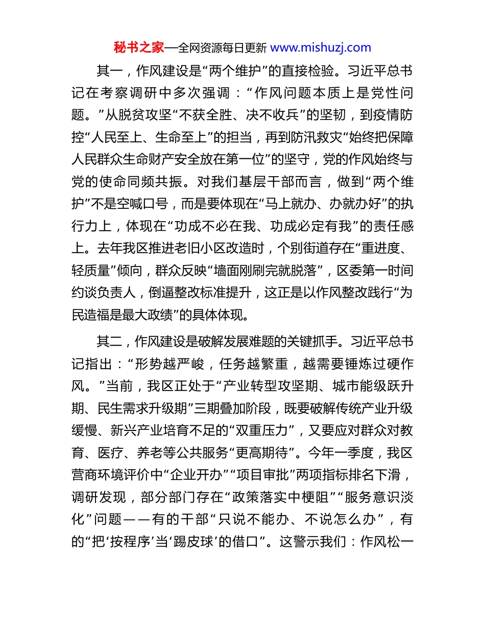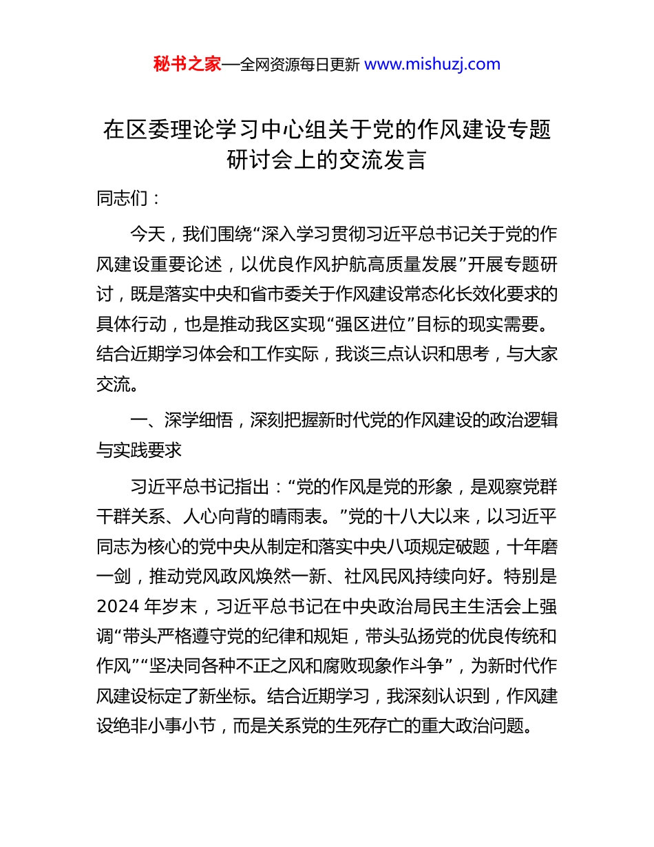 秘书之家—全网资源每日更新 www.mishuzj.com在区委理论学习中心组关于党的作风建设专题研讨会上的交流发言同志们:“今天,我们围绕 深入学习贯彻习近平总书记关于党的作”风建设重要论述,以优良作风护航高质量发展 开展专题研讨,既是落实中央和省市委关于作风建设常态化长效化要求的“”具体行动,也是推动我区实现 强区进位 目标的现实需要。结合近期学习体会和工作实际,我谈三点认识和思考,与大家交流。一、深学细悟,深刻把握新时代党的作风建设的政治逻辑与实践要求“习近平总书记指出: 党的作风是党的形象,是观察党群”干群关系、人心向背的晴雨表。 党的十八大以来,以习近平同志为核心的党中央从制定和落实中央八项规定破题,十年磨一剑,推动党风政风焕然一新、社风民风持续向好。特别是2024 年岁末,习近平总书记在中央政治局民主生活会上强“调 带头严格遵守党的纪律和规矩,带头弘扬党的优良传统和”“”作风坚决同各种不正之风和腐败现象作斗争 ,为新时代作风建设标定了新坐标。结合近期学习,我深刻认识到,作风建设绝非小事小节,而是关系党的生死存亡的重大政治问题。秘书之家—全网资源每日更新 www.mishuzj.com“”其一,作风建设是 两个维护 的直接检验。习近平总书记在考察调研中多次强调: “作风问题本质上是党性问”“”题。 从脱贫攻坚 不获全胜、决不收兵 的坚韧,到疫情防“”“控 人民至上、生命至上 的担当,再到防汛救灾 始终把保障”人民群众生命财产安全放在第一位 的坚守,党的作风始终与“党的使命同频共振。对我们基层干部而言,做到 两个维”“”护 不是空喊口号,而是要体现在 马上就办、办就办好 的执“”行力上,体现在 功成不必在我、功成必定有我 的责任感“上。去年我区推进老旧小区改造时,个别街道存在 重进度、”“”轻质量 倾向,群众反映 墙面刚刷完就脱落 ,区委第一时间“约谈负责人,倒逼整改标准提升,这正是以作风整改践行 为”民造福是最大政绩 的具体体现。其二,作风建设是破解发展难题的关键抓手。习近平总书“记指出: 形势越严峻,任务越繁重,越需要锤炼过硬作”“风。 当前,我区正处于 产业转型攻坚期、城市能级跃升”期、民生需求升级期 三期叠加阶段,既要破解传统产业升级“”缓慢、新兴产业培育不足的 双重压力 ,又要应对群众对教“”育、医疗、养老等公共服务 更高期待 。今年一季度,我区“”“”营商环境评价中 企业开办项目审批 两项指标排名下滑,“调研发现,部分部门存在 政策落实中梗阻”“服务意识淡”——“”化 问题有的干部 只说不能办、不说怎么办,有“‘’‘’”的 把 按程序 当 踢皮球 的借口 。这警示我们:作风松一秘书之家—全网资源每日更新 www.mishuzj.com“”尺,发展退一丈;只有以 严真细实快 的作风破难题、促发展,才能在区域竞争中赢得主动。“”其三,作风建设是密切党群关系的 连心桥 。人民论坛网 2025 年 6“月刊文指出: 作风建设的核心是保持党同人民”“”群众的血肉联系。 去年我区开展 千名干部下基层 活动,收集群众诉求 1276 件,其中 85%“”“”“是 停车难买菜远路灯不”“”亮 等 关键小事 。但在办理过程中,仍有 12%“的诉求因 推”“”诿扯皮敷衍塞责 被群众二次投诉。这说明,作风问题“”“”的 最后一公里 往往藏在群众的 急难愁盼 里。正如总书记“”“强调的: 群众看我们党,首先看作风。 只有把群众的 表情”“”“包 当作作风建设的 晴雨表 ,才能真正让 干部多跑腿、群”众少烦心 。二、对标检视,清醒认识当前作风建设存在的短板与症结“”近年来,区委以 钉钉子精神 抓作风建设,全区干部队“”伍整体呈现 想干事、能干事、干成事 的良好态势,但对照“习近平总书记重要要求和群众期待,仍存在 四个不容忽”视 的问题:“”一是 政治站位不高 的倾向仍有残留。个别干部对作风“”建设的政治属性认识不足,把 落实中央八项规定精神 简单“”“理解为 不吃请、不收礼 ,对 表态多调门高、行动少落实”差 等形式主义问题警惕不够。比如,...