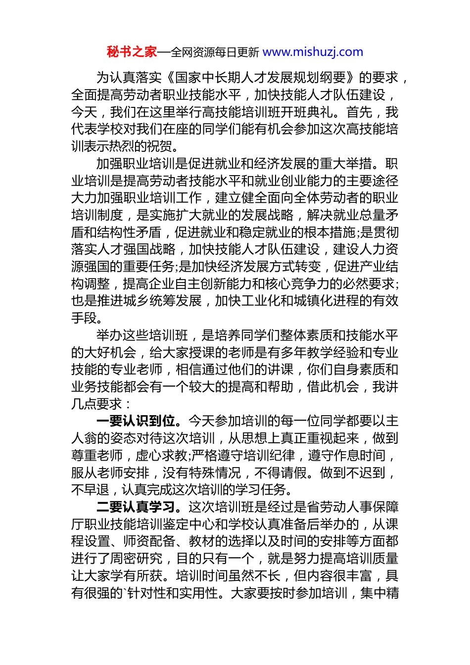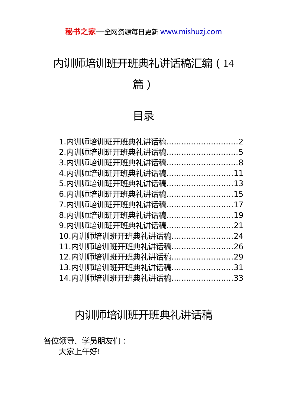 秘书之家—全网资源每日更新 www.mishuzj.com内训师培训班开班典礼讲话稿汇编(14篇)目录1.内训师培训班开班典礼讲话稿.............................22.内训师培训班开班典礼讲话稿.............................53.内训师培训班开班典礼讲话稿.............................84.内训师培训班开班典礼讲话稿...........................115.内训师培训班开班典礼讲话稿...........................136.内训师培训班开班典礼讲话稿...........................157.内训师培训班开班典礼讲话稿...........................178.内训师培训班开班典礼讲话稿...........................199.内训师培训班开班典礼讲话稿...........................2110.内训师培训班开班典礼讲话稿.........................2411.内训师培训班开班典礼讲话稿.........................2612.内训师培训班开班典礼讲话稿.........................2913.内训师培训班开班典礼讲话稿.........................3114.内训师培训班开班典礼讲话稿.........................33内训师培训班开班典礼讲话稿各位领导、学员朋友们:大家上午好!秘书之家—全网资源每日更新 www.mishuzj.com为认真落实《国家中长期人才发展规划纲要》的要求,全面提高劳动者职业技能水平,加快技能人才队伍建设,今天,我们在这里举行高技能培训班开班典礼。首先,我代表学校对我们在座的同学们能有机会参加这次高技能培训表示热烈的祝贺。加强职业培训是促进就业和经济发展的重大举措。职业培训是提高劳动者技能水平和就业创业能力的主要途径大力加强职业培训工作,建立健全面向全体劳动者的职业培训制度,是实施扩大就业的发展战略,解决就业总量矛盾和结构性矛盾,促进就业和稳定就业的根本措施;是贯彻落实人才强国战略,加快技能人才队伍建设,建设人力资源强国的重要任务;是加快经济发展方式转变,促进产业结构调整,提高企业自主创新能力和核心竞争力的必然要求;也是推进城乡统筹发展,加快工业化和城镇化进程的有效手段。举办这些培训班,是培养同学们整体素质和技能水平的大好机会,给大家授课的老师是有多年教学经验和专业技能的专业老师,相信通过他们的讲课,你们自身素质和业务技能都会有一个较大的提高和帮助,借此机会,我讲几点要求:一要认识到位。今天参加培训的每一位同学都要以主人翁的姿态对待这次培训,从思想上真正重视起来,做到尊重老师,虚心求教;严格遵守培训纪律,遵守作息时间,服从老师安排,没有特殊情况,不得请假。做到不迟到,不早退,认真完成这次培训的学习任务。二要认真学习。这次培训班是经过是省劳动人事保障厅职业技能培训鉴定中心和学校认真准备后举办的,从课程设置、师资配备、教材的选择以及时间的安排等方面都进行了周密研究,目的只有一个,就是努力提高培训质量让大家学有所获。培训时间虽然不长,但内容很丰富,具有很强的`针对性和实用性。大家要按时参加培训,集中精秘书之家—全网资源每日更新 www.mishuzj.com力,专心听讲,做好笔记;既向老师学习,又要互相学习,力求学得更多一点,学得更好一点。三要深入思考。大家在学习的过程中,要紧密结合岗位实际,把学习与思考很好地结合起来,用科学的态度分析问题、解决问题,不断提高自己的实际工作能力。四是要学以致用。大家要把所学的知识运用到实际工作中去,狠抓落实。坚持学用结合,学以致用,通过学习与实践的积累,提升自己的能力素质和工作水平。同学们,知识改变命运,技能创造财富,高技能培训班的举办凝聚着省厅领导的深切关怀和殷切希望,凝聚着各位主讲老师的辛勤劳动和无私付出!我们衷心希望各位同学要以培训班为新的起点,树立起勤奋学习的恒心、坚定拼搏奋斗的信心,拥有回报社会的爱心,燃起希望、扬起航帆、去实现你们心中的梦想。相信你们一定能够用自己的双手创造辉煌的明天,用你们的智慧和汗水为企业的升级、转型和社会和谐贡献应有的力量。最后,祝马上走入课堂的同学们在学习中学有所获,技有所成!并预祝这次培训取得圆满成功。谢谢大家!内训师培训班开班典礼讲话稿尊敬的季院长、敬爱的老师:大家晚...