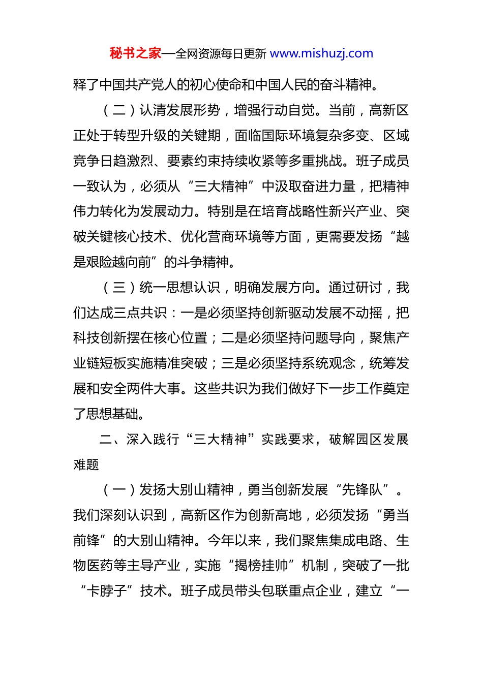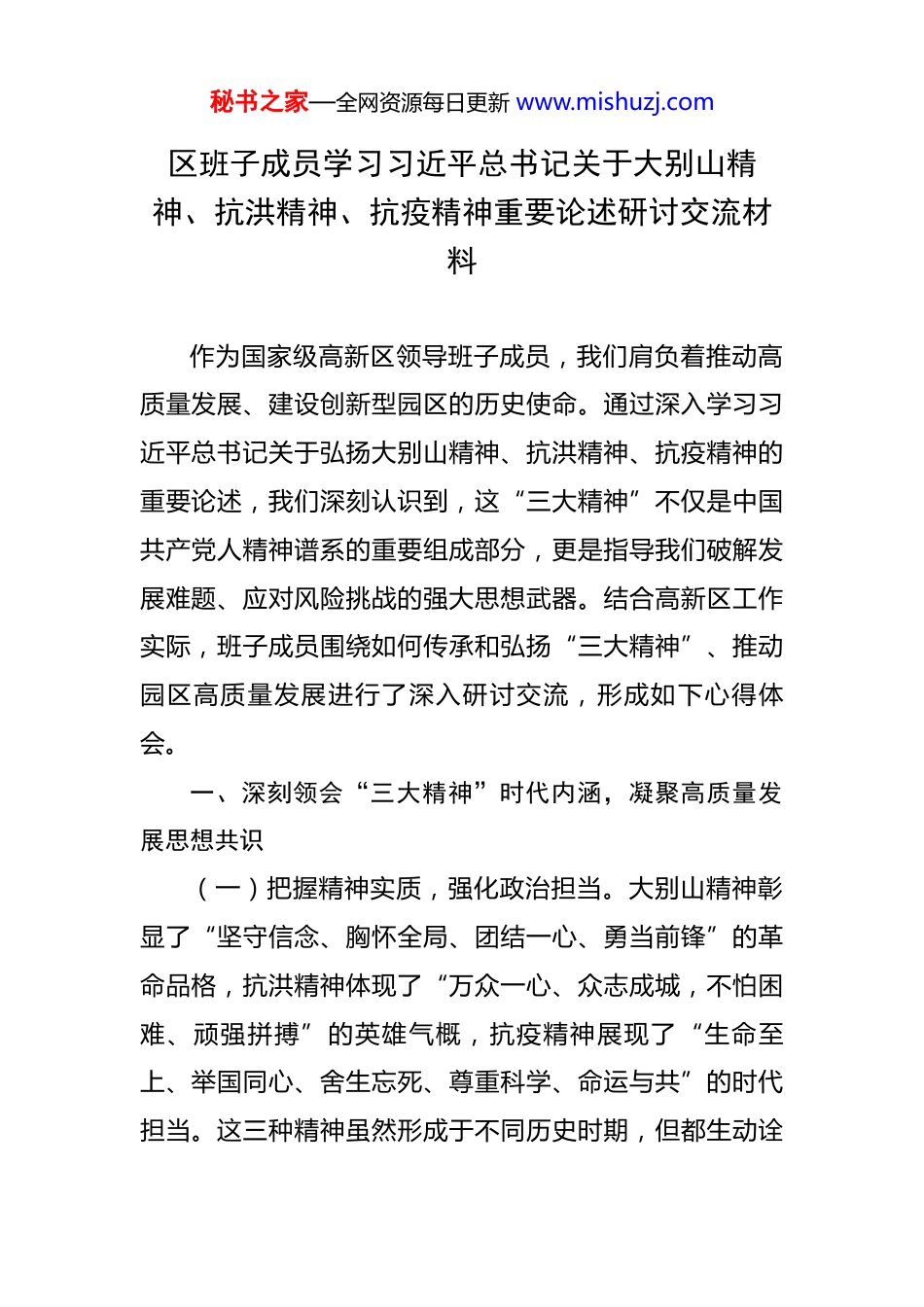 秘书之家—全网资源每日更新 www.mishuzj.com区班子成员学习习近平总书记关于大别山精神、抗洪精神、抗疫精神重要论述研讨交流材料 作为国家级高新区领导班子成员,我们肩负着推动高质量发展、建设创新型园区的历史使命。通过深入学习习近平总书记关于弘扬大别山精神、抗洪精神、抗疫精神的重要论述,我们深刻认识到,这“三大精神”不仅是中国共产党人精神谱系的重要组成部分,更是指导我们破解发展难题、应对风险挑战的强大思想武器。结合高新区工作实际,班子成员围绕如何传承和弘扬“三大精神”、推动园区高质量发展进行了深入研讨交流,形成如下心得体会。一、深刻领会“三大精神”时代内涵,凝聚高质量发展思想共识(一)把握精神实质,强化政治担当。大别山精神彰显了“坚守信念、胸怀全局、团结一心、勇当前锋”的革命品格,抗洪精神体现了“万众一心、众志成城,不怕困难、顽强拼搏”的英雄气概,抗疫精神展现了“生命至上、举国同心、舍生忘死、尊重科学、命运与共”的时代担当。这三种精神虽然形成于不同历史时期,但都生动诠秘书之家—全网资源每日更新 www.mishuzj.com释了中国共产党人的初心使命和中国人民的奋斗精神。(二)认清发展形势,增强行动自觉。当前,高新区正处于转型升级的关键期,面临国际环境复杂多变、区域竞争日趋激烈、要素约束持续收紧等多重挑战。班子成员一致认为,必须从“三大精神”中汲取奋进力量,把精神伟力转化为发展动力。特别是在培育战略性新兴产业、突破关键核心技术、优化营商环境等方面,更需要发扬“越是艰险越向前”的斗争精神。(三)统一思想认识,明确发展方向。通过研讨,我们达成三点共识:一是必须坚持创新驱动发展不动摇,把科技创新摆在核心位置;二是必须坚持问题导向,聚焦产业链短板实施精准突破;三是必须坚持系统观念,统筹发展和安全两件大事。这些共识为我们做好下一步工作奠定了思想基础。二、深入践行“三大精神”实践要求,破解园区发展难题(一)发扬大别山精神,勇当创新发展“先锋队”。我们深刻认识到,高新区作为创新高地,必须发扬“勇当前锋”的大别山精神。今年以来,我们聚焦集成电路、生物医药等主导产业,实施“揭榜挂帅”机制,突破了一批“卡脖子”技术。班子成员带头包联重点企业,建立“一秘书之家—全网资源每日更新 www.mishuzj.com个项目、一名领导、一套班子、一抓到底”的工作机制,推动重点项目落地见效。特别是在某关键材料研发项目中,面对技术壁垒,我们组织专班连续攻关,最终取得重大突破。(二)弘扬抗洪精神,筑牢风险防控“堤坝”。高新区企业密集、人员流动性大,安全风险防控任务艰巨。我们借鉴抗洪精神中“严防死守”的工作方法,构建了“1+4+N”应急管理体系(1 个指挥中心、4 级响应机制、N 个专业队伍),开展安全生产专项整治三年行动。班子成员坚持每周带队检查重点企业,建立风险隐患清单化管理机制。在今年防汛抗台工作中,我们提前部署、科学应对,确保了园区企业零伤亡、财产少损失。(三)践行抗疫精神,优化为企服务“生态圈”。面对经济下行压力,我们发扬抗疫精神中“精准施策”的科学态度,创新推出“防疫泡泡”管理模式,保障重点企业封闭生产。班子成员分片包干,走访企业 300 余家,收集解决问题诉求 156 个。实施“免申即享”政策兑现机制,为企业减税降费超 5 亿元。特别是针对中小企业融资难问题,我们搭建银企对接平台,创新知识产权质押融资模式,帮助 50 余家企业获得贷款支持。三、深化拓展“三大精神”实践路径,谱写发展新篇秘书之家—全网资源每日更新 www.mishuzj.com章(一)在创新驱动发展上实现新突破。我们将建立“三大精神”与科技创新深度融合机制:一是实施“红色引擎”工程,在重点实验室、研发中心设立党员先锋岗;二是开展“创新尖兵”评选,表彰在技术攻关中表现突出的团队和个人;三是建设开放式创新平台,促进产学研协同创新。力争到 2025 年,高新技术企业突破 1000 家,研发投入强度达到 5%以上。(二)在产业转型升级上展现新作为。班子成员一致认为,必须发扬斗争精神,打好产业基础高级化、产业链现代...