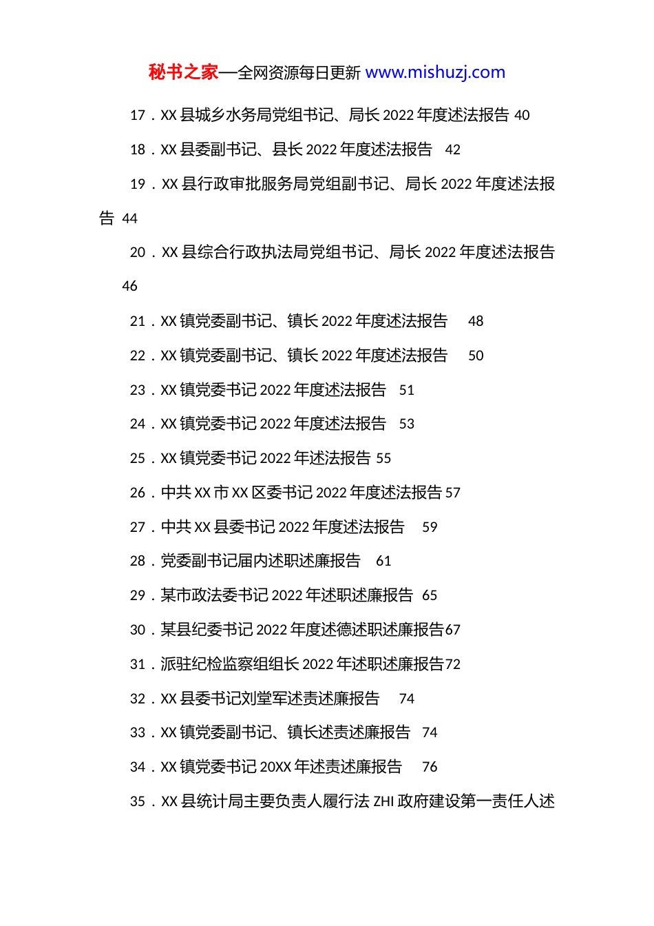 秘书之家—全网资源每日更新 www.mishuzj.com1.(党委)党组班子年度述职述廉报告42.2022 年党政领导干部述职述廉报告 93.20XX 年 XX 镇党委副书记、镇长述法报告124.XX 街道党工委副书记、办事处主任 2022 年度述法报告145.XX 街道党工委书记 20XX 年度述法报告166.XX 街道党工委书记 2022 年度述法报告187.XX 街道党工委书记 2022 年度述法报告208.XX 市 XX 区委副书记、区长 2022 年度述法报告 229.XX 市场监督管理局党组书记、局长 2022 年度述法报告2410.XX 市城乡水务局党组书记、局长 2022 年度述法报告 2611.XX 市城乡水务局党组书记 2022 年度述法报告 2812.XX 市经济开发区工委书记、管委主任 2022 年度述法报告3013.XX 市旅游度假区党工委书记、管委副主任 2022 年度述法报告3214.XX 市文化和旅游局党组书记、局长 2022 年度述法报告3415.XX 市应急管理局党政主要负责人 2022 年度述法报告 3616.XX 市综合行政执法局党政主要负责人 2022 年度述法报告38秘书之家—全网资源每日更新 www.mishuzj.com17.XX 县城乡水务局党组书记、局长 2022 年度述法报告 4018.XX 县委副书记、县长 2022 年度述法报告4219.XX 县行政审批服务局党组副书记、局长 2022 年度述法报告 4420.XX 县综合行政执法局党组书记、局长 2022 年度述法报告4621.XX 镇党委副书记、镇长 2022 年度述法报告4822.XX 镇党委副书记、镇长 2022 年度述法报告5023.XX 镇党委书记 2022 年度述法报告5124.XX 镇党委书记 2022 年度述法报告5325.XX 镇党委书记 2022 年述法报告 5526.中共 XX 市 XX 区委书记 2022 年度述法报告 5727.中共 XX 县委书记 2022 年度述法报告5928.党委副书记届内述职述廉报告6129.某市政法委书记 2022 年述职述廉报告 6530.某县纪委书记 2022 年度述德述职述廉报告6731.派驻纪检监察组组长 2022 年述职述廉报告7232.XX 县委书记刘堂军述责述廉报告7433.XX 镇党委副书记、镇长述责述廉报告 7434.XX 镇党委书记 20XX 年述责述廉报告7635.XX 县统计局主要负责人履行法 ZHI 政府建设第一责任人述秘书之家—全网资源每日更新 www.mishuzj.com责述职报告7736.XX 市特检所 20XX 年度个人述责述廉报告 7937.XX 区科工贸和信息化局党组书记、局长述责述廉报告8238.XX 大队党委书记、政 ZHI 教导员述责述廉报告8339.XX 县消防救援大队初级专业技术职务述职述责述廉报告 8540.XX 市退役军人事务局党组书记、局长 20XX 年述责述廉报告 8741.XX 市 XX 区人民法院 XX 法庭庭长述职述德述廉报告8842.XX 县医疗保障局县管领导班子 20XX 年度述职述廉报告 8943.XX 市委副秘书长、市机关事务管理局党组书记、局长 20XX年度个人述职述廉报告 9144.XX 市机关事务管理局党组成员、副局长 20XX 年度个人述职述责述廉报告 9445.XX 市机关事务管理局副局长 20XX 年度个人述职述廉报告9646.XX 市接待处处长 20XX 年度个人述职述廉报告 9847.XX 市委市政府老区管理处处长 20XX 年度个人述职述廉报告 10048.XX 街道党工委书记述责述廉报告10249.XX 省委常委、XX 市委书记履行基层党建工作责任述职报告103秘书之家—全网资源每日更新 www.mishuzj.com50.XX 市委书记履行基层党建工作责任述职报告 10451.XX 中学纪检监察室主任述职报告10552.镇班子成员 2022 年度个人述职报告106(党委)党组班子年度述职述廉报告一年来,在 xx 省委、省政府及 xx 市委的正确领导下,市人民政府党组班子坚持以 XXX 思想为指导,深入学习贯彻党的十九大和十九届历次全会精神和 XXX 重要指示精神,认真贯彻落实中 Y 和省委、市委各项决策部署,坚持以高质量发展统揽全局,坚持稳中求进工作总基调,坚持新发展理念,落实高质量发展要求,统筹推进疫情防控、巩固脱贫成果和经济社会发展,扎实做好“六稳”“六保”工作,较好地完成了全年经济社会发展各项目标任务,为“十四五”良好开局打下了坚实基础...