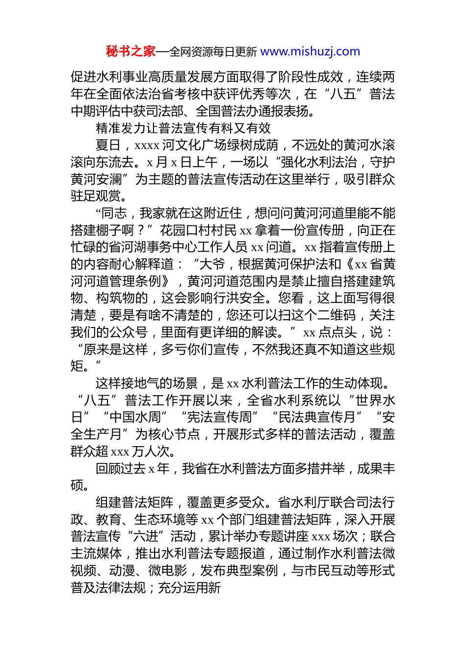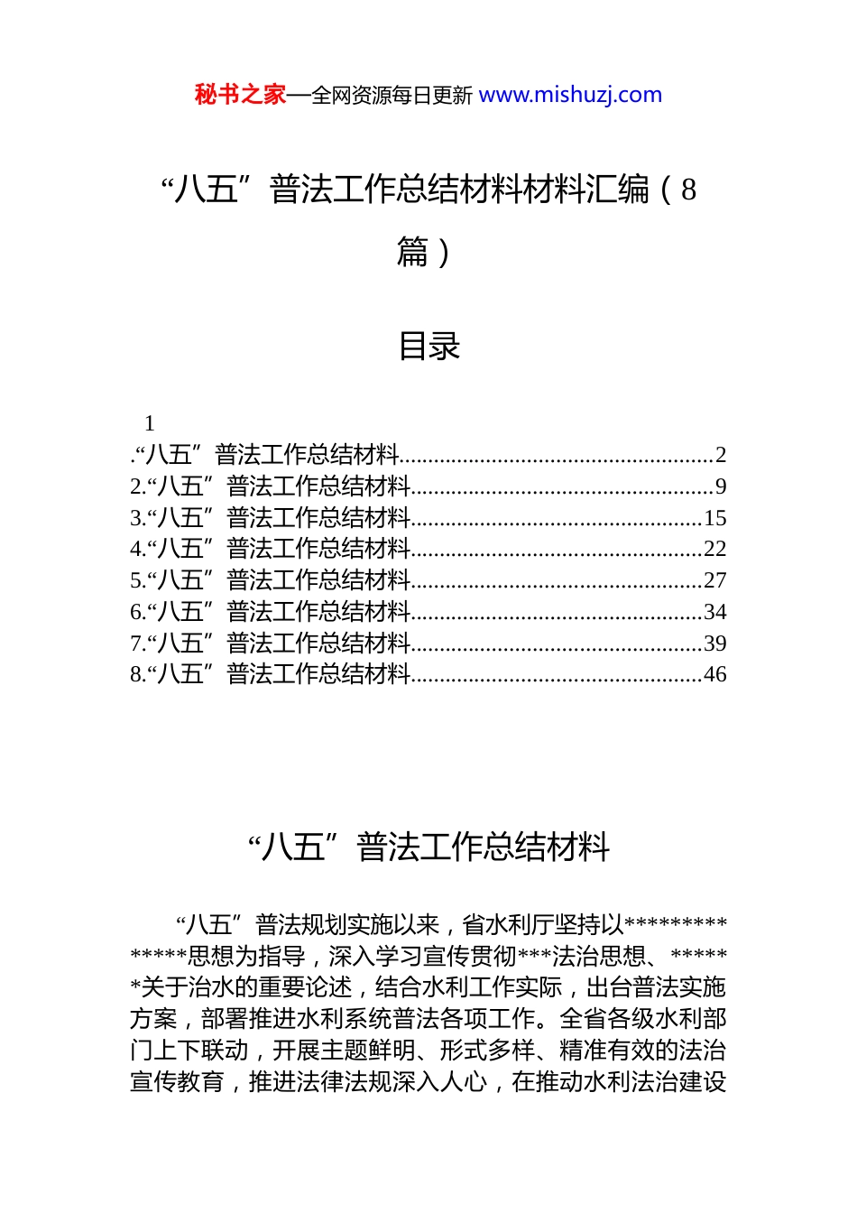 秘书之家—全网资源每日更新 www.mishuzj.com“八五”普法工作总结材料材料汇编(8篇)目录1.“八五”普法工作总结材料......................................................22.“八五”普法工作总结材料....................................................93.“八五”普法工作总结材料..................................................154.“八五”普法工作总结材料..................................................225.“八五”普法工作总结材料..................................................276.“八五”普法工作总结材料..................................................347.“八五”普法工作总结材料..................................................398.“八五”普法工作总结材料..................................................46“八五”普法工作总结材料“八五”普法规划实施以来,省水利厅坚持以**************思想为指导,深入学习宣传贯彻***法治思想、******关于治水的重要论述,结合水利工作实际,出台普法实施方案,部署推进水利系统普法各项工作。全省各级水利部门上下联动,开展主题鲜明、形式多样、精准有效的法治宣传教育,推进法律法规深入人心,在推动水利法治建设秘书之家—全网资源每日更新 www.mishuzj.com促进水利事业高质量发展方面取得了阶段性成效,连续两年在全面依法治省考核中获评优秀等次,在“八五”普法中期评估中获司法部、全国普法办通报表扬。精准发力让普法宣传有料又有效夏日,xxxx 河文化广场绿树成荫,不远处的黄河水滚滚向东流去。x 月 x 日上午,一场以“强化水利法治,守护黄河安澜”为主题的普法宣传活动在这里举行,吸引群众驻足观赏。“同志,我家就在这附近住,想问问黄河河道里能不能搭建棚子啊?”花园口村村民 xx 拿着一份宣传册,向正在忙碌的省河湖事务中心工作人员 xx 问道。xx 指着宣传册上的内容耐心解释道:“大爷,根据黄河保护法和《xx 省黄河河道管理条例》,黄河河道范围内是禁止擅自搭建建筑物、构筑物的,这会影响行洪安全。您看,这上面写得很清楚,要是有啥不清楚的,您还可以扫这个二维码,关注我们的公众号,里面有更详细的解读。”xx 点点头,说:“原来是这样,多亏你们宣传,不然我还真不知道这些规矩。”这样接地气的场景,是 xx 水利普法工作的生动体现。“八五”普法工作开展以来,全省水利系统以“世界水日”“中国水周”“宪法宣传周”“民法典宣传月”“安全生产月”为核心节点,开展形式多样的普法活动,覆盖群众超 xxx 万人次。回顾过去 x 年,我省在水利普法方面多措并举,成果丰硕。组建普法矩阵,覆盖更多受众。省水利厅联合司法行政、教育、生态环境等 xx 个部门组建普法矩阵,深入开展普法宣传“六进”活动,累计举办专题讲座 xxx 场次;联合主流媒体,推出水利普法专题报道,通过制作水利普法微视频、动漫、微电影,发布典型案例,与市民互动等形式普及法律法规;充分运用新秘书之家—全网资源每日更新 www.mishuzj.com媒体、新技术,建设集“报、网、端、微、屏”于一体的全媒体水利法治传播体系。省水利厅建设“一网两微多端”矩阵平台,在官网专栏定期发布法律法规、政策解读、典型案例等权威信息,“水兴中原”“豫水清风”微信公众号定期发布相关宣传文章。打造普法品牌,法规精准抵达。省水利厅着力围绕“世界水日”“中国水周”培育普法品牌,采用多种宣传方式,让群众“懂水法、守水规”,主动参与水资源保护今年“世界水日”“中国水周”期间,省水利厅开展集中宣传活动,并通过 xx 日报、xx 法治报等媒体开展全媒体宣传。其间,该厅在省级媒体发布图文消息、新媒体音视频作品 xxx 条,全网浏览量超千万。x 月 xx 日,省水利厅在xx 紫荆广场举行大型主题宣传活动,吸引万余名市民学法。此外,省水利厅还积极推进水利法治宣传教育基地建设,携手相关部门,打造 xx 黄河法治文化带和南水北调法治文化带两条特色法治宣传带,建成 xx 处省级水情教育基地,目前已接待群众超 xx 万人次。省水利厅通过持续开展普法教...