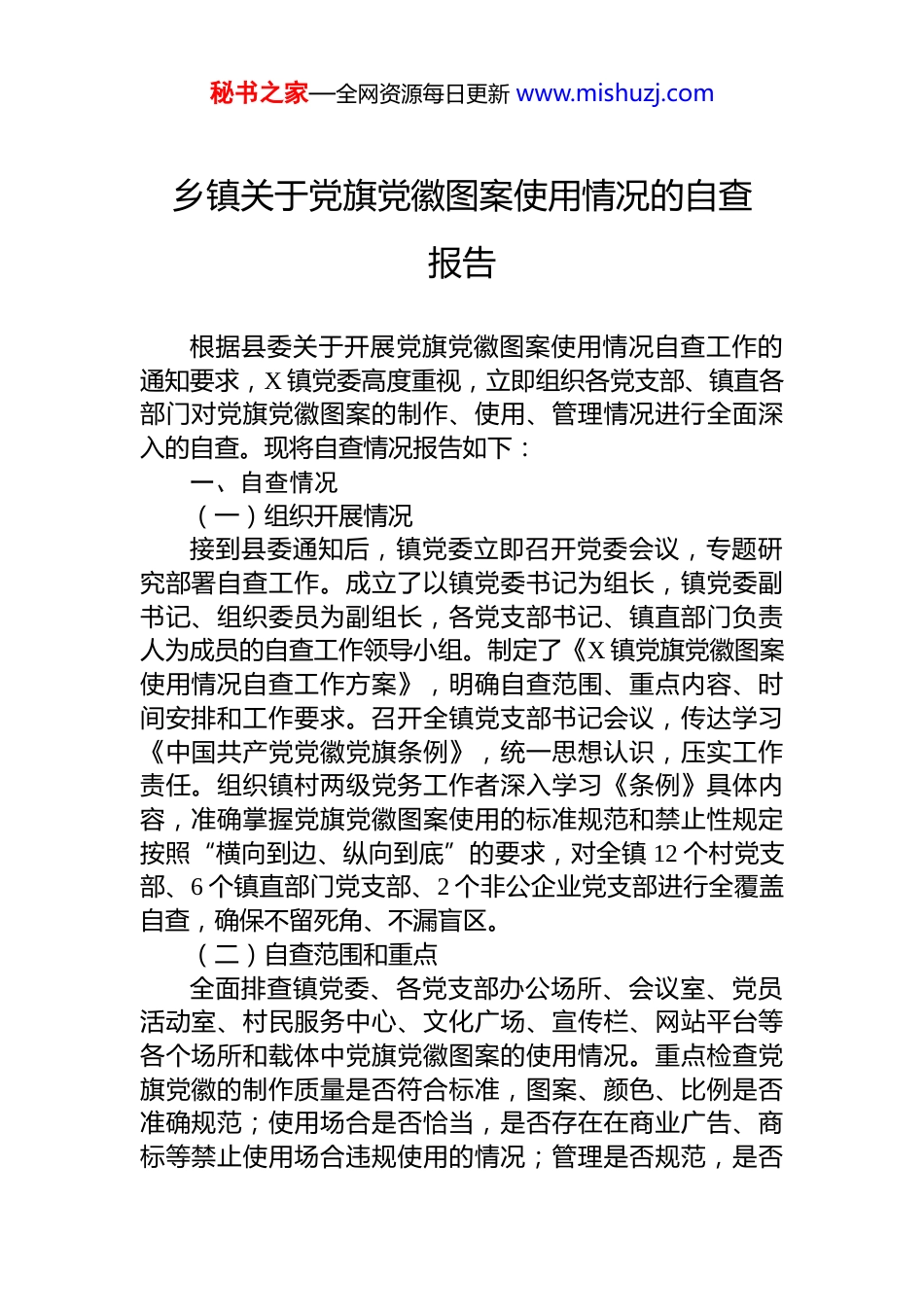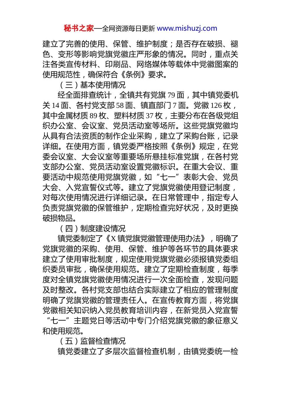 秘书之家—全网资源每日更新 www.mishuzj.com乡镇关于党旗党徽图案使用情况的自查报告根据县委关于开展党旗党徽图案使用情况自查工作的通知要求,X 镇党委高度重视,立即组织各党支部、镇直各部门对党旗党徽图案的制作、使用、管理情况进行全面深入的自查。现将自查情况报告如下:一、自查情况(一)组织开展情况接到县委通知后,镇党委立即召开党委会议,专题研究部署自查工作。成立了以镇党委书记为组长,镇党委副书记、组织委员为副组长,各党支部书记、镇直部门负责人为成员的自查工作领导小组。制定了《X 镇党旗党徽图案使用情况自查工作方案》,明确自查范围、重点内容、时间安排和工作要求。召开全镇党支部书记会议,传达学习《中国共产党党徽党旗条例》,统一思想认识,压实工作责任。组织镇村两级党务工作者深入学习《条例》具体内容,准确掌握党旗党徽图案使用的标准规范和禁止性规定按照“横向到边、纵向到底”的要求,对全镇 12 个村党支部、6 个镇直部门党支部、2 个非公企业党支部进行全覆盖自查,确保不留死角、不漏盲区。(二)自查范围和重点全面排查镇党委、各党支部办公场所、会议室、党员活动室、村民服务中心、文化广场、宣传栏、网站平台等各个场所和载体中党旗党徽图案的使用情况。重点检查党旗党徽的制作质量是否符合标准,图案、颜色、比例是否准确规范;使用场合是否恰当,是否存在在商业广告、商标等禁止使用场合违规使用的情况;管理是否规范,是否秘书之家—全网资源每日更新 www.mishuzj.com建立了完善的使用、保管、维护制度;是否存在破损、褪色、变形等影响党旗党徽庄严形象的情况。同时,重点关注各类宣传材料、印刷品、网络媒体等载体中党徽图案的使用规范性,确保符合《条例》要求。(三)基本使用情况经全面排查统计,全镇共有党旗 79 面,其中镇党委机关 14 面、各村党支部 58 面、镇直部门 7 面。党徽 126 枚,其中金属材质 89 枚、塑料材质 37 枚,主要分布在各级党组织办公室、会议室、党员活动室等场所。这些党旗党徽均从具有合法资质的制作企业采购,建立了采购台账,记录详细。在使用方面,镇党委严格按照《条例》规定,在党委会议室、大会议室等重要场所悬挂标准党旗,在各村党支部办公室、党员活动室设置党徽标识。在重大会议、重要活动中规范使用党旗党徽,如“七一”表彰大会、党员大会、入党宣誓仪式等。建立了党旗党徽使用登记制度,对每次使用情况进行详细记录。在日常管理中,指定专人负责党旗党徽的保管维护,定期检查完好状况,及时更换破损物品。(四)制度建设情况镇党委制定了《X 镇党旗党徽管理使用办法》,明确了党旗党徽的采购、使用、保管、维护等各环节的具体要求建立了使用审批制度,规定使用党旗党徽必须报镇党委组织委员审批,确保使用规范。建立了定期检查制度,每季度对全镇党旗党徽使用情况进行一次全面检查,发现问题及时整改。各村党支部也结合实际建立了相应的管理制度明确了党旗党徽的管理责任人。在宣传教育方面,将党旗党徽相关知识纳入党员教育培训内容,在新党员入党宣誓“七一”主题党日等活动中专门介绍党旗党徽的象征意义和使用规范。(五)监督检查情况镇党委建立了多层次监督检查机制,由镇党委统一检秘书之家—全网资源每日更新 www.mishuzj.com查,各党支部相互监督,党员群众共同监督。将党旗党徽使用情况纳入基层党建工作考核内容,与村级党组织星级评定挂钩。建立了问题发现和整改机制,对检查中发现的问题建立台账,限期整改,跟踪问效。同时,通过镇政府网站、微信公众号等平台公布监督举报电话,接受社会监督。近三年来,共开展专项检查 6 次,发现并整改各类问题15 个,有效规范了党旗党徽的使用管理。二、存在的问题(一)部分党旗党徽存在质量问题通过深入自查发现,部分村级党组织使用的党旗党徽存在质量问题。X 村党支部活动室悬挂的党旗因使用时间较长,出现明显褪色现象,红色变浅,影响了党旗的庄严形象。X 村党支部的党徽因材质较差,出现变形和掉色情况。X 村委会大厅的党旗尺寸与标准要求不符,比例失调。这些问题虽然数量不多,但反映出在采...