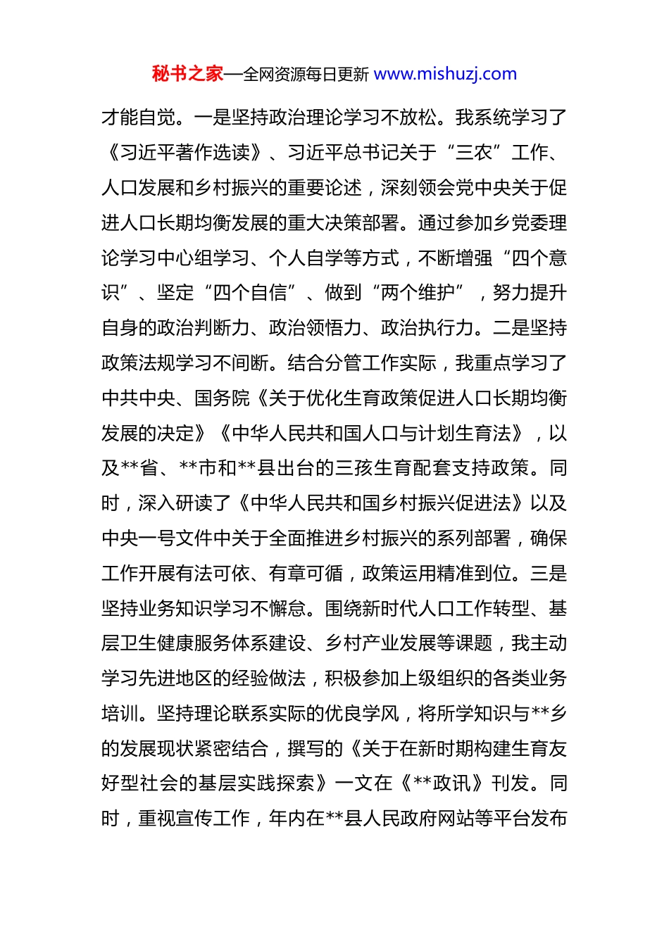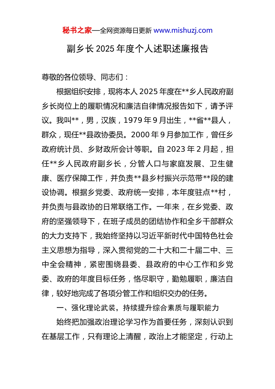 秘书之家—全网资源每日更新 www.mishuzj.com副乡长 2025 年度个人述职述廉报告 尊敬的各位领导、同志们:根据组织安排,现将本人 2025 年度在**乡人民政府副乡长岗位上的履职情况和廉洁自律情况报告如下,请予评议。我叫**,男,汉族,1979 年 9 月出生,**省**县人,群众,现任**县政协委员。2000 年 9 月参加工作,曾任乡政府统计员、乡财政所会计等职。自 2023 年 2 月起,担任**乡人民政府副乡长,分管人口与家庭发展、卫生健康、医疗保障工作,并负责**县乡村振兴示范带**段的建设协调。根据乡党委、政府统一安排,本年度驻点**村,并负责与县政协的日常联络工作。一年来,在乡党委、政府的坚强领导下,在班子成员的团结协作和全乡干部群众的大力支持下,我始终坚持以习近平新时代中国特色社会主义思想为指导,深入贯彻党的二十大和二十届二中、三中全会精神,紧密围绕县委、县政府的中心工作和乡党委、政府的年度目标任务,恪尽职守,勤勉履职,廉洁自律,较好地完成了各项分管工作和组织交办的任务。一、强化理论武装,持续提升综合素质与履职能力始终把加强政治理论学习作为首要任务,深刻认识到在基层工作,只有理论上清醒,政治上才能坚定,行动上秘书之家—全网资源每日更新 www.mishuzj.com才能自觉。一是坚持政治理论学习不放松。我系统学习了《习近平著作选读》、习近平总书记关于“三农”工作、人口发展和乡村振兴的重要论述,深刻领会党中央关于促进人口长期均衡发展的重大决策部署。通过参加乡党委理论学习中心组学习、个人自学等方式,不断增强“四个意识”、坚定“四个自信”、做到“两个维护”,努力提升自身的政治判断力、政治领悟力、政治执行力。二是坚持政策法规学习不间断。结合分管工作实际,我重点学习了中共中央、国务院《关于优化生育政策促进人口长期均衡发展的决定》《中华人民共和国人口与计划生育法》,以及**省、**市和**县出台的三孩生育配套支持政策。同时,深入研读了《中华人民共和国乡村振兴促进法》以及中央一号文件中关于全面推进乡村振兴的系列部署,确保工作开展有法可依、有章可循,政策运用精准到位。三是坚持业务知识学习不懈怠。围绕新时代人口工作转型、基层卫生健康服务体系建设、乡村产业发展等课题,我主动学习先进地区的经验做法,积极参加上级组织的各类业务培训。坚持理论联系实际的优良学风,将所学知识与**乡的发展现状紧密结合,撰写的《关于在新时期构建生育友好型社会的基层实践探索》一文在《**政讯》刊发。同时,重视宣传工作,年内在**县人民政府网站等平台发布秘书之家—全网资源每日更新 www.mishuzj.com我乡在乡村振兴、民生服务等方面的工作动态信息 11 条,有效提升了**乡的正面形象和影响力。二、聚焦主责主业,全力推动分管领域工作开创新局面我始终坚持“一线工作法”,将主要精力投入到分管领域和驻村工作中,力求察实情、出实招、办实事、求实效。(一)人口与家庭发展工作实现新转型。面对我国人口发展的新常态,我深刻认识到当前人口工作的核心已从过去的数量控制全面转向优化结构、提升素质和构建生育支持政策体系。一年来,我带领分管部门,着力推动工作重心从“管理”向“服务”的根本性转变。精准落实积极生育支持政策。积极响应国家实施三孩生育政策及配套支持措施的号召,牵头制定并实施了《**乡关于优化生育政策促进人口均衡发展的若干措施》。工作重点不再是征收社会抚养费等制约措施而是转向提供全方位的家庭服务。我们简化了生育登记流程,实现了网上办、掌上办。联合乡工会、妇联等部门,大力宣传普及育儿补贴、个税减免、延长产假等优惠政策。截至目前,全乡累计为 86 个新生儿家庭提供了生育咨询服务,协助 15 个符合条件的家庭申请了共计 7.5 万元的育儿补贴。大力发展普惠托育服务秘书之家—全网资源每日更新 www.mishuzj.com体系。“幼有所育”是降低生育、养育成本的关键环节。我多次组织对全乡婴幼儿托育需求进行摸底调研,形成专题报告提交乡党委、政府决策。通过盘活利用**村闲置的旧村部、整合社会资本等方式,成功推动了**乡首个普惠性托育服务点“...