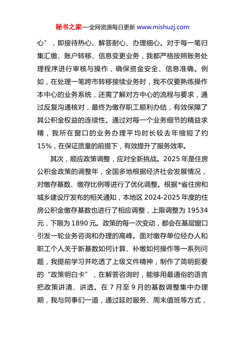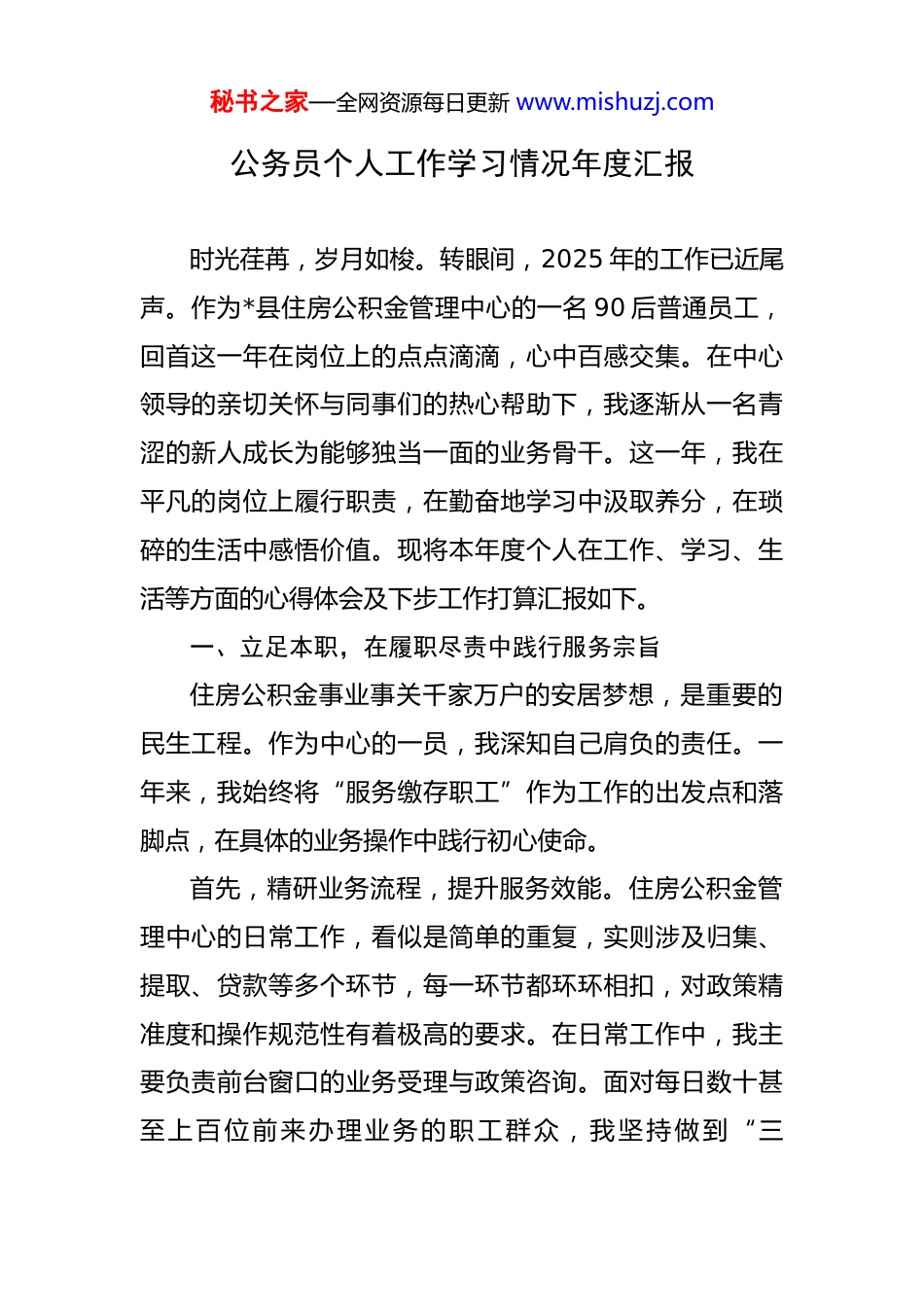 秘书之家—全网资源每日更新 www.mishuzj.com公务员个人工作学习情况年度汇报 时光荏苒,岁月如梭。转眼间,2025 年的工作已近尾声。作为*县住房公积金管理中心的一名 90 后普通员工,回首这一年在岗位上的点点滴滴,心中百感交集。在中心领导的亲切关怀与同事们的热心帮助下,我逐渐从一名青涩的新人成长为能够独当一面的业务骨干。这一年,我在平凡的岗位上履行职责,在勤奋地学习中汲取养分,在琐碎的生活中感悟价值。现将本年度个人在工作、学习、生活等方面的心得体会及下步工作打算汇报如下。一、立足本职,在履职尽责中践行服务宗旨住房公积金事业事关千家万户的安居梦想,是重要的民生工程。作为中心的一员,我深知自己肩负的责任。一年来,我始终将“服务缴存职工”作为工作的出发点和落脚点,在具体的业务操作中践行初心使命。首先,精研业务流程,提升服务效能。住房公积金管理中心的日常工作,看似是简单的重复,实则涉及归集、提取、贷款等多个环节,每一环节都环环相扣,对政策精准度和操作规范性有着极高的要求。在日常工作中,我主要负责前台窗口的业务受理与政策咨询。面对每日数十甚至上百位前来办理业务的职工群众,我坚持做到“三秘书之家—全网资源每日更新 www.mishuzj.com心”,即接待热心、解答耐心、办理细心。对于每一笔归集汇缴、账户转移、信息变更业务,我都严格按照账务处理程序进行审核与操作,确保资金安全、信息准确。例如,在处理一笔跨市转移接续业务时,我不仅要熟练操作本中心的业务系统,还需了解对方中心的流程与要求,通过反复沟通核对,最终为缴存职工顺利办结,有效保障了其公积金权益的连续性。通过对每一个业务细节的精益求精,我所在窗口的业务办理平均时长较去年缩短了约15%,在保证质量的前提下,有效提升了服务效率。其次,顺应政策调整,应对全新挑战。2025 年是住房公积金政策的调整年,全国多地根据经济社会发展情况,对缴存基数、缴存比例等进行了优化调整。根据*省住房和城乡建设厅发布的相关通知,本地区 2024-2025 年度的住房公积金缴存基数也进行了相应调整,上限调整为 19534元,下限为 1890 元。政策的每一次变动,都会在基层窗口引发一轮业务咨询和办理的高峰。面对缴存单位经办人和职工个人关于新基数如何计算、补缴如何操作等一系列问题,我提前学习并吃透了上级文件精神,制作了简明扼要的“政策明白卡”,在解答咨询时,能够用最通俗的语言把政策讲清、讲透。在 7 月至 9 月的基数调整集中办理期,我与同事们一道,通过延时服务、周末值班等方式,秘书之家—全网资源每日更新 www.mishuzj.com累计为超过 400 家单位、近万名职工办理了年度基数调整业务,确保了政策的平稳落地,未发生一起因解释不清或操作失误导致的投诉事件。再者,拥抱数字变革,助力智慧服务。近年来,中心大力推进数字化转型,“一网通办”“跨省通办”等线上服务渠道不断完善。作为伴随互联网成长起来的 90 后,我对新技术、新平台有着天然的亲近感和学习热情。我主动学习各类线上业务平台的办理流程,并积极在窗口引导和辅导年轻职工通过手机 APP 办理提取、查询等业务。据不完全统计,经我引导完成线上办理的业务占我个人总业务量的比例,已从年初的不足 10%提升至目前的近 40%。这不仅减轻了窗口的排队压力,更让缴存职工切身感受到了“数据多跑路,群众少跑腿”的便捷。我深刻体会到,数字化不仅是技术工具的革新,更是服务理念的升华。二、勤学善思,在知行合一中实现自我成长身处日新月异的时代,面对不断更新的政策法规和持续升级的业务系统,我深感“本领恐慌”,始终把学习作为一种政治责任、一种精神追求和一种生活方式。一是强化理论武装,筑牢思想根基。我认识到,作为一名身处公共服务一线的青年职工,必须具备过硬的政治素养。为此,我积极参加中心组织的各项政治理论学习活秘书之家—全网资源每日更新 www.mishuzj.com动,深入学习党的基本理论和路线方针政策,特别是关于保障和改善民生的重要论述,不断提高自己的政治判断力、政治领悟力、政治执行力。通过学习,我更加深刻地理解了住房公积金制...