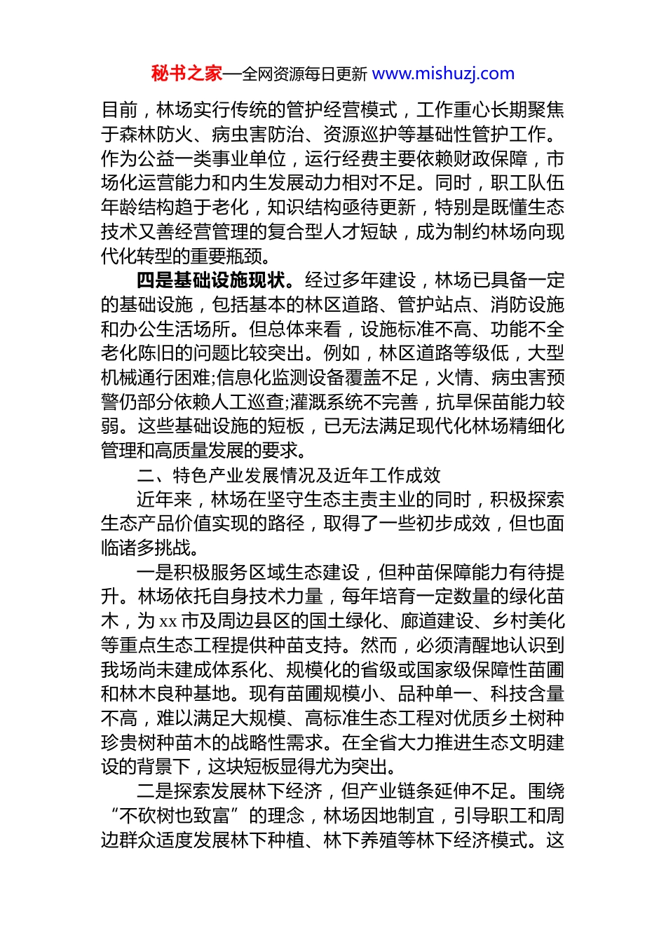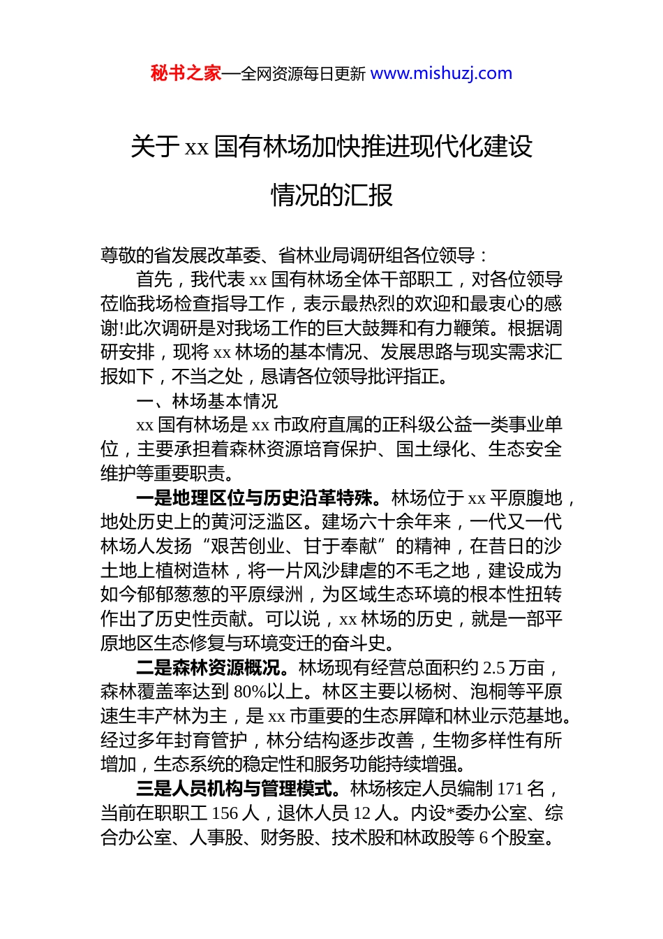 秘书之家—全网资源每日更新 www.mishuzj.com关于 xx 国有林场加快推进现代化建设情况的汇报尊敬的省发展改革委、省林业局调研组各位领导:首先,我代表 xx 国有林场全体干部职工,对各位领导莅临我场检查指导工作,表示最热烈的欢迎和最衷心的感谢!此次调研是对我场工作的巨大鼓舞和有力鞭策。根据调研安排,现将 xx 林场的基本情况、发展思路与现实需求汇报如下,不当之处,恳请各位领导批评指正。一、林场基本情况xx 国有林场是 xx 市政府直属的正科级公益一类事业单位,主要承担着森林资源培育保护、国土绿化、生态安全维护等重要职责。一是地理区位与历史沿革特殊。林场位于 xx 平原腹地,地处历史上的黄河泛滥区。建场六十余年来,一代又一代林场人发扬“艰苦创业、甘于奉献”的精神,在昔日的沙土地上植树造林,将一片风沙肆虐的不毛之地,建设成为如今郁郁葱葱的平原绿洲,为区域生态环境的根本性扭转作出了历史性贡献。可以说,xx 林场的历史,就是一部平原地区生态修复与环境变迁的奋斗史。二是森林资源概况。林场现有经营总面积约 2.5 万亩,森林覆盖率达到 80%以上。林区主要以杨树、泡桐等平原速生丰产林为主,是 xx 市重要的生态屏障和林业示范基地。经过多年封育管护,林分结构逐步改善,生物多样性有所增加,生态系统的稳定性和服务功能持续增强。三是人员机构与管理模式。林场核定人员编制 171 名,当前在职职工 156 人,退休人员 12 人。内设*委办公室、综合办公室、人事股、财务股、技术股和林政股等 6 个股室。秘书之家—全网资源每日更新 www.mishuzj.com目前,林场实行传统的管护经营模式,工作重心长期聚焦于森林防火、病虫害防治、资源巡护等基础性管护工作。作为公益一类事业单位,运行经费主要依赖财政保障,市场化运营能力和内生发展动力相对不足。同时,职工队伍年龄结构趋于老化,知识结构亟待更新,特别是既懂生态技术又善经营管理的复合型人才短缺,成为制约林场向现代化转型的重要瓶颈。四是基础设施现状。经过多年建设,林场已具备一定的基础设施,包括基本的林区道路、管护站点、消防设施和办公生活场所。但总体来看,设施标准不高、功能不全老化陈旧的问题比较突出。例如,林区道路等级低,大型机械通行困难;信息化监测设备覆盖不足,火情、病虫害预警仍部分依赖人工巡查;灌溉系统不完善,抗旱保苗能力较弱。这些基础设施的短板,已无法满足现代化林场精细化管理和高质量发展的要求。二、特色产业发展情况及近年工作成效近年来,林场在坚守生态主责主业的同时,积极探索生态产品价值实现的路径,取得了一些初步成效,但也面临诸多挑战。一是积极服务区域生态建设,但种苗保障能力有待提升。林场依托自身技术力量,每年培育一定数量的绿化苗木,为 xx 市及周边县区的国土绿化、廊道建设、乡村美化等重点生态工程提供种苗支持。然而,必须清醒地认识到我场尚未建成体系化、规模化的省级或国家级保障性苗圃和林木良种基地。现有苗圃规模小、品种单一、科技含量不高,难以满足大规模、高标准生态工程对优质乡土树种珍贵树种苗木的战略性需求。在全省大力推进生态文明建设的背景下,这块短板显得尤为突出。二是探索发展林下经济,但产业链条延伸不足。围绕“不砍树也致富”的理念,林场因地制宜,引导职工和周边群众适度发展林下种植、林下养殖等林下经济模式。这秘书之家—全网资源每日更新 www.mishuzj.com种模式在增加职工收入、带动地方就业方面起到了一定作用。但总体上仍处于初级阶段,呈现出“散、小、弱”的特点,缺乏统一规划和品牌化运作,多以出售初级农产品为主,深加工程度低,产业链短,产品附加值不高,尚未形成能够支撑林场经济发展的支柱性产业。三是成功培育特色品牌,示范效应初步显现。林场最大的亮点和成功实践,是通过多年的科研攻关和定向培育成功选育出“xx1 号无絮杨”这一优良树种。该品种具有速生、抗病、材质优良且春季不飞絮的显著优点,有效解决了长期困扰城乡绿化的杨絮污染问题,在市场上广受欢迎通过与地方企业合作推广、订单育苗等方式,不仅创造了可观的经济效益,更成功打造了...