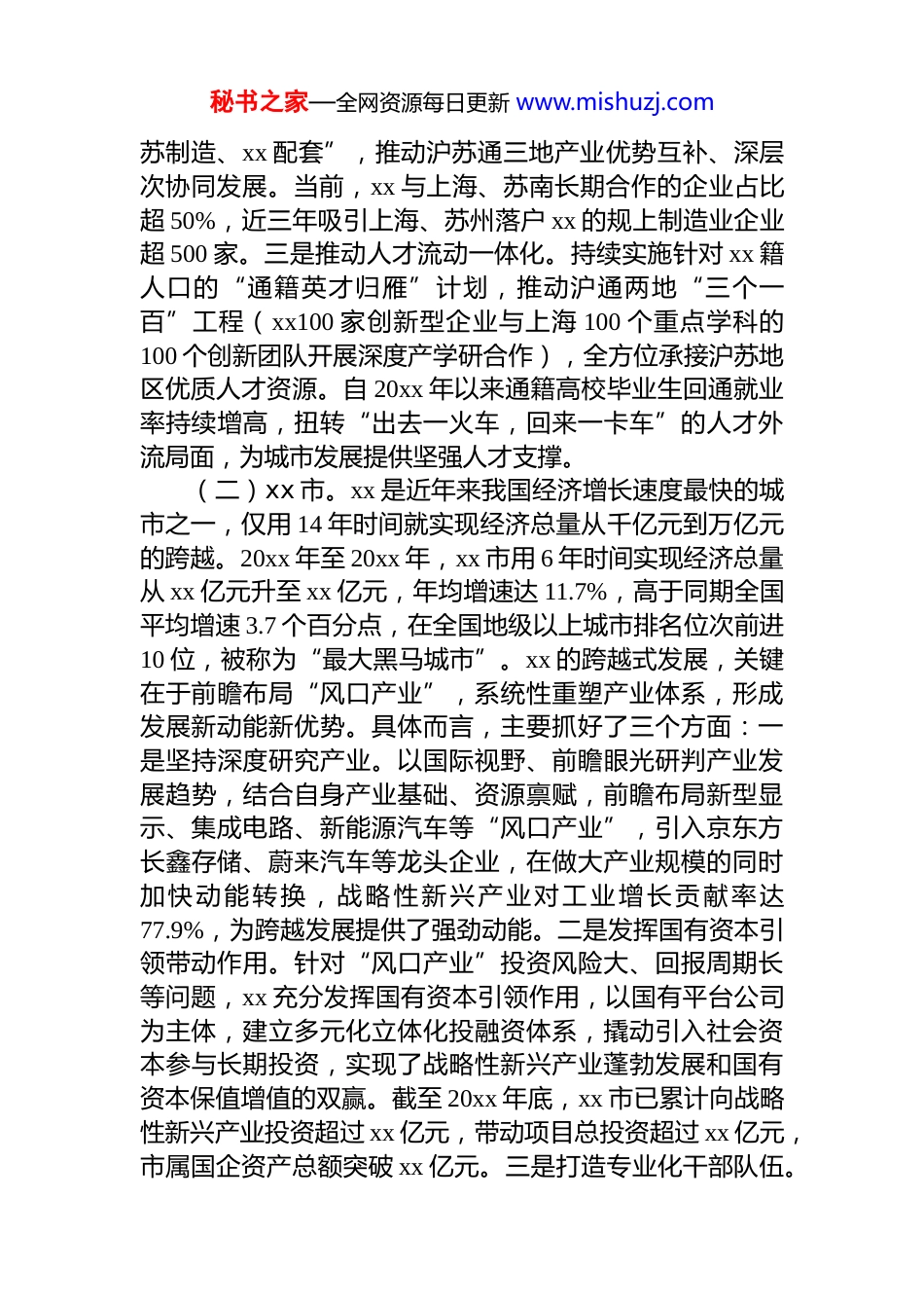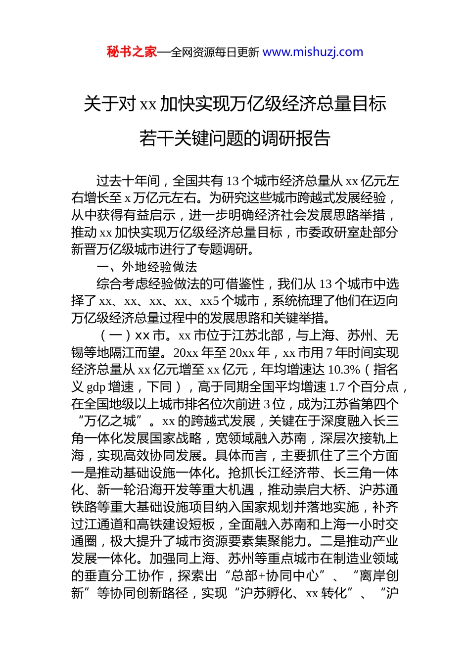 秘书之家—全网资源每日更新 www.mishuzj.com关于对 xx 加快实现万亿级经济总量目标若干关键问题的调研报告过去十年间,全国共有 13 个城市经济总量从 xx 亿元左右增长至 x 万亿元左右。为研究这些城市跨越式发展经验,从中获得有益启示,进一步明确经济社会发展思路举措,推动 xx 加快实现万亿级经济总量目标,市委政研室赴部分新晋万亿级城市进行了专题调研。一、外地经验做法综合考虑经验做法的可借鉴性,我们从 13 个城市中选择了 xx、xx、xx、xx、xx5 个城市,系统梳理了他们在迈向万亿级经济总量过程中的发展思路和关键举措。(一)xx 市。xx 市位于江苏北部,与上海、苏州、无锡等地隔江而望。20xx 年至 20xx 年,xx 市用 7 年时间实现经济总量从 xx 亿元增至 xx 亿元,年均增速达 10.3%(指名义 gdp 增速,下同),高于同期全国平均增速 1.7 个百分点,在全国地级以上城市排名位次前进 3 位,成为江苏省第四个“万亿之城”。xx 的跨越式发展,关键在于深度融入长三角一体化发展国家战略,宽领域融入苏南,深层次接轨上海,实现高效协同发展。具体而言,主要抓住了三个方面一是推动基础设施一体化。抢抓长江经济带、长三角一体化、新一轮沿海开发等重大机遇,推动崇启大桥、沪苏通铁路等重大基础设施项目纳入国家规划并落地实施,补齐过江通道和高铁建设短板,全面融入苏南和上海一小时交通圈,极大提升了城市资源要素集聚能力。二是推动产业发展一体化。加强同上海、苏州等重点城市在制造业领域的垂直分工协作,探索出“总部+协同中心”、“离岸创新”等协同创新路径,实现“沪苏孵化、xx 转化”、“沪秘书之家—全网资源每日更新 www.mishuzj.com苏制造、xx 配套”,推动沪苏通三地产业优势互补、深层次协同发展。当前,xx 与上海、苏南长期合作的企业占比超 50%,近三年吸引上海、苏州落户 xx 的规上制造业企业超 500 家。三是推动人才流动一体化。持续实施针对 xx 籍人口的“通籍英才归雁”计划,推动沪通两地“三个一百”工程(xx100 家创新型企业与上海 100 个重点学科的100 个创新团队开展深度产学研合作),全方位承接沪苏地区优质人才资源。自 20xx 年以来通籍高校毕业生回通就业率持续增高,扭转“出去一火车,回来一卡车”的人才外流局面,为城市发展提供坚强人才支撑。(二)xx 市。xx 是近年来我国经济增长速度最快的城市之一,仅用 14 年时间就实现经济总量从千亿元到万亿元的跨越。20xx 年至 20xx 年,xx 市用 6 年时间实现经济总量从 xx 亿元升至 xx 亿元,年均增速达 11.7%,高于同期全国平均增速 3.7 个百分点,在全国地级以上城市排名位次前进10 位,被称为“最大黑马城市”。xx 的跨越式发展,关键在于前瞻布局“风口产业”,系统性重塑产业体系,形成发展新动能新优势。具体而言,主要抓好了三个方面:一是坚持深度研究产业。以国际视野、前瞻眼光研判产业发展趋势,结合自身产业基础、资源禀赋,前瞻布局新型显示、集成电路、新能源汽车等“风口产业”,引入京东方长鑫存储、蔚来汽车等龙头企业,在做大产业规模的同时加快动能转换,战略性新兴产业对工业增长贡献率达77.9%,为跨越发展提供了强劲动能。二是发挥国有资本引领带动作用。针对“风口产业”投资风险大、回报周期长等问题,xx 充分发挥国有资本引领作用,以国有平台公司为主体,建立多元化立体化投融资体系,撬动引入社会资本参与长期投资,实现了战略性新兴产业蓬勃发展和国有资本保值增值的双赢。截至 20xx 年底,xx 市已累计向战略性新兴产业投资超过 xx 亿元,带动项目总投资超过 xx 亿元,市属国企资产总额突破 xx 亿元。三是打造专业化干部队伍。秘书之家—全网资源每日更新 www.mishuzj.com将打造“懂科技、懂产业、懂资本、懂市场、懂管理”的干部队伍作为抓好“风口产业”的关键,领导干部带头研究行业报告、产业投融资政策等专业化知识,自上而下提升干部服务产业发展的能力。选派领导干部和业务骨干赴国家部委、高校院所、科研机构以及沪苏浙等先发地区学习,在帮助干部开阔视野、积累经验...