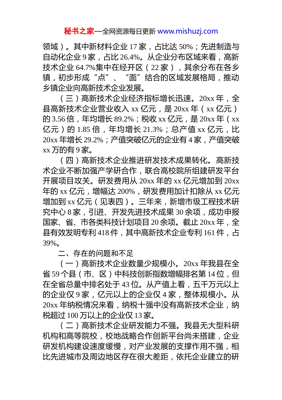秘书之家—全网资源每日更新 www.mishuzj.com关于高新技术企业发展的调研报告高新技术企业是企业创新能力的“认证”标志,也是衡量区域高质量发展和科技创新水平的重要指标。为助推我县高新技术企业发展,根据县政协 202x 年度工作要点安排,县政协教科卫体委员会在县政协副主席刘明的带领下组织调研组深入力峰建材、光华铝业、国电能源设备工程万华禾香板业、友坤玻璃等企业,通过听取汇报、实地查看、召开座谈会、到先进地区考察学习等形式,就高新技术企业发展工作进行深入调研。现将调研情况和委员的意见建议归纳整理,分送县领导及相关部门参阅。一、基本情况近年来,县政府把培育高新技术企业作为全面推动创新驱动发展战略的重要抓手,从政策引领、资金扶持、引进孵化等方面同向发力,高新技术企业总量迅速攀升,质量效益明显提升,高新技术企业已发展成为我县创新创业的主力军和高质量发展的领头羊。(一)高新技术企业培育发展成效明显。按照“储备一批、培育一批、认定一批”的工作思路,建立高新技术企业认定指导帮扶机制,实施“一企一策”,精准培育,高位推进高企“倍增”计划。截至 20xx 年 6 月,全县高新技术企业 34 户(见附件表一),其中 20xx 年认定 9 户,2xx 年认定 11 户,20xx 年认定 14 户,增幅在一县三区位于前列,20xx 年已分两批次组织 24 家(见附件表二)申报高新技术企业(到期高企 9 家,新申报 15 家)。(二)高新技术企业初步形成辐射效应。从分布领域看,全县 34 家高新技术企业基本涵盖了国家重点支持的八大高新技术领域(涉及到生物与新医药、新材料、高技术服务、新能源与节能、资源与环境和先进制造与自动化 6 大秘书之家—全网资源每日更新 www.mishuzj.com领域)。其中新材料企业 17 家,占比达 50%;先进制造与自动化企业 9 家,占比 26.4%。从企业分布区域来看,高新技术企业 64.7%集中在经开区(22 家),其余分布在各乡镇,初步形成“点”、“面”结合的区域发展格局,推动乡镇企业向高新技术企业发展。(三)高新技术企业经济指标增长迅速。20xx 年,全县高新技术企业营业收入 xx 亿元,是 20xx 年(xx 亿元)的 3.56 倍,年均增长 89.2%;税收 xx 亿元,是 20xx 年(xx亿元)的 1.85 倍,年均增长 21.3%;总产值 xx 亿元,比20xx 年增长 29.2%;产值突破亿元的企业有 4 家,产值突破xx 万的有 9 家。(四)高新技术企业推进研发技术成果转化。高新技术企业不断加强产学研合作,联合高校院所组建研发平台开展项目攻关。研发费用从 20xx 年的 xx 亿元增加到 20xx年的 xx 亿元,增幅达 200%,研发费用加计扣除从 xx 亿元增加到 xx 亿元(见表四)。三年来,新增市级工程技术研究中心 8 家,引进、开发先进技术成果 30 余项,成功申报国家、省、市各类科技计划项目 20 余项。截止 20xx 年,全县有效发明专利 418 件,其中高新技术企业专利 161 件,占39%。二、存在的问题和不足(一)高新技术企业数量少规模小。20xx 年我县在全省 59 个县(市、区)中科技创新指数增幅排名第 14 位,但在全省总量中排名处于 43 位。从产值上看,五千万元以上的企业仅 9 家,亿元以上的企业仅 4 家,整体规模小。从20xx 年纳税情况来看,纳税十强中没有高新技术企业,纳税超过 100 万以上的企业仅 13 家。(二)高新技术企业研发能力不强。我县无大型科研机构和高等院校,校地战略合作创新平台尚未搭建,企业研发机构建设速度缓慢,对产业发展的支撑作用不强,相比先进城市及周边地区存在很大差距,依托企业建立的研秘书之家—全网资源每日更新 www.mishuzj.com发中心数量少且质量不高,工程技术研究中心仅有 11 家。调研反映,尽管近几年我县研发投入增幅很大,占 gdp 总量从 0.04%增加到 1.5%,但投入总量仍然不足,主要集中在海螺和金誉两家企业。中小型科技企业经济实力不强,缺乏研发投入所需的资金、人才、设备等创新资源,开发高新产品数量较少,难以产生竞争力。(三)高新技术人才资源严重缺乏。人才是企业技术创新的主体...