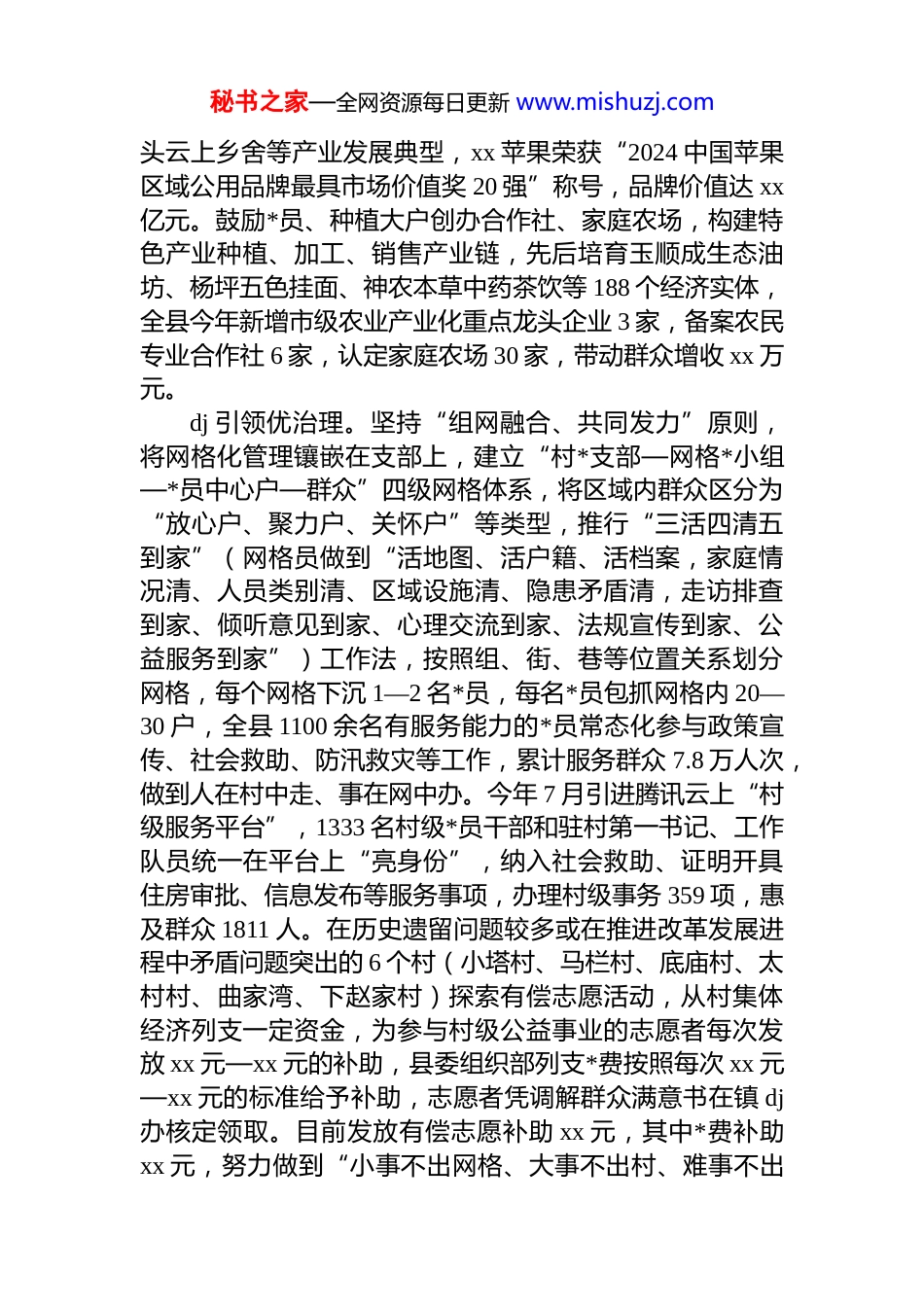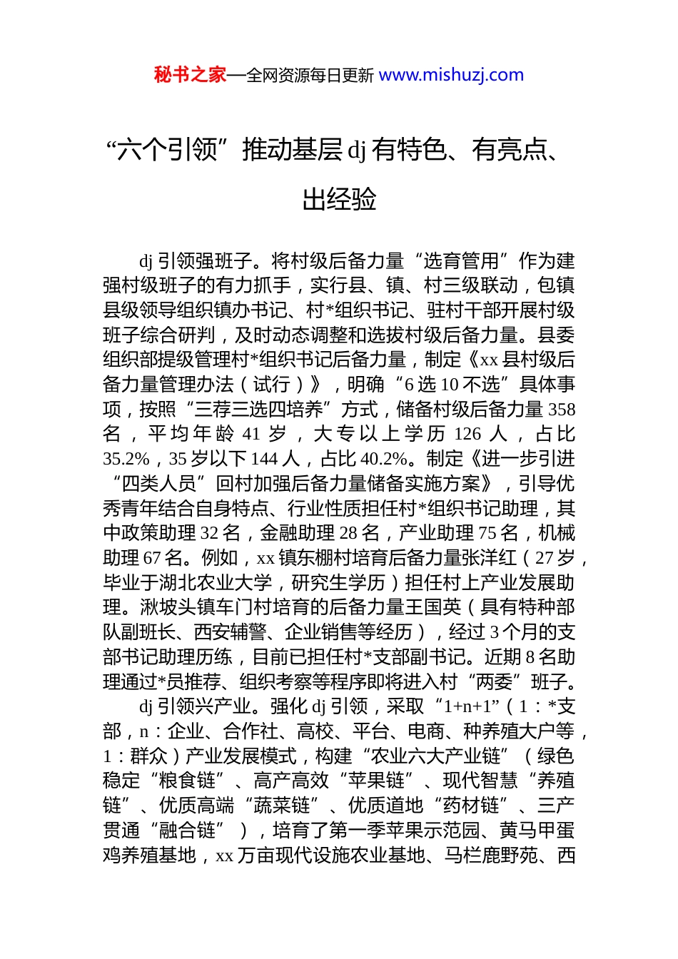 秘书之家—全网资源每日更新 www.mishuzj.com“六个引领”推动基层 dj 有特色、有亮点、出经验dj 引领强班子。将村级后备力量“选育管用”作为建强村级班子的有力抓手,实行县、镇、村三级联动,包镇县级领导组织镇办书记、村*组织书记、驻村干部开展村级班子综合研判,及时动态调整和选拔村级后备力量。县委组织部提级管理村*组织书记后备力量,制定《xx 县村级后备力量管理办法(试行)》,明确“6 选 10 不选”具体事项,按照“三荐三选四培养”方式,储备村级后备力量 358名 , 平 均 年 龄 41 岁 , 大 专 以 上 学 历 126 人 , 占 比35.2%,35 岁以下 144 人,占比 40.2%。制定《进一步引进“四类人员”回村加强后备力量储备实施方案》,引导优秀青年结合自身特点、行业性质担任村*组织书记助理,其中政策助理 32 名,金融助理 28 名,产业助理 75 名,机械助理 67 名。例如,xx 镇东棚村培育后备力量张洋红(27 岁,毕业于湖北农业大学,研究生学历)担任村上产业发展助理。湫坡头镇车门村培育的后备力量王国英(具有特种部队副班长、西安辅警、企业销售等经历),经过 3 个月的支部书记助理历练,目前已担任村*支部副书记。近期 8 名助理通过*员推荐、组织考察等程序即将进入村“两委”班子。dj 引领兴产业。强化 dj 引领,采取“1+n+1”(1:*支部,n:企业、合作社、高校、平台、电商、种养殖大户等,1:群众)产业发展模式,构建“农业六大产业链”(绿色稳定“粮食链”、高产高效“苹果链”、现代智慧“养殖链”、优质高端“蔬菜链”、优质道地“药材链”、三产贯通“融合链”),培育了第一季苹果示范园、黄马甲蛋鸡养殖基地,xx 万亩现代设施农业基地、马栏鹿野苑、西秘书之家—全网资源每日更新 www.mishuzj.com头云上乡舍等产业发展典型,xx 苹果荣获“2024 中国苹果区域公用品牌最具市场价值奖 20 强”称号,品牌价值达 xx亿元。鼓励*员、种植大户创办合作社、家庭农场,构建特色产业种植、加工、销售产业链,先后培育玉顺成生态油坊、杨坪五色挂面、神农本草中药茶饮等 188 个经济实体,全县今年新增市级农业产业化重点龙头企业 3 家,备案农民专业合作社 6 家,认定家庭农场 30 家,带动群众增收 xx 万元。dj 引领优治理。坚持“组网融合、共同发力”原则,将网格化管理镶嵌在支部上,建立“村*支部—网格*小组—*员中心户—群众”四级网格体系,将区域内群众区分为“放心户、聚力户、关怀户”等类型,推行“三活四清五到家”(网格员做到“活地图、活户籍、活档案,家庭情况清、人员类别清、区域设施清、隐患矛盾清,走访排查到家、倾听意见到家、心理交流到家、法规宣传到家、公益服务到家”)工作法,按照组、街、巷等位置关系划分网格,每个网格下沉 1—2 名*员,每名*员包抓网格内 20—30 户,全县 1100 余名有服务能力的*员常态化参与政策宣传、社会救助、防汛救灾等工作,累计服务群众 7.8 万人次,做到人在村中走、事在网中办。今年 7 月引进腾讯云上“村级服务平台”,1333 名村级*员干部和驻村第一书记、工作队员统一在平台上“亮身份”,纳入社会救助、证明开具住房审批、信息发布等服务事项,办理村级事务 359 项,惠及群众 1811 人。在历史遗留问题较多或在推进改革发展进程中矛盾问题突出的 6 个村(小塔村、马栏村、底庙村、太村村、曲家湾、下赵家村)探索有偿志愿活动,从村集体经济列支一定资金,为参与村级公益事业的志愿者每次发放 xx 元—xx 元的补助,县委组织部列支*费按照每次 xx 元—xx 元的标准给予补助,志愿者凭调解群众满意书在镇 dj办核定领取。目前发放有偿志愿补助 xx 元,其中*费补助xx 元,努力做到“小事不出网格、大事不出村、难事不出秘书之家—全网资源每日更新 www.mishuzj.com镇”。推广“群众点单、支部派单、*员接单、群众评单”模式,组织“五老”(老干部、老战士、老专家、老教师老劳模)人员对群众诉求“一对一”问诊,累计解决群众各类问题 5000 余件。选任离任*支部书记、乡贤及“五老”人员担任“四会”...