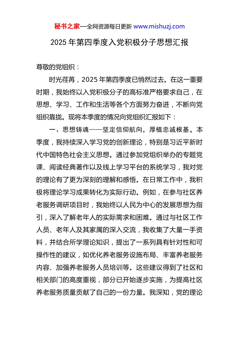 秘书之家—全网资源每日更新 www.mishuzj.com2025 年第四季度入党积极分子思想汇报 尊敬的党组织:时光荏苒,2025 年第四季度已悄然过去。在这一重要时期,我始终以入党积极分子的高标准严格要求自己,在思想、学习、工作和生活等各个方面努力奋进,不断向党组织靠拢。现将本季度的情况向党组织汇报如下:一、思想铸魂——坚定信仰航向,厚植忠诚根基。本季度,我持续深入学习党的创新理论,特别是习近平新时代中国特色社会主义思想。通过参加党组织举办的专题党课、阅读经典著作以及线上学习平台的系统学习,我对党的理论有了更为深刻的理解和感悟。在日常工作中,我积极将理论学习成果转化为实际行动。例如,在参与社区养老服务调研项目时,我始终以人民为中心的发展思想为指引,深入了解老年人的实际需求和困难。通过与社区工作人员、老年人及其家属的深入交流,我收集了大量一手资料,并结合所学理论知识,提出了一系列具有针对性和可操作性的建议,如优化养老服务设施布局、丰富养老服务内容、加强养老服务人员培训等。这些建议得到了社区和相关部门的高度重视,部分已开始逐步实施,为提高社区养老服务质量贡献了自己的一份力量。我深知,党的理论秘书之家—全网资源每日更新 www.mishuzj.com不仅要在工作中践行,更要在日常生活中传播。在与家人和朋友的交流中,我主动分享自己的学习心得和体会,宣传党的方针政策和国家的发展成就。通过生动的事例和深入浅出的讲解,让他们更加了解党的初心使命和责任担当,增强了他们对党的认同感和归属感。在社区组织的志愿服务活动中,我积极向居民宣传党的政策法规,解答他们的疑问,用实际行动传播党的声音,让党的理论深入人心。二、学习赋能——精进理论素养,提升业务本领。本季度,我将理论学习作为首要任务,坚持系统学习党的理论知识、政策法规以及与工作相关的专业知识。充分利用“学习强国”等线上学习平台,每日坚持学习,不断拓宽自己的知识面和视野。在业务学习方面,我聚焦于人力资源和社会保障领域的最新政策和法规。参加了市人社局组织的“人力资源管理高级研修班”,系统学习了人力资源规划、招聘与配置、培训与开发、绩效管理、薪酬福利管理等方面的专业知识。通过与专家学者的交流和研讨,我对人力资源管理的前沿理论和实践有了更深入的了解,进一步提升了自己的专业素养。为了将学习成果更好地应用到实际工作中,我建立了详细的学习笔记,定期总结学习心得和体会。将所学知识与实际工作中的问题相结合,进秘书之家—全网资源每日更新 www.mishuzj.com行深入分析和思考,不断探索解决问题的新方法和新途径。在单位组织的业务技能竞赛中,我凭借扎实的专业知识和熟练的业务技能,取得了优异的成绩,这不仅是对我学习成果的肯定,更是激励我继续努力学习的动力。我深刻认识到,在知识经济时代,只有不断学习、持续进步,才能跟上时代的步伐,更好地为人民服务。因此,我将继续保持学习的热情和积极性,不断提升自己的综合素质和业务能力。三、工作践行——坚守岗位初心,勇担时代使命。作为一名人力资源和社会保障局的工作人员,我始终牢记“为人民服务”的根本宗旨,在工作中尽职尽责,努力为群众办实事、解难题。在就业创业服务方面,我积极协助领导和同事开展各项工作。组织了多场招聘会,为企业和求职者搭建了沟通交流的平台。通过精准对接企业需求和求职者的技能特长,成功帮助了众多求职者实现就业。同时,为了鼓励创业,我积极宣传创业扶持政策,为有创业意愿的人员提供咨询和指导服务。本季度,共为[X]名创业者提供了创业培训和政策支持,帮助他们成功开启了创业之路。在社会保障工作中,我认真做好社保政策宣传和参保登记工作。深入社区、企业,向群众宣传社保政策的重要性和好处,提高群众的参保意识。积极协助群众办理参秘书之家—全网资源每日更新 www.mishuzj.com保手续,解决他们在参保过程中遇到的问题。同时,加强对社保基金的监管,确保社保基金的安全和稳定运行。在人才服务管理方面,我积极参与人才招聘、引进和培养工作。协助制定人才招聘计划,组织开展人才选拔和面试工作。为引进的高层...