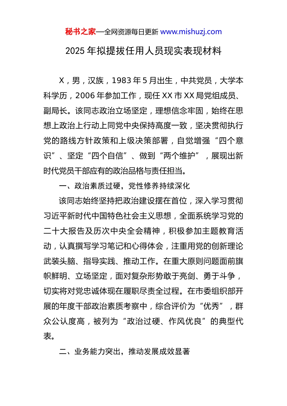 秘书之家—全网资源每日更新 www.mishuzj.com2025 年拟提拔任用人员现实表现材料 X,男,汉族,1983 年 5 月出生,中共党员,大学本科学历,2006 年参加工作,现任 XX 市 XX 局党组成员、副局长。该同志政治立场坚定,理想信念牢固,始终在思想上政治上行动上同党中央保持高度一致,坚决贯彻执行党的路线方针政策和上级决策部署,自觉增强“四个意识”、坚定“四个自信”、做到“两个维护”,展现出新时代党员干部应有的政治品格与责任担当。一、政治素质过硬,党性修养持续深化该同志始终坚持把政治建设摆在首位,深入学习贯彻习近平新时代中国特色社会主义思想,全面系统学习党的二十大报告及历次中央全会精神,积极参加主题教育活动,认真撰写学习笔记和心得体会,注重用党的创新理论武装头脑、指导实践、推动工作。在重大原则问题面前旗帜鲜明、立场坚定,面对复杂形势敢于亮剑、勇于斗争,切实将对党忠诚体现在履职尽责全过程。在市委组织部开展的年度干部政治素质考察中,综合评价为“优秀”,群众公认度高,被列为“政治过硬、作风优良”的典型代表。二、业务能力突出,推动发展成效显著秘书之家—全网资源每日更新 www.mishuzj.com作为分管经济运行与重点项目管理工作的局领导,该同志善于谋全局、抓重点、破难题,始终围绕中心大局履职尽责。2023 年以来,牵头推进全市重大项目建设提速增效行动,建立“周调度、月通报、季评估”工作机制,累计协调解决用地、环评、融资等瓶颈问题 17 项,推动纳入省重大项目库项目新增 24 个,年度投资完成率连续两年位居全省前列。特别是在推进智慧园区建设过程中,创新提出“平台+数据+服务”一体化模式,实现企业办事从“跑多次”到“一次办成”的转变,相关经验被《中国改革报》专题报道。2024 年,其所负责领域获评省级“优化营商环境先进集体”,充分彰显了攻坚克难的实干本领和改革创新的进取精神。三、工作作风扎实,群众观念根植于心该同志坚持人民至上理念,深入基层一线调研走访常态化,全年累计下基层调研超 80 天,足迹遍及 12 个乡镇、36 个行政村和 20 余家重点企业,面对面听取群众诉求,现场协调解决问题 40 余件。在推进农村人居环境整治工作中,主动包联薄弱村组,带领专班蹲点督导,推动完成改厕户数达 1.2 万户,建成村级污水处理站 5 座,村容村貌焕然一新,群众满意度提升至 96.8%。其提出的“民情直通车”机制,通过设立村级联络员、开通线上意见箱秘书之家—全网资源每日更新 www.mishuzj.com等方式,打通服务群众“最后一米”,被市委主要领导批示推广。四、廉洁自律严格,纪律规矩内化于行该同志始终严守党纪国法,严格执行纪律规定,带头落实“一岗双责”,加强对分管科室人员的廉政教育和日常监督。在资金使用、项目审批、人事任免等关键环节坚持原则、秉公办事,从未发生违规违纪行为。个人重大事项均按规定如实报告,生活简朴,作风正派,家庭关系和睦,社会交往清朗,未接到任何关于其廉洁方面的信访举报。在年度党风廉政建设责任制考核中连续三年被评为“优秀”,树立了清正廉洁的良好形象。五、团结协作高效,班子凝聚力不断增强该同志注重发挥团队合力,善于调动各方积极性,在班子内部坚持民主集中制原则,凡属重大事项均充分酝酿讨论,广泛征求意见,做到集思广益、科学决策。对待同事真诚友善,主动关心年轻干部成长,定期开展谈心谈话,帮助解决实际困难。在应对突发公共事件中,能够迅速响应、靠前指挥,展现出较强的组织协调能力和应急处突水平。所在部门连续三年获评“先进集体”,干部职工队伍士气高涨、风清气正。六、自我要求严格,综合素质全面提升秘书之家—全网资源每日更新 www.mishuzj.com该同志始终保持终身学习的紧迫感,积极参加高层次培训和专业研修,先后完成省委党校中青班学习、国家行政学院应急管理专题研修班课程,系统提升政策把握力、战略思维力和综合研判力。坚持读原著、学原文、悟原理,撰写的多篇调研报告被市委办公厅采用并报送省委参阅,其中《关于县域经济高质量发展的路径探索》获全省优秀调研成果二等奖。同时注重家风建设,...