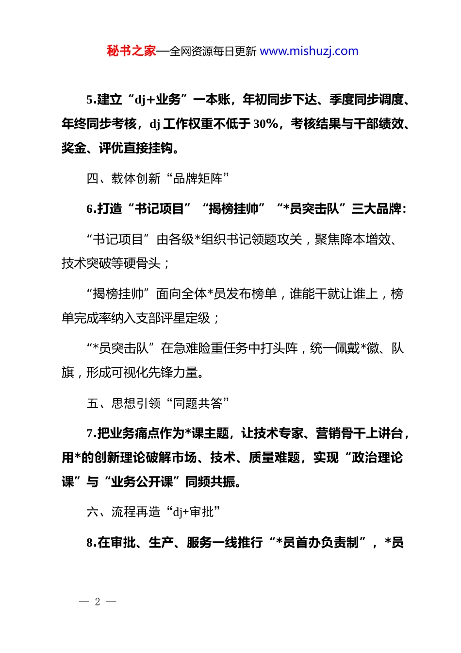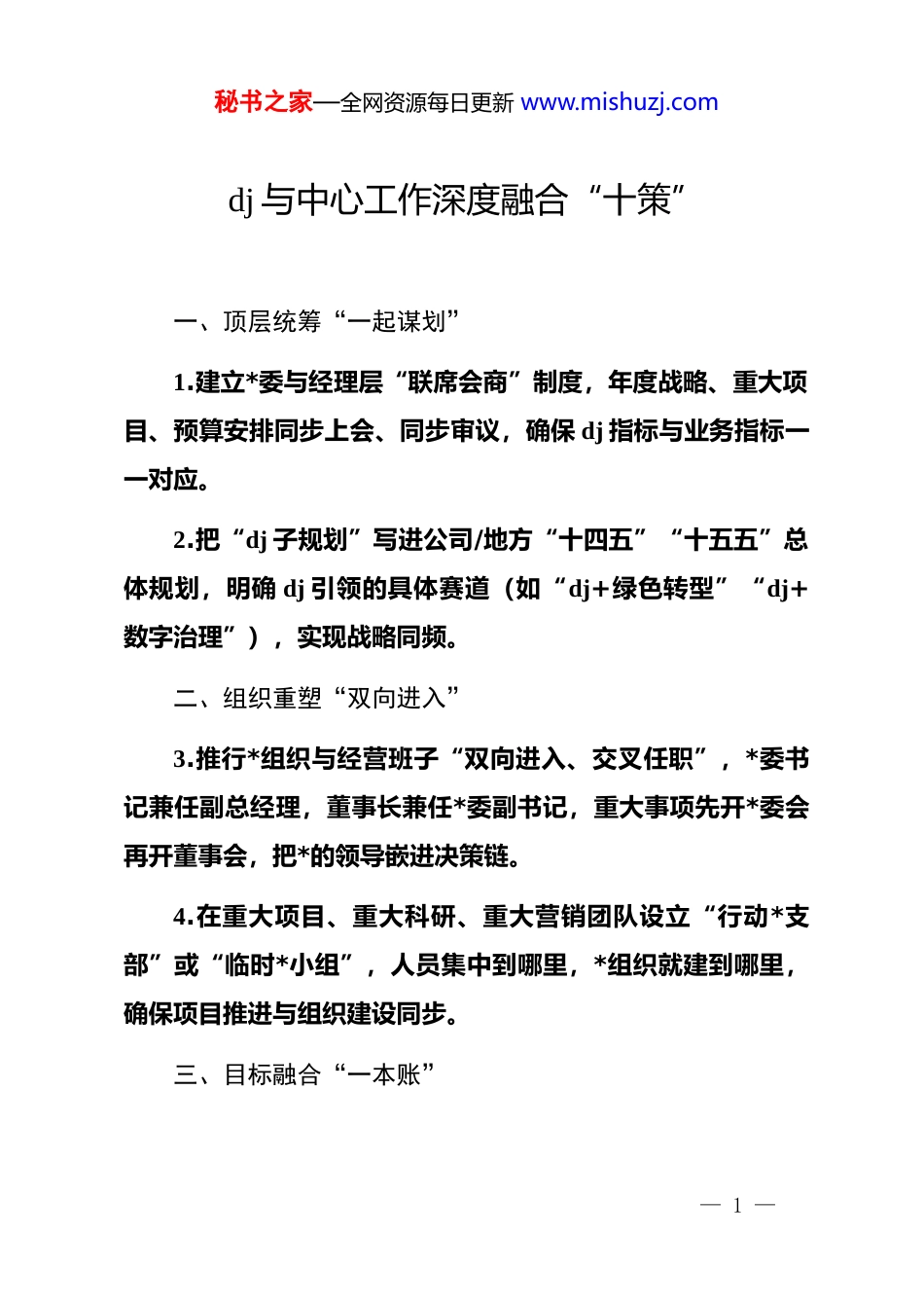 秘书之家—全网资源每日更新 www.mishuzj.comdj 与中心工作深度融合“十策”一、顶层统筹“一起谋划”1.建立*委与经理层“联席会商”制度,年度战略、重大项目、预算安排同步上会、同步审议,确保 dj 指标与业务指标一一对应。2.把“dj 子规划”写进公司/地方“十四五”“十五五”总体规划,明确 dj 引领的具体赛道(如“dj+绿色转型”“dj+数字治理”),实现战略同频。二、组织重塑“双向进入”3.推行*组织与经营班子“双向进入、交叉任职”,*委书记兼任副总经理,董事长兼任*委副书记,重大事项先开*委会再开董事会,把*的领导嵌进决策链。4.在重大项目、重大科研、重大营销团队设立“行动*支部”或“临时*小组”,人员集中到哪里,*组织就建到哪里,确保项目推进与组织建设同步。三、目标融合“一本账”— 1 —秘书之家—全网资源每日更新 www.mishuzj.com5.建立“dj+业务”一本账,年初同步下达、季度同步调度、年终同步考核,dj 工作权重不低于 30%,考核结果与干部绩效、奖金、评优直接挂钩。四、载体创新“品牌矩阵”6.打造“书记项目”“揭榜挂帅”“*员突击队”三大品牌:“书记项目”由各级*组织书记领题攻关,聚焦降本增效、技术突破等硬骨头;“揭榜挂帅”面向全体*员发布榜单,谁能干就让谁上,榜单完成率纳入支部评星定级;“*员突击队”在急难险重任务中打头阵,统一佩戴*徽、队旗,形成可视化先锋力量。五、思想引领“同题共答”7.把业务痛点作为*课主题,让技术专家、营销骨干上讲台,用*的创新理论破解市场、技术、质量难题,实现“政治理论课”与“业务公开课”同频共振。六、流程再造“dj+审批”8.在审批、生产、服务一线推行“*员首办负责制”,*员— 2 —秘书之家—全网资源每日更新 www.mishuzj.com对关键环节终身负责,既抓效率又抓合规,形成 dj 嵌入流程的“红色节点”。#七、数字赋能“云上融合”9.建设智慧 dj 平台,与 erp、mes、crm 等业务系统打通,把组织生活、*员积分、项目进度、质量指标等数据“一屏展示”,用数据说话、用数据考核。八、队伍共建“双向交流”10.实施“双培工程”——把业务骨干培养成*员、把*员培养成业务带头人;组织*务干部与业务干部跨岗挂职、交叉任职,每年双向交流比例不低于 10%,破解“两张皮”人才根源。九、资源共享“红色生态圈”11.对内整合纪检、人力、审计、法务等监督资源,建立“大监督”联席会;对外与上下游、地方政府、科研院所*组织签订“红色联盟”协议,共享市场、技术、政策信息,实现产业链 dj 同频共振。十、效果评估“三看三评”12.建立“三看三评”闭环:— 3 —秘书之家—全网资源每日更新 www.mishuzj.com看经济指标、看创新成果、看群众满意度;*员自评、群众测评、组织考评,结果与干部选拔、职级晋升、评先评优直接挂钩,真正做到“业务发展检验 dj 成效,dj 成效保障业务发展”。通过以上“十策”,推动 dj 与中心工作由“物理拼接”向“化学反应”转变,实现 dj 优势转化为竞争优势、发展优势、治理优势。— 4 —