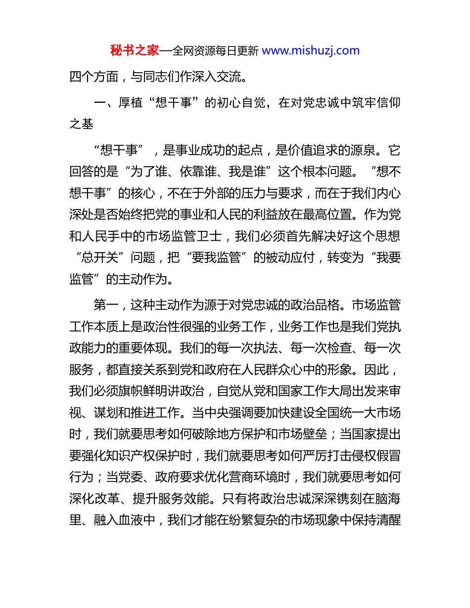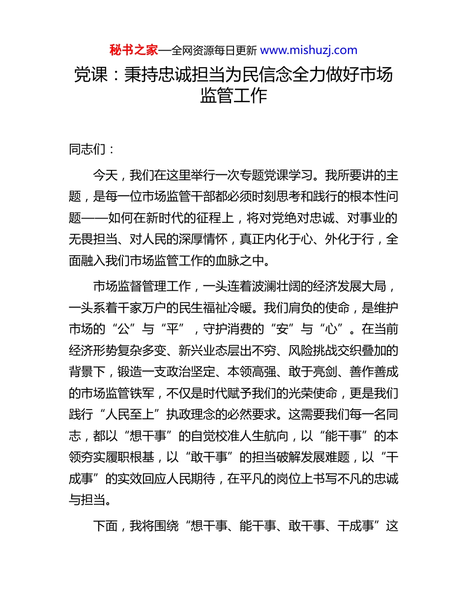 秘书之家—全网资源每日更新 www.mishuzj.com党课:秉持忠诚担当为民信念全力做好市场监管工作同志们:今天,我们在这里举行一次专题党课学习。我所要讲的主题,是每一位市场监管干部都必须时刻思考和践行的根本性问题——如何在新时代的征程上,将对党绝对忠诚、对事业的无畏担当、对人民的深厚情怀,真正内化于心、外化于行,全面融入我们市场监管工作的血脉之中。市场监督管理工作,一头连着波澜壮阔的经济发展大局,一头系着千家万户的民生福祉冷暖。我们肩负的使命,是维护市场的“公”与“平”,守护消费的“安”与“心”。在当前经济形势复杂多变、新兴业态层出不穷、风险挑战交织叠加的背景下,锻造一支政治坚定、本领高强、敢于亮剑、善作善成的市场监管铁军,不仅是时代赋予我们的光荣使命,更是我们践行“人民至上”执政理念的必然要求。这需要我们每一名同志,都以“想干事”的自觉校准人生航向,以“能干事”的本领夯实履职根基,以“敢干事”的担当破解发展难题,以“干成事”的实效回应人民期待,在平凡的岗位上书写不凡的忠诚与担当。下面,我将围绕“想干事、能干事、敢干事、干成事”这秘书之家—全网资源每日更新 www.mishuzj.com四个方面,与同志们作深入交流。一、厚植“想干事”的初心自觉,在对党忠诚中筑牢信仰之基“想干事”,是事业成功的起点,是价值追求的源泉。它回答的是“为了谁、依靠谁、我是谁”这个根本问题。“想不想干事”的核心,不在于外部的压力与要求,而在于我们内心深处是否始终把党的事业和人民的利益放在最高位置。作为党和人民手中的市场监管卫士,我们必须首先解决好这个思想“总开关”问题,把“要我监管”的被动应付,转变为“我要监管”的主动作为。第一,这种主动作为源于对党忠诚的政治品格。市场监管工作本质上是政治性很强的业务工作,业务工作也是我们党执政能力的重要体现。我们的每一次执法、每一次检查、每一次服务,都直接关系到党和政府在人民群众心中的形象。因此,我们必须旗帜鲜明讲政治,自觉从党和国家工作大局出发来审视、谋划和推进工作。当中央强调要加快建设全国统一大市场时,我们就要思考如何破除地方保护和市场壁垒;当国家提出要强化知识产权保护时,我们就要思考如何严厉打击侵权假冒行为;当党委、政府要求优化营商环境时,我们就要思考如何深化改革、提升服务效能。只有将政治忠诚深深镌刻在脑海里、融入血液中,我们才能在纷繁复杂的市场现象中保持清醒秘书之家—全网资源每日更新 www.mishuzj.com头脑,在维护市场稳定、服务高质量发展、保障民生安全中找准自身定位,确保市场监管工作始终沿着正确的政治方向前进。第二,这种主动作为根植于“监管为民”的深厚情怀。我们手中的权力是人民赋予的,我们的工作就是为人民监管市场。要时刻牢记,我们的工作岗位就是为民服务的哨位。要坚决摒弃“多一事不如少一事”的懈怠思想和“事不关己高高挂起”的官僚主义。看到校园周边的“三无”食品,不能仅仅是下发一张整改通知书了事,而是要主动追根溯源,彻底端掉其生产销售链条;发现网络直播中存在虚假宣传、夸大功效的苗头,不能等到消费者投诉了才去处理,而是要及时介入、果断查处,将欺诈行为扼杀在萌芽状态;在巡查中遇到电梯、压力容器等特种设备存在安全隐患,不能有丝毫的麻痹和侥幸,必须第一时间督促使用单位停止运行、立即整改,把事故风险降到最低。只有真正把群众的安危冷暖放在心上,把监管责任扛在肩上,才能在日常巡查中多一份细心,在风险排查中多一份敏锐,在处理投诉中多一分耐心,让人民群众真切感受到市场监管的力度与温度。第三,这种主动作为依托于“专业过硬”的能力素养。当前市场业态日新月异,新问题、新挑战层出不穷,从直播带货的虚假宣传到跨境电商的质量监管,从预付式消费的维权难题到新兴领域的标准缺失,都对市场监管队伍的专业能力提出了秘书之家—全网资源每日更新 www.mishuzj.com更高要求。如果缺乏过硬的专业素养,主动作为就可能沦为“盲目蛮干”,甚至出现监管偏差、执法失准的问题。因此,我们必须把能力提升作为履职根基,持续强化专业知识学习与实战技能...