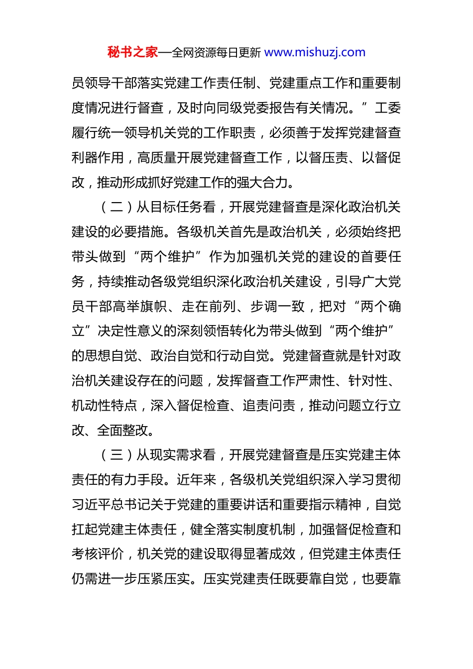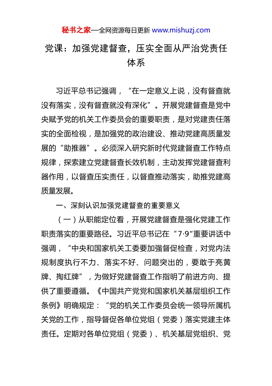 秘书之家—全网资源每日更新 www.mishuzj.com党课:加强党建督查,压实全面从严治党责任体系 习近平总书记强调,“在一定意义上说,没有督查就没有落实,没有督查就没有深化”。开展党建督查是党中央赋予党的机关工作委员会的重要职责,是对党建责任落实的全面检视,是加强党的政治建设、推动党建高质量发展的“助推器”。必须深入研究新时代党建督查工作特点规律,探索建立党建督查长效机制,主动发挥党建督查利器作用,以督查压实责任,以督查推动落实,助推党建高质量发展。一、深刻认识加强党建督查的重要意义(一)从职能定位看,开展党建督查是强化党建工作职责落实的重要路径。习近平总书记在“7·9”重要讲话中强调,“中央和国家机关工委要加强督促检查,对党内法规制度执行不力、落实不好、问题突出的,要敢于亮黄牌、掏红牌”,为做好党建督查工作指明了前进方向、提供了重要遵循。《中国共产党党和国家机关基层组织工作条例》明确规定:“党的机关工作委员会统一领导所属机关党的工作,指导督促各单位党组(党委)落实党建主体责任。定期对各单位党组(党委)、机关基层党组织、党秘书之家—全网资源每日更新 www.mishuzj.com员领导干部落实党建工作责任制、党建重点工作和重要制度情况进行督查,及时向同级党委报告有关情况。”工委履行统一领导机关党的工作职责,必须善于发挥党建督查利器作用,高质量开展党建督查工作,以督压责、以督促改,推动形成抓好党建工作的强大合力。(二)从目标任务看,开展党建督查是深化政治机关建设的必要措施。各级机关首先是政治机关,必须始终把带头做到“两个维护”作为加强机关党的建设的首要任务,持续推动各级党组织深化政治机关建设,引导广大党员干部高举旗帜、走在前列、步调一致,把对“两个确立”决定性意义的深刻领悟转化为带头做到“两个维护”的思想自觉、政治自觉和行动自觉。党建督查就是针对政治机关建设存在的问题,发挥督查工作严肃性、针对性、机动性特点,深入督促检查、追责问责,推动问题立行立改、全面整改。(三)从现实需求看,开展党建督查是压实党建主体责任的有力手段。近年来,各级机关党组织深入学习贯彻习近平总书记关于党建的重要讲话和重要指示精神,自觉扛起党建主体责任,健全落实制度机制,加强督促检查和考核评价,机关党的建设取得显著成效,但党建主体责任仍需进一步压紧压实。压实党建责任既要靠自觉,也要靠秘书之家—全网资源每日更新 www.mishuzj.com外力制约。必须通过党建督查,推动构建更加紧密的责任体系,实现机关基层组织建设建有标尺、行有准则、做有规范。(四)从工作实践看,开展党建督查是推动党建高质量发展的重要保障。习近平总书记在“7·9”重要讲话中强调,要全面提高中央和国家机关党的建设质量。党的二十大报告明确提出,要全面提高党建质量。2024 年 7 月 29日,习近平总书记就中央和国家机关学习贯彻党的二十届三中全会精神、推动党建高质量发展作出重要指示,开启了以高质量党建促进高质量发展的新时期。全国党建战线必须进一步提高政治站位,聚焦推动党建高质量发展,同向同行、同题共答。近年来,各级工委持续开展党建督查,推动解决党建的突出矛盾和问题。督查发现,机关“灯下黑”“两张皮”等问题持续好转,机关党的建设整体质量明显提高。二、深度探索党建督查的方法路径(一)聚焦“谁来督查”,建强督查主体。工委是开展党建督查的责任主体,必须切实担负起督查主体责任,整合督查力量,统筹督查工作,提升督查能力。一是组建督查队伍。建设对党忠诚、敢于担当、业务精湛、作风扎实的党建督查队伍,是提升督查工作质量的关键。具备条秘书之家—全网资源每日更新 www.mishuzj.com件的工委要推动成立党建督查室,专门负责党建督查工作。不具备条件的,可指定有关处室负责。在工委统一领导下,由督查室或指定处室每年牵头开展党建督查。要统筹工委机关力量,从工委内部抽选党建和督查工作经验丰富的人员组成督查组,也可从有关部门和单位遴选政治强、业务精、作风好的党务干部充实到督查组。二是开展督查培训。党建督查工作涉及面广、专业性强,标...