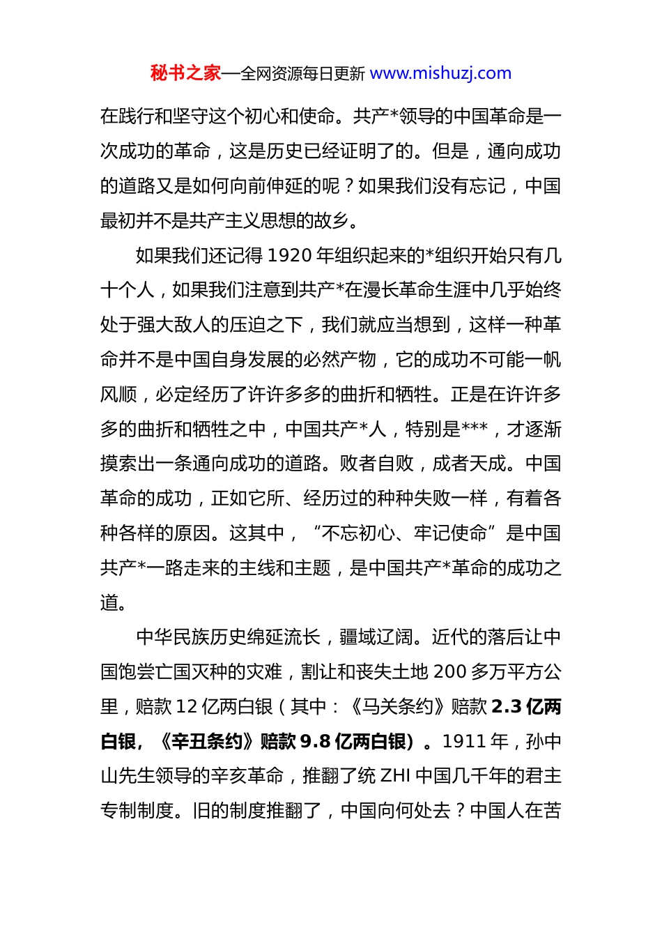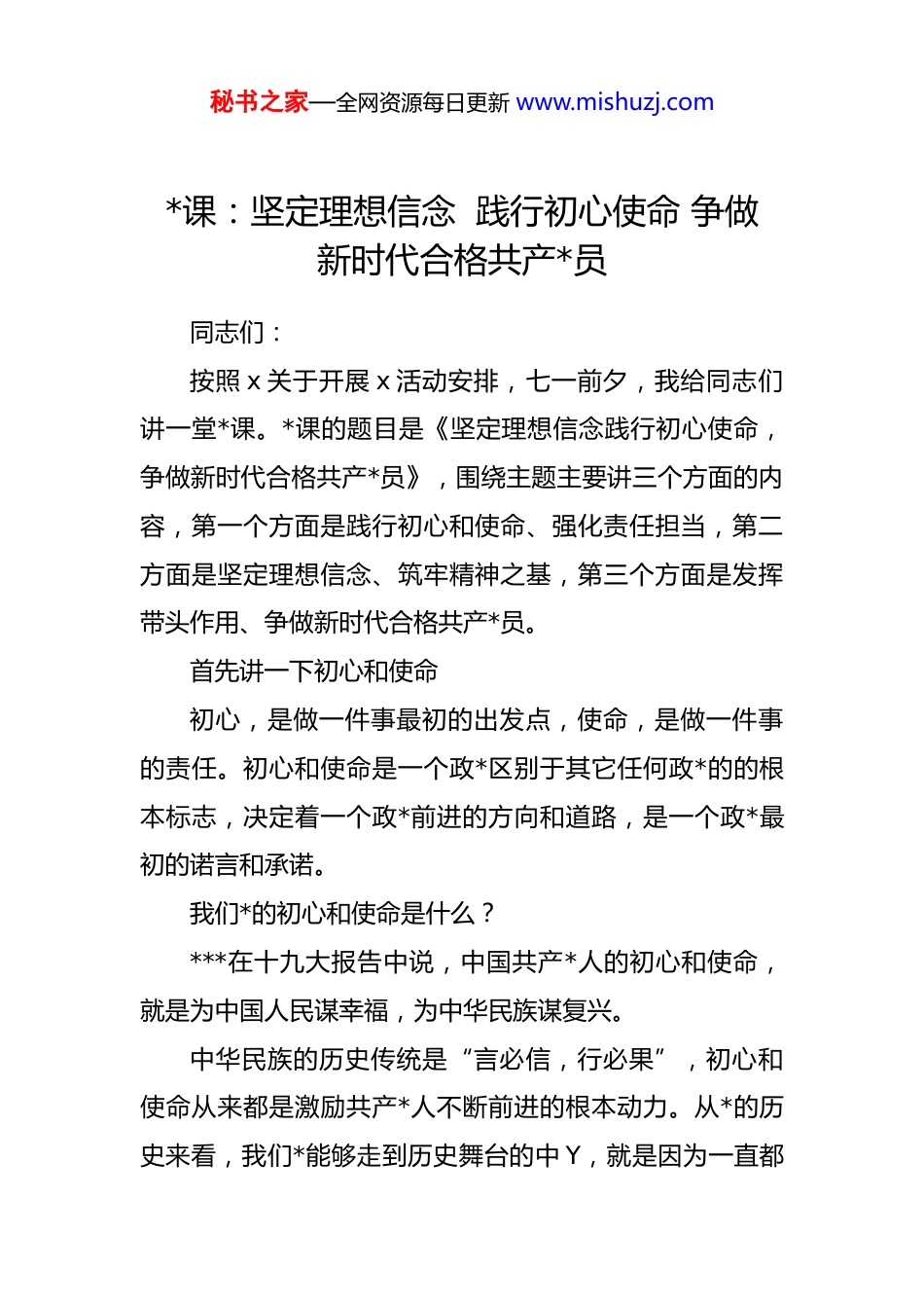 秘书之家—全网资源每日更新 www.mishuzj.com*课:坚定理想信念 践行初心使命 争做新时代合格共产*员同志们:按照 x 关于开展 x 活动安排,七一前夕,我给同志们讲一堂*课。*课的题目是《坚定理想信念践行初心使命,争做新时代合格共产*员》,围绕主题主要讲三个方面的内容,第一个方面是践行初心和使命、强化责任担当,第二方面是坚定理想信念、筑牢精神之基,第三个方面是发挥带头作用、争做新时代合格共产*员。首先讲一下初心和使命初心,是做一件事最初的出发点,使命,是做一件事的责任。初心和使命是一个政*区别于其它任何政*的的根本标志,决定着一个政*前进的方向和道路,是一个政*最初的诺言和承诺。我们*的初心和使命是什么?***在十九大报告中说,中国共产*人的初心和使命,就是为中国人民谋幸福,为中华民族谋复兴。中华民族的历史传统是“言必信,行必果”,初心和使命从来都是激励共产*人不断前进的根本动力。从*的历史来看,我们*能够走到历史舞台的中 Y,就是因为一直都秘书之家—全网资源每日更新 www.mishuzj.com在践行和坚守这个初心和使命。共产*领导的中国革命是一次成功的革命,这是历史已经证明了的。但是,通向成功的道路又是如何向前伸延的呢?如果我们没有忘记,中国最初并不是共产主义思想的故乡。如果我们还记得 1920 年组织起来的*组织开始只有几十个人,如果我们注意到共产*在漫长革命生涯中几乎始终处于强大敌人的压迫之下,我们就应当想到,这样一种革命并不是中国自身发展的必然产物,它的成功不可能一帆风顺,必定经历了许许多多的曲折和牺牲。正是在许许多多的曲折和牺牲之中,中国共产*人,特别是***,才逐渐摸索出一条通向成功的道路。败者自败,成者天成。中国革命的成功,正如它所、经历过的种种失败一样,有着各种各样的原因。这其中,“不忘初心、牢记使命”是中国共产*一路走来的主线和主题,是中国共产*革命的成功之道。中华民族历史绵延流长,疆域辽阔。近代的落后让中国饱尝亡国灭种的灾难,割让和丧失土地 200 多万平方公里,赔款 12 亿两白银(其中:《马关条约》赔款 2.3 亿两白银,《辛丑条约》赔款 9.8 亿两白银)。1911 年,孙中山先生领导的辛亥革命,推翻了统 ZHI 中国几千年的君主专制制度。旧的制度推翻了,中国向何处去?中国人在苦秘书之家—全网资源每日更新 www.mishuzj.com苦寻找适合中国国情的道路。君主立宪制、复辟帝制、议会制、多*制、总统制都想过了、试过了,结果都行不通。最后,中国选择了共产*领导的革命之路,选择了社会主义道路。1.新民主主义革命时期(1921 年——1949 年)。在那个内忧外患、积贫积弱的年代,俄国十月革命的胜利,为中国送来了马克思列宁主义。“大浪淘沙始见金”。走俄国人的路,走社会主义的路,这就是结论。这是历史的选择,也是人民的选择。外面是列强侵略,内部是军阀混战,老百姓民不聊生,国家命运岌岌可危。在那个时候,人们渴望有一个坚强的政 ZHI 力量,能够领导中国人民走上强国富民的道路,中国共产*是就在这种背景下诞生的。为了把人民大众从这种灾难深重、水深火热的旧中国中解脱出来,共产*人前赴后继,先后经历了北伐战争、土地革命战争、抗日战争和解放战争 4 个阶段,完成了新民主主义革命,建立了社会主义的新中国,实现了民族独立和人民当家作主。从 1921 年到 1949 年 28 年期间,为践行和坚守初心和使命捐躯的有 300 多万*员。1921 年,13 名知识分子来到上海成立中国共产*,中共一大 13 名代表,其中最年轻的是 19 岁的北大学生刘仁静,1983 年,81 岁的刘仁静在接受采访时说:“根本没想到是这么重要的一秘书之家—全网资源每日更新 www.mishuzj.com次会啊!不就到上海开个会嘛,谁想到是这么重要的一个会呢?”1922 年陈公博脱*,1923 年李达脱*,1924 年李汉俊、周佛海脱*,1927 年包惠僧脱*,1930 年刘仁静被*开除,1938 年张国焘被*开除。这些人无论从智商、学历、出身、影响力等方面来看,都不见得会比***差。假如历史是可以预知的,作为中共的发起人,要是知道自己亲手成立的*28 年后会夺取全国...