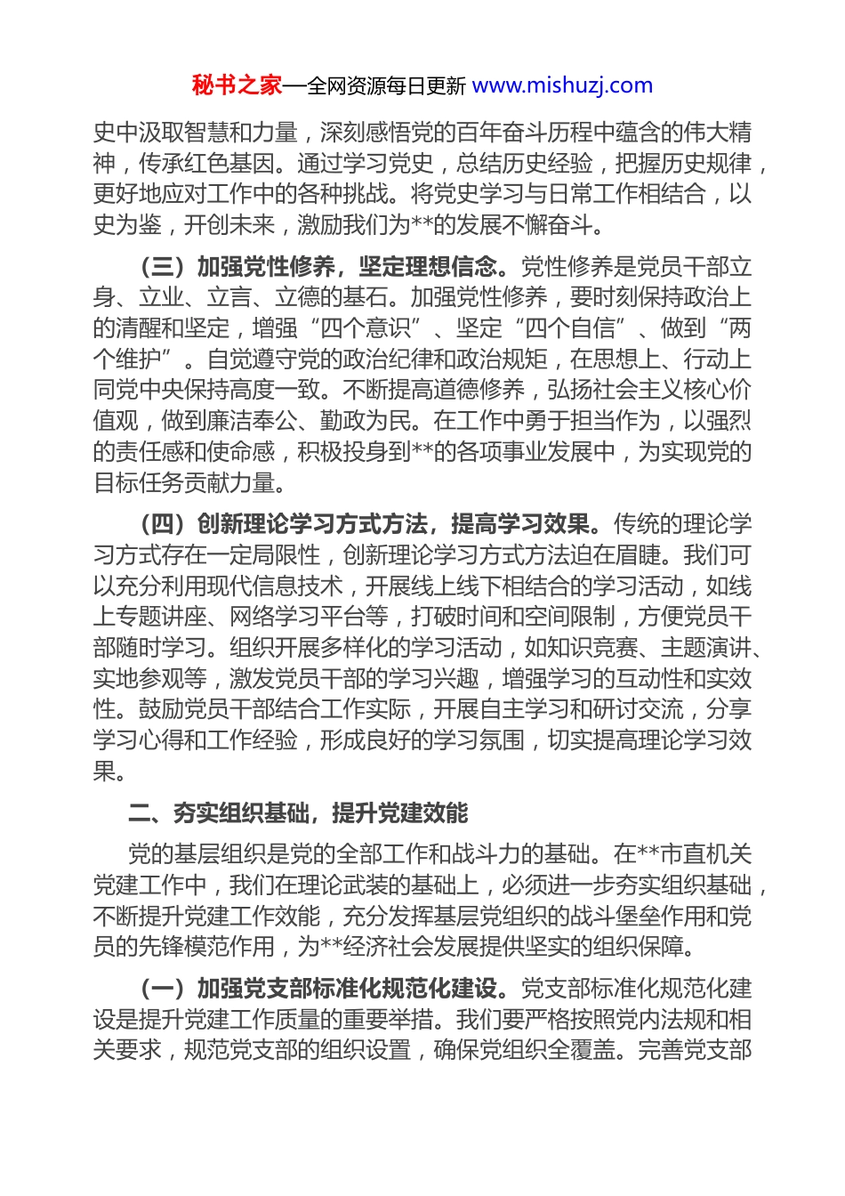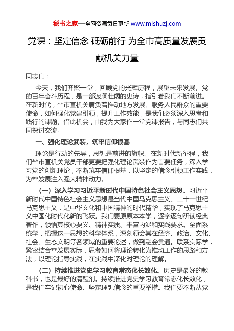 秘书之家—全网资源每日更新 www.mishuzj.com党课:坚定信念 砥砺前行 为全市高质量发展贡献机关力量同志们:今天,我们齐聚一堂,回顾党的光辉历程,展望未来发展。党的百年奋斗历程,是一部波澜壮阔的史诗,指引着我们不断前进。在新时代,**市直机关肩负着推动地方发展、服务人民群众的重要使命,如何强化党建引领,提升工作效能,是我们必须深入思考和践行的课题。借此机会,由我为大家作一堂党课报告,与同志们共同探讨交流。一、强化理论武装,筑牢信仰根基理论是行动的先导,思想是前进的旗帜。在新时代新征程,我们**市直机关党员干部更要把强化理论武装作为首要任务,深入学习党的创新理论,不断筑牢信仰根基,以坚定的信念引领工作实践,为**发展注入强大精神动力。(一)深入学习习近平新时代中国特色社会主义思想。习近平新时代中国特色社会主义思想是当代中国马克思主义、二十一世纪马克思主义,是中华文化和中国精神的时代精华,实现了马克思主义中国化时代化新的飞跃。我们要原原本本学,逐字逐句研读经典著作,领悟其核心要义、精神实质、丰富内涵和实践要求。全面系统学,把握这一思想的科学体系,深刻领会其在经济、政治、文化、社会、生态文明等各领域的重要论述,做到融会贯通。联系实际学,紧密结合**发展实际,思考如何将理论转化为推动工作的思路和方法,以理论指导实践,在实践中深化对理论的理解。(二)持续推进党史学习教育常态化长效化。历史是最好的教科书,也是最好的清醒剂。持续推进党史学习教育常态化长效化,是我们牢记初心使命、坚定理想信念的重要举措。我们要不断从党秘书之家—全网资源每日更新 www.mishuzj.com史中汲取智慧和力量,深刻感悟党的百年奋斗历程中蕴含的伟大精神,传承红色基因。通过学习党史,总结历史经验,把握历史规律,更好地应对工作中的各种挑战。将党史学习与日常工作相结合,以史为鉴,开创未来,激励我们为**的发展不懈奋斗。(三)加强党性修养,坚定理想信念。党性修养是党员干部立身、立业、立言、立德的基石。加强党性修养,要时刻保持政治上的清醒和坚定,增强“四个意识”、坚定“四个自信”、做到“两个维护”。自觉遵守党的政治纪律和政治规矩,在思想上、行动上同党中央保持高度一致。不断提高道德修养,弘扬社会主义核心价值观,做到廉洁奉公、勤政为民。在工作中勇于担当作为,以强烈的责任感和使命感,积极投身到**的各项事业发展中,为实现党的目标任务贡献力量。(四)创新理论学习方式方法,提高学习效果。传统的理论学习方式存在一定局限性,创新理论学习方式方法迫在眉睫。我们可以充分利用现代信息技术,开展线上线下相结合的学习活动,如线上专题讲座、网络学习平台等,打破时间和空间限制,方便党员干部随时学习。组织开展多样化的学习活动,如知识竞赛、主题演讲、实地参观等,激发党员干部的学习兴趣,增强学习的互动性和实效性。鼓励党员干部结合工作实际,开展自主学习和研讨交流,分享学习心得和工作经验,形成良好的学习氛围,切实提高理论学习效果。二、夯实组织基础,提升党建效能党的基层组织是党的全部工作和战斗力的基础。在**市直机关党建工作中,我们在理论武装的基础上,必须进一步夯实组织基础,不断提升党建工作效能,充分发挥基层党组织的战斗堡垒作用和党员的先锋模范作用,为**经济社会发展提供坚实的组织保障。(一)加强党支部标准化规范化建设。党支部标准化规范化建设是提升党建工作质量的重要举措。我们要严格按照党内法规和相关要求,规范党支部的组织设置,确保党组织全覆盖。完善党支部秘书之家—全网资源每日更新 www.mishuzj.com工作制度,明确党支部的工作职责、工作流程和工作标准,使党支部工作有章可循。加强党支部班子建设,选优配强党支部书记和委员,提高班子的政治素质和工作能力。定期开展党支部标准化规范化建设达标验收,及时发现问题并整改,不断提升党支部建设水平。(二)严格党的组织生活。党的组织生活是党内政治生活的重要内容和载体。严格执行“三会一课”制度,定期召开支部党员大会、支部委员会、党小组会,按时上好党课,确保党的组织...