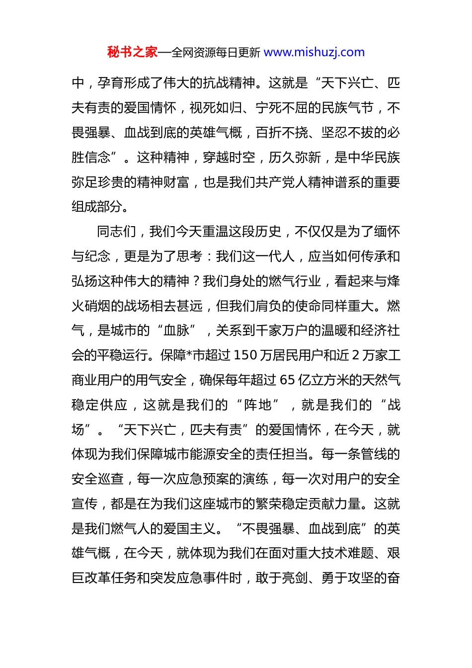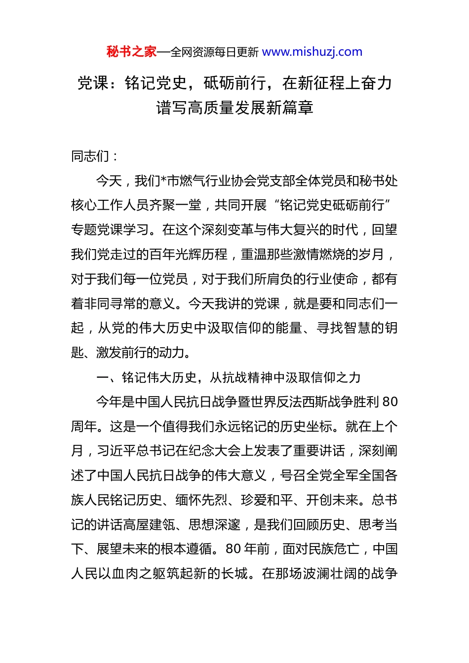 秘书之家—全网资源每日更新 www.mishuzj.com党课:铭记党史,砥砺前行,在新征程上奋力谱写高质量发展新篇章 同志们:今天,我们*市燃气行业协会党支部全体党员和秘书处核心工作人员齐聚一堂,共同开展“铭记党史砥砺前行”专题党课学习。在这个深刻变革与伟大复兴的时代,回望我们党走过的百年光辉历程,重温那些激情燃烧的岁月,对于我们每一位党员,对于我们所肩负的行业使命,都有着非同寻常的意义。今天我讲的党课,就是要和同志们一起,从党的伟大历史中汲取信仰的能量、寻找智慧的钥匙、激发前行的动力。一、铭记伟大历史,从抗战精神中汲取信仰之力今年是中国人民抗日战争暨世界反法西斯战争胜利 80周年。这是一个值得我们永远铭记的历史坐标。就在上个月,习近平总书记在纪念大会上发表了重要讲话,深刻阐述了中国人民抗日战争的伟大意义,号召全党全军全国各族人民铭记历史、缅怀先烈、珍爱和平、开创未来。总书记的讲话高屋建瓴、思想深邃,是我们回顾历史、思考当下、展望未来的根本遵循。80 年前,面对民族危亡,中国人民以血肉之躯筑起新的长城。在那场波澜壮阔的战争秘书之家—全网资源每日更新 www.mishuzj.com中,孕育形成了伟大的抗战精神。这就是“天下兴亡、匹夫有责的爱国情怀,视死如归、宁死不屈的民族气节,不畏强暴、血战到底的英雄气概,百折不挠、坚忍不拔的必胜信念”。这种精神,穿越时空,历久弥新,是中华民族弥足珍贵的精神财富,也是我们共产党人精神谱系的重要组成部分。同志们,我们今天重温这段历史,不仅仅是为了缅怀与纪念,更是为了思考:我们这一代人,应当如何传承和弘扬这种伟大的精神?我们身处的燃气行业,看起来与烽火硝烟的战场相去甚远,但我们肩负的使命同样重大。燃气,是城市的“血脉”,关系到千家万户的温暖和经济社会的平稳运行。保障*市超过 150 万居民用户和近 2 万家工商业用户的用气安全,确保每年超过 65 亿立方米的天然气稳定供应,这就是我们的“阵地”,就是我们的“战场”。“天下兴亡,匹夫有责”的爱国情怀,在今天,就体现为我们保障城市能源安全的责任担当。每一条管线的安全巡查,每一次应急预案的演练,每一次对用户的安全宣传,都是在为我们这座城市的繁荣稳定贡献力量。这就是我们燃气人的爱国主义。“不畏强暴、血战到底”的英雄气概,在今天,就体现为我们在面对重大技术难题、艰巨改革任务和突发应急事件时,敢于亮剑、勇于攻坚的奋秘书之家—全网资源每日更新 www.mishuzj.com斗姿态。这就是我们燃气人的英雄主义。因此,学习抗战精神,就是要将这种精神内核转化为我们坚定的理想信念,把对党和人民的忠诚,熔铸到保障城市能源命脉的每一项具体工作中去,筑牢我们战胜一切艰难险阻的信仰根基。二、传承红色基因,从革命精神中汲取智慧之力我们党的百年历史,是一部不断战胜艰难险阻、从胜利走向胜利的奋斗史。从*湖上的一艘小小红船,到领航中国行稳致远的巍巍巨轮,我们党在革命、建设、改革的伟大实践中,锤炼了无数宝贵的革命精神。今天,我重点与同志们分享三种精神,并探讨如何将其与我们的行业工作紧密结合。(一)以“红船精神”为灯塔,照亮创新发展的领航之路“红船精神”,其核心是“开天辟地、敢为人先的首创精神,坚定理想、百折不挠的奋斗精神,立党为公、忠诚为民的奉献精神”。“首创精神”是其灵魂。回顾我们燃气行业的发展历程得,本身就是一部不断创新、不断突破的历史。从最初的人工煤气,到后来的液化石油气,再到今天广泛使用的清洁、高效的天然气,每一次能源的迭代升级,都是一次深刻的行业革命。当前,新一轮科技革命秘书之家—全网资源每日更新 www.mishuzj.com和产业变革方兴未艾,数字化、智能化、绿色化浪潮席卷而来。我们燃气行业不能再仅仅满足于做一个“输气工”,更要成为能源革命的积极参与者和推动者。这就需要我们大力弘扬“红船精神”,敢于走别人没有走过的路,敢于做前人没有做过的事。我们协会要引导和鼓励会员企业,以首创精神推动技术革新。比如,加快“智慧燃气”建设,通过大数据、物联网、云计算等先进技术,构建“*智慧管网系统”,实现对...