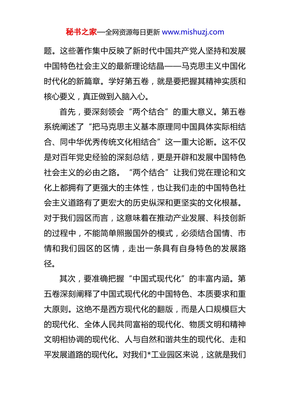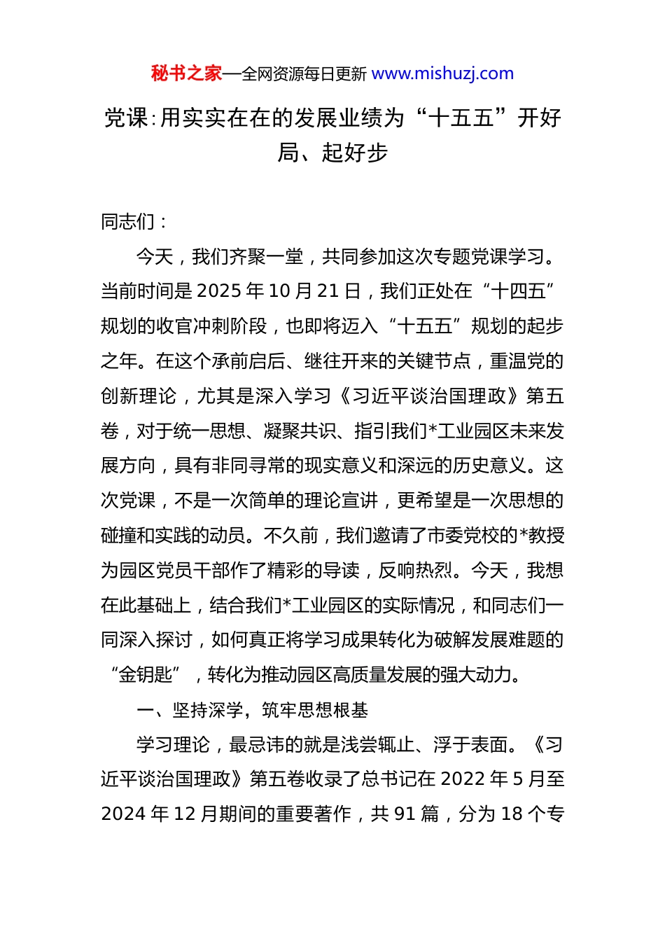 秘书之家—全网资源每日更新 www.mishuzj.com党课:用实实在在的发展业绩为“十五五”开好局、起好步 同志们:今天,我们齐聚一堂,共同参加这次专题党课学习。当前时间是 2025 年 10 月 21 日,我们正处在“十四五”规划的收官冲刺阶段,也即将迈入“十五五”规划的起步之年。在这个承前启后、继往开来的关键节点,重温党的创新理论,尤其是深入学习《习近平谈治国理政》第五卷,对于统一思想、凝聚共识、指引我们*工业园区未来发展方向,具有非同寻常的现实意义和深远的历史意义。这次党课,不是一次简单的理论宣讲,更希望是一次思想的碰撞和实践的动员。不久前,我们邀请了市委党校的*教授为园区党员干部作了精彩的导读,反响热烈。今天,我想在此基础上,结合我们*工业园区的实际情况,和同志们一同深入探讨,如何真正将学习成果转化为破解发展难题的“金钥匙”,转化为推动园区高质量发展的强大动力。一、坚持深学,筑牢思想根基学习理论,最忌讳的就是浅尝辄止、浮于表面。《习近平谈治国理政》第五卷收录了总书记在 2022 年 5 月至2024 年 12 月期间的重要著作,共 91 篇,分为 18 个专秘书之家—全网资源每日更新 www.mishuzj.com题。这些著作集中反映了新时代中国共产党人坚持和发展中国特色社会主义的最新理论结晶——马克思主义中国化时代化的新篇章。学好第五卷,就是要把握其精神实质和核心要义,真正做到入脑入心。首先,要深刻领会“两个结合”的重大意义。第五卷系统阐述了“把马克思主义基本原理同中国具体实际相结合、同中华优秀传统文化相结合”这一重大论断。这不仅是对百年党史经验的深刻总结,更是开辟和发展中国特色社会主义的必由之路。“两个结合”让我们党在理论和文化上都拥有了更强大的主体性,也让我们走的中国特色社会主义道路有了更宏大的历史纵深和更坚实的文化根基。对于我们园区而言,这意味着在推动产业发展、科技创新的过程中,不能简单照搬国外的模式,必须结合国情、市情和我们园区的区情,走出一条具有自身特色的发展路径。其次,要准确把握“中国式现代化”的丰富内涵。第五卷深刻阐释了中国式现代化的中国特色、本质要求和重大原则。这绝不是西方现代化的翻版,而是人口规模巨大的现代化、全体人民共同富裕的现代化、物质文明和精神文明相协调的现代化、人与自然和谐共生的现代化、走和平发展道路的现代化。对我们*工业园区来说,这就是我们秘书之家—全网资源每日更新 www.mishuzj.com的行动指南。我们追求的不仅仅是经济数据的增长,更是发展的质量和效益。我们的目标是建设一个高端、智能、绿色的现代化产业社区,让园区里的每一家企业、每一位员工都能共享发展的红利,实现个人价值与园区发展的同频共振。再次,要深入理解“新质生产力”的实践要求。“新质生产力”是第五卷中的一个高频词,也是当前和未来经济发展的关键所在。它是由技术革命性突破、生产要素创新性配置、产业深度转型升级而催生的当代先进生产力。其核心在于“新”,关键在于“质”。这意味着要摆脱传统增长路径,依靠科技创新,特别是原创性、颠覆性科技创新,来培育发展新动能。我们园区一直以制造业为本,聚焦高端装备、生物医药、汽车相关等主导产业,并前瞻性地布局商业航天、工业母机、汽车芯片等新赛道,这本身就是对发展新质生产力的生动实践。学习第五卷,就是要让我们更加坚定地走创新驱动发展之路,把科技创新的“关键变量”转化为高质量发展的“最大增量”。最后,要时刻牢记“自我革命”的根本保障。第五卷将全面从严治党和党的自我革命摆在了突出位置。办好中国的事情,关键在党,关键在党要管党、全面从严治党。对于我们园区来说,一个风清气正的政治生态、一个高效秘书之家—全网资源每日更新 www.mishuzj.com廉洁的营商环境,就是最核心的竞争力。园区各级党组织和全体党员干部,必须永葆自我革命精神,敢于刀刃向内,不断提高政治判断力、政治领悟力、政治执行力,才能为园区发展航船劈波斩浪提供最坚强的政治保证。二、善于细悟,破解发展难题理论的价值在于指导实践,学习的目的全在于应用。我们不能把学习理论当成一种...