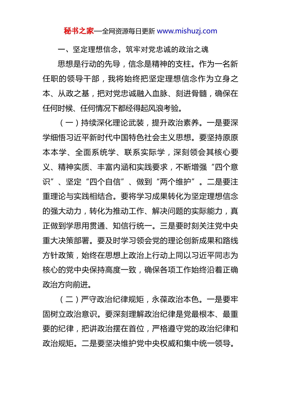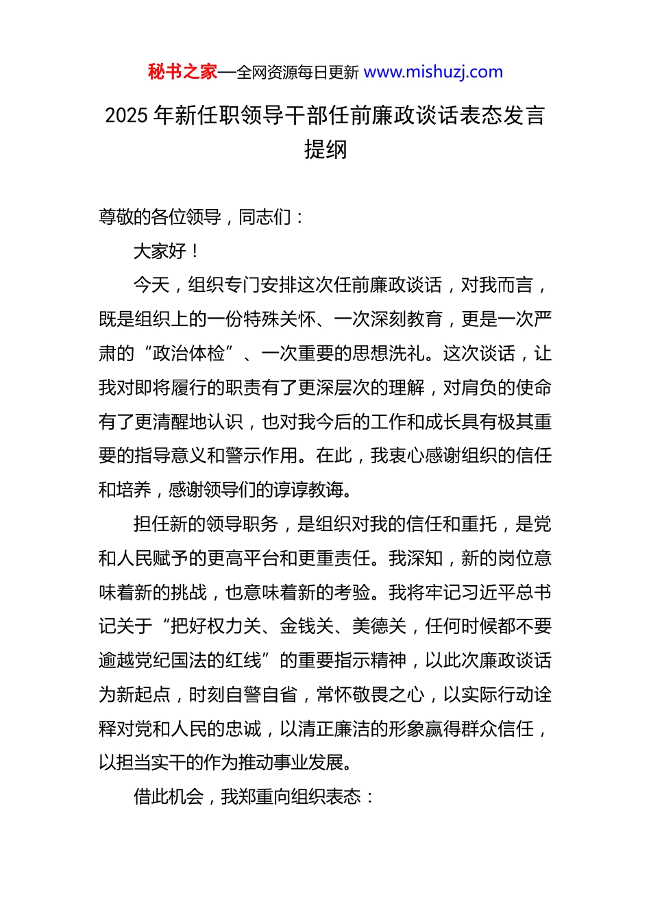 秘书之家—全网资源每日更新 www.mishuzj.com2025 年新任职领导干部任前廉政谈话表态发言提纲 尊敬的各位领导,同志们:大家好!今天,组织专门安排这次任前廉政谈话,对我而言,既是组织上的一份特殊关怀、一次深刻教育,更是一次严肃的“政治体检”、一次重要的思想洗礼。这次谈话,让我对即将履行的职责有了更深层次的理解,对肩负的使命有了更清醒地认识,也对我今后的工作和成长具有极其重要的指导意义和警示作用。在此,我衷心感谢组织的信任和培养,感谢领导们的谆谆教诲。担任新的领导职务,是组织对我的信任和重托,是党和人民赋予的更高平台和更重责任。我深知,新的岗位意味着新的挑战,也意味着新的考验。我将牢记习近平总书记关于“把好权力关、金钱关、美德关,任何时候都不要逾越党纪国法的红线”的重要指示精神,以此次廉政谈话为新起点,时刻自警自省,常怀敬畏之心,以实际行动诠释对党和人民的忠诚,以清正廉洁的形象赢得群众信任,以担当实干的作为推动事业发展。借此机会,我郑重向组织表态:秘书之家—全网资源每日更新 www.mishuzj.com一、坚定理想信念,筑牢对党忠诚的政治之魂思想是行动的先导,信念是精神的支柱。作为一名新任职的领导干部,我将始终把坚定理想信念作为立身之本、从政之基,把对党忠诚融入血脉、刻进骨髓,确保在任何时候、任何情况下都经得起风浪考验。(一)持续深化理论武装,提升政治素养。一是要深学细悟习近平新时代中国特色社会主义思想。要坚持原原本本学、全面系统学、联系实际学,深刻领会其核心要义、精神实质、丰富内涵和实践要求,不断增强“四个意识”、坚定“四个自信”、做到“两个维护”。二是要注重理论与实践相结合。要将学习成果转化为坚定理想信念的强大动力,转化为推动工作、解决问题的实际能力,真正做到学思用贯通、知信行统一。三是要时刻关注党中央重大决策部署。要及时学习领会党的理论创新成果和路线方针政策,始终在思想上政治上行动上同以习近平同志为核心的党中央保持高度一致,确保各项工作始终沿着正确政治方向前进。(二)严守政治纪律规矩,永葆政治本色。一是要牢固树立政治意识。要深刻理解政治纪律是党最根本、最重要的纪律,把讲政治摆在首位,严格遵守党的政治纪律和政治规矩。二是要坚决维护党中央权威和集中统一领导。秘书之家—全网资源每日更新 www.mishuzj.com要做到党中央提倡的坚决响应、党中央决定的坚决照办、党中央禁止的坚决杜绝,不折不扣地贯彻执行党的各项决策部署,绝不允许有令不行、有禁不止。三是要自觉加强党性修养。要经常对照党章党规党纪,检视自己的思想和行为,及时纠正偏差,不断增强党性锻炼,始终做政治上的明白人、老实人。(三)强化党内政治生活,涵养政治生态。一是要严格落实民主集中制。要坚持集体领导与个人分工相结合,在重大问题决策上充分发扬民主,广泛听取意见,集思广益,同时坚决服从集体决定,维护班子团结。二是要认真开展批评和自我批评。要以刀刃向内的勇气,经常性地进行自我检查和反思,虚心听取同志们的意见建议,做到有则改之、无则加勉,不断提高自身政治免疫力。三是要积极营造良好政治生态。要带头营造风清气正、积极向上、干事创业的良好氛围,做到光明磊落、坦荡真诚,共同维护风清气正的政治环境。二、强化责任担当,涵养干事创业的务实之风“为官避事平生耻”。作为一名新任职领导干部,我将牢记使命、忠诚履职,以敢于担当的宽肩膀、善于作为的真本领,全身心投入到为党和人民的事业奋斗中去。(一)牢记宗旨意识,践行初心使命。一是要始终坚秘书之家—全网资源每日更新 www.mishuzj.com持以人民为中心的发展思想。要深入基层、深入群众,倾听民声、了解民意,把群众的呼声作为第一信号,把群众的需求作为第一选择,把群众满意作为第一标准。二是要着力解决群众急难愁盼问题。要时刻把群众的安危冷暖放在心上,对涉及群众切身利益的突出问题,要积极主动作为,想方设法解决,努力让人民群众有更多的获得感、幸福感、安全感。三是要自觉接受人民监督。要始终把自己置于党组织和人民群众的监督之下,虚心听取各方面的意见和批...