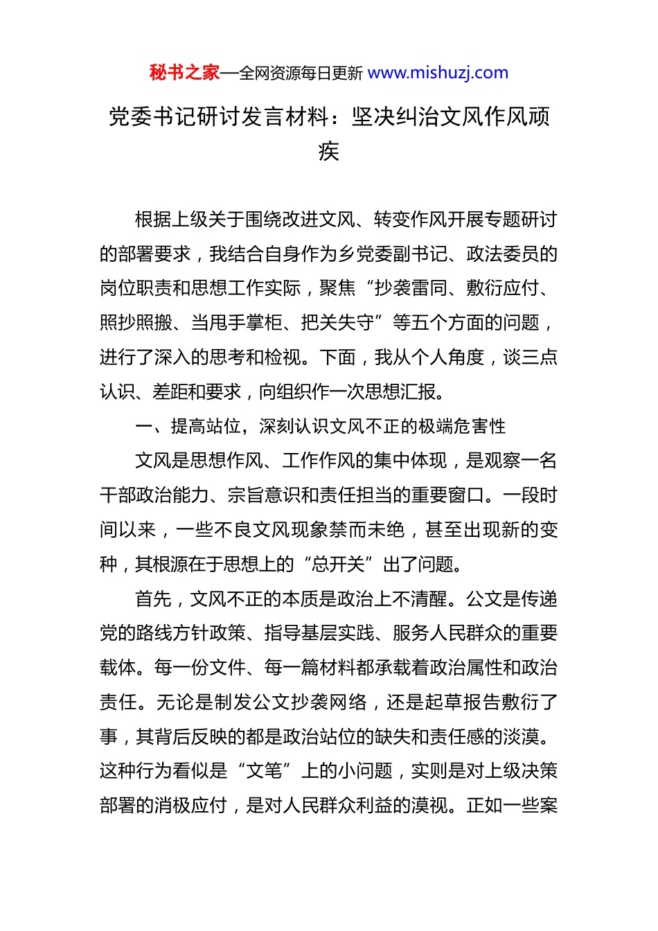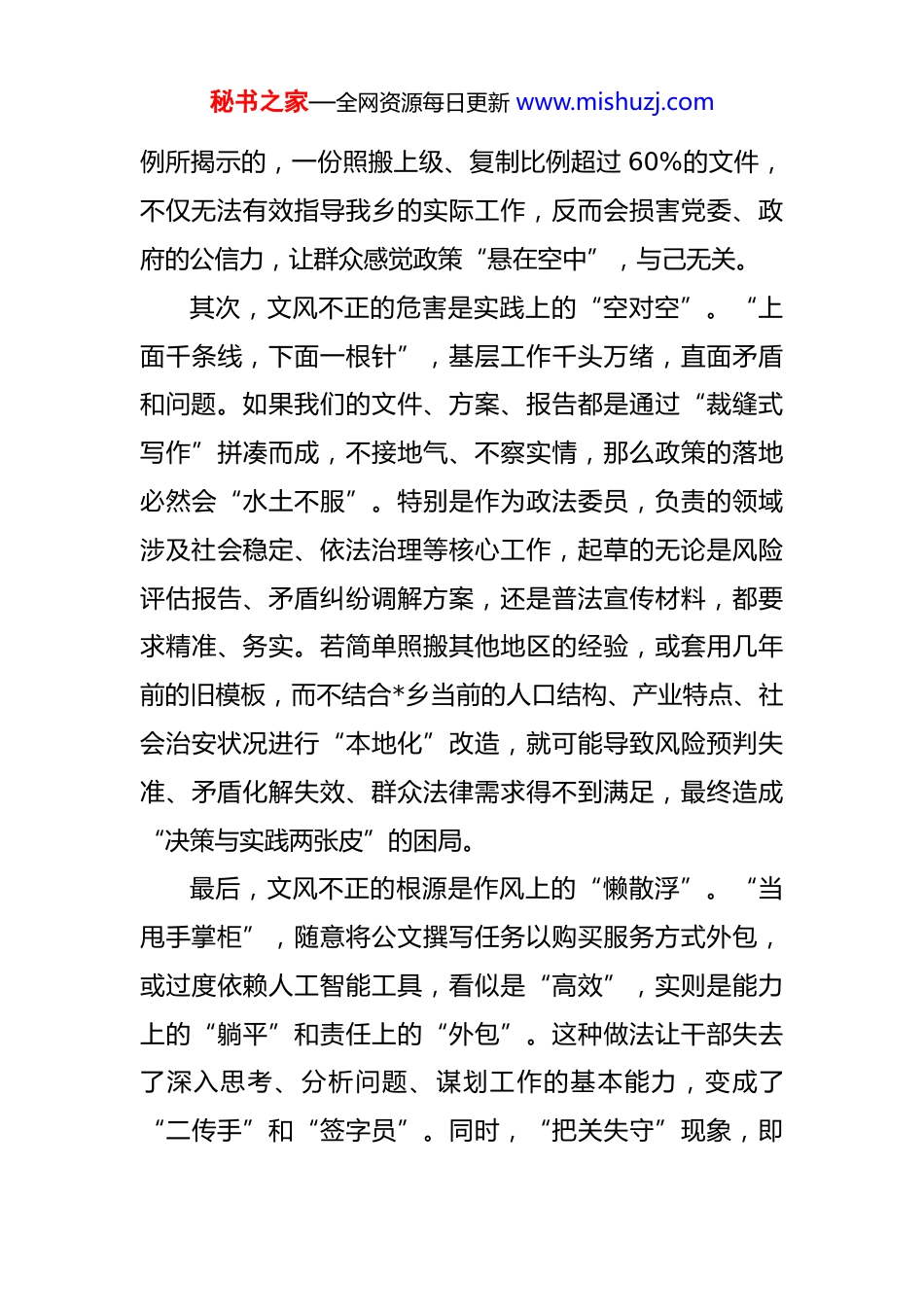秘书之家—全网资源每日更新 www.mishuzj.com党委书记研讨发言材料:坚决纠治文风作风顽疾 根据上级关于围绕改进文风、转变作风开展专题研讨的部署要求,我结合自身作为乡党委副书记、政法委员的岗位职责和思想工作实际,聚焦“抄袭雷同、敷衍应付、照抄照搬、当甩手掌柜、把关失守”等五个方面的问题,进行了深入的思考和检视。下面,我从个人角度,谈三点认识、差距和要求,向组织作一次思想汇报。一、提高站位,深刻认识文风不正的极端危害性文风是思想作风、工作作风的集中体现,是观察一名干部政治能力、宗旨意识和责任担当的重要窗口。一段时间以来,一些不良文风现象禁而未绝,甚至出现新的变种,其根源在于思想上的“总开关”出了问题。首先,文风不正的本质是政治上不清醒。公文是传递党的路线方针政策、指导基层实践、服务人民群众的重要载体。每一份文件、每一篇材料都承载着政治属性和政治责任。无论是制发公文抄袭网络,还是起草报告敷衍了事,其背后反映的都是政治站位的缺失和责任感的淡漠。这种行为看似是“文笔”上的小问题,实则是对上级决策部署的消极应付,是对人民群众利益的漠视。正如一些案秘书之家—全网资源每日更新 www.mishuzj.com例所揭示的,一份照搬上级、复制比例超过 60%的文件,不仅无法有效指导我乡的实际工作,反而会损害党委、政府的公信力,让群众感觉政策“悬在空中”,与己无关。其次,文风不正的危害是实践上的“空对空”。“上面千条线,下面一根针”,基层工作千头万绪,直面矛盾和问题。如果我们的文件、方案、报告都是通过“裁缝式写作”拼凑而成,不接地气、不察实情,那么政策的落地必然会“水土不服”。特别是作为政法委员,负责的领域涉及社会稳定、依法治理等核心工作,起草的无论是风险评估报告、矛盾纠纷调解方案,还是普法宣传材料,都要求精准、务实。若简单照搬其他地区的经验,或套用几年前的旧模板,而不结合*乡当前的人口结构、产业特点、社会治安状况进行“本地化”改造,就可能导致风险预判失准、矛盾化解失效、群众法律需求得不到满足,最终造成“决策与实践两张皮”的困局。最后,文风不正的根源是作风上的“懒散浮”。“当甩手掌柜”,随意将公文撰写任务以购买服务方式外包,或过度依赖人工智能工具,看似是“高效”,实则是能力上的“躺平”和责任上的“外包”。这种做法让干部失去了深入思考、分析问题、谋划工作的基本能力,变成了“二传手”和“签字员”。同时,“把关失守”现象,即秘书之家—全网资源每日更新 www.mishuzj.com审核流程流于形式,责任链条断裂,更是这种“懒散浮”作风的集中爆发。一个环节的疏忽,可能导致一份充满逻辑谬误、事实错误甚至导向偏差的文件被印发,其造成的负面影响难以估量。这警示我们,改进文风必须先从转变思想作风入手,力戒形式主义、官僚主义。二、对标自省,深入查摆自身存在的差距与不足对照上级指出的五个方面问题,我坚持把自己摆进去、把职责摆进去、把工作摆进去,进行了严肃的自我剖析,发现自身在思想深处、工作细节上仍存在不小的差距。一是在抵制“抄袭敷衍”上,思想警惕性不够高。在日常工作中,我本人能够坚守底线,做到不抄袭、不剽窃。但在审核把关分管领域干部提交的材料时,有时会不自觉地陷入“经验主义”和“实用主义”。比如,在审核一些常规性的工作总结、学习体会时,更多地关注格式是否规范、要点是否齐全,而对于文字背后是否存在简单复制粘贴、套用模板的“痕迹”辨别不够敏锐,挖掘不够深入。有时看到一些表述似曾相识,也可能因为工作繁忙、时间紧迫,只作了简单修改,未能一追到底、严肃指出,客观上对“裁缝式写作”的现象存在一定的宽容度,未能起到“防火墙”和“过滤器”的应有作用。秘书之家—全网资源每日更新 www.mishuzj.com二是在克服“照抄照搬”上,主动作为的创新劲头不足。作为政法委员,我经常需要传达和落实上级关于平安建设、市域社会治理、法治政府建设等方面的文件精神。在工作中,我深刻认识到“上下一般粗”的危害。但在具体实践中,有时为了追求落实的“速度”和“准确度”,会下意识地选择最“保险”的方式,...