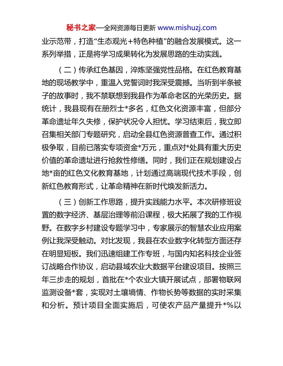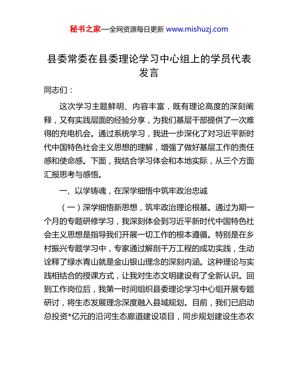 秘书之家—全网资源每日更新 www.mishuzj.com县委常委在县委理论学习中心组上的学员代表发言同志们:这次学习主题鲜明、内容丰富,既有理论高度的深刻阐释,又有实践层面的经验分享,为我们基层干部提供了一次难得的充电机会。通过系统学习,我进一步深化了对习近平新时代中国特色社会主义思想的理解,增强了做好基层工作的责任感和使命感。下面,我结合学习体会和本地实际,从三个方面汇报思考与感悟。一、以学铸魂,在深学细悟中筑牢政治忠诚(一)深学细悟新思想,筑牢政治理论根基。通过为期一个月的专题研修学习,我深刻体会到习近平新时代中国特色社会主义思想是指导我们开展一切工作的根本遵循。特别是在乡村振兴专题学习中,专家通过解剖千万工程的成功实践,生动诠释了绿水青山就是金山银山理念的深刻内涵。这种理论与实践相结合的授课方式,让我对生态文明建设有了全新认识。回到工作岗位后,我第一时间组织县委理论学习中心组开展专题研讨,将生态发展理念深度融入县域规划。目前,我们已启动总投资*亿元的沿河生态廊道建设项目,同步规划建设生态农秘书之家—全网资源每日更新 www.mishuzj.com“业示范带,打造 生态观光+”特色种植 的融合发展模式。这一系列举措,正是将学习成果转化为发展思路的生动实践。(二)传承红色基因,淬炼坚强党性品格。在红色教育基地的现场教学中,重温入党誓词时我深受震撼。当听到半条被子的故事时,我不禁联想到我县作为革命老区的光荣历史。据统计,我县现有在册烈士*多名,红色文化资源丰富,但部分革命遗址年久失修,保护状况令人担忧。学习结束后,我立即召集相关部门专题研究,启动全县红色资源普查工作。通过积极争取,目前已落实专项资金*万元,重点对*处具有重大历史价值的革命遗址进行抢救性修缮。同时,我们正在规划建设占地*亩的红色文化教育基地,计划通过高端现代技术手段,创新红色教育形式,让革命精神在新时代焕发新活力。(三)创新工作思路,提升实践能力水平。本次研修班设置的数字经济、基层治理等前沿课程,极大拓展了我的工作视野。在数字乡村建设专题学习中,专家展示的智慧农业应用案例让我深受触动。对比发现,我县在农业数字化转型方面还存在明显短板。我们迅速组建工作专班,与国内知名科技企业签订战略合作协议,启动县域农业大数据平台建设项目。按照三年三步走的规划,首批在*个农业大镇开展试点,部署物联网监测设备*套,实现对土壤墒情、作物长势等数据的实时采集和分析。预计项目全面实施后,可使农产品产量提升*%以秘书之家—全网资源每日更新 www.mishuzj.com上,带动农民人均增收*元。这一创新实践,充分体现了学习培训对提升领导干部能力素质的重要作用。二、以学促干,在知行合一中推动高质量发展(一)加快产业转型升级,激发县域经济新活力。通过系统学习新质生产力理论,我们深刻认识到传统农业大县必须走出一条转型升级的新路子。立足我县粮油、果蔬、中药材三大主导产业,我们制定了三个转型发展战略,一是推动种植基地向标准化转型,投资*亿元建设万亩数字农业示范园,配套智能灌溉、无人机植保等现代化设施,实现亩均节本增效*%以上;二是推动加工环节向精深化转型,成功引进国内领先的果蔬脆片加工企业,建设年产*万吨的现代化生产线,预计年产值可达*亿元;三是推动销售模式向品牌化转型,注册*山珍区域公用品牌,整合全县优质农产品资源,在京东、拼多多等平台开设旗舰店,上半年线上销售额突破*万元。通过全产业链升级,今年 1-6 月全县农产品加工产值同比增长*%,带动就业*余人,农民人均增收*元,走出了一条科技赋能、品牌引领、三产融合的现代农业发展新路径。(二)创新基层治理模式,打造共建共治新样板。深入学习新时代枫桥经验后,我们结合县域实际创新推行三治融合治理体系。在组织体系上,构建村党支部+网格党小组+党员中心户三级治理架构,选配*名党员担任网格长,实现小事不出网格、大事不出村;在矛盾调处上,全面推广村民议事会制秘书之家—全网资源每日更新 www.mishuzj.com度,每月定期召开议事会,通过群众说事、干部解题方式化解矛盾纠纷,上半年累计调处...
