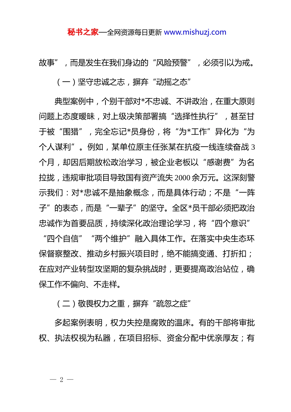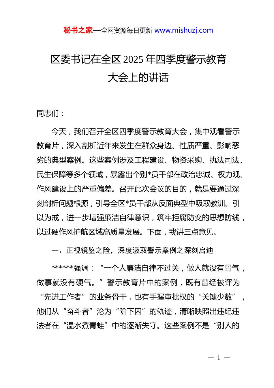 秘书之家—全网资源每日更新 www.mishuzj.com区委书记在全区 2025 年四季度警示教育大会上的讲话同志们:今天,我们召开全区四季度警示教育大会,集中观看警示教育片,深入剖析近年来发生在群众身边、性质严重、影响恶劣的典型案例。这些案例涉及工程建设、物资采购、执法司法、民生保障等多个领域,暴露出个别*员干部在政治忠诚、权力观、作风建设上的严重偏差。召开此次会议的目的,就是要通过深刻剖析问题根源,引导全区*员干部从反面典型中吸取教训、引以为戒,进一步增强廉洁自律意识,筑牢拒腐防变的思想防线,以过硬作风护航区域高质量发展。下面,我讲三点意见。一、正视镜鉴之险,深度汲取警示案例之深刻启迪******强调:“一个人廉洁自律不过关,做人就没有骨气,做事就没有硬气。”警示教育片中的案例,既有曾经被评为“先进工作者”的业务骨干,也有手握审批权的“关键少数”,他们从“奋斗者”沦为“阶下囚”的轨迹,清晰映照出违纪违法者在“温水煮青蛙”中的逐渐失守。这些案例不是“别人的— 1 —秘书之家—全网资源每日更新 www.mishuzj.com故事”,而是发生在我们身边的“风险预警”,必须引以为戒。(一)坚守忠诚之志,摒弃“动摇之态”典型案例中,个别干部对*不忠诚、不讲政治,在重大原则问题上态度暧昧,对上级决策部署搞“选择性执行”,甚至甘于被“围猎”,完全忘记*员身份,将“为*工作”异化为“为个人谋利”。例如,某单位原主任张某在抗疫一线连续奋战 3个月,却因后期放松政治学习,被企业老板以“感谢费”为名拉拢,违规审批项目导致国有资产流失 2000 余万元。这深刻警示我们:对*忠诚不是抽象概念,而是具体行动;不是“一阵子”的表态,而是“一辈子”的坚守。全区*员干部必须把政治忠诚作为首要品质,持续深化政治理论学习,将“四个意识”“四个自信”“两个维护”融入具体工作。在落实中央生态环保督察整改、推动乡村振兴项目时,绝不能搞变通、打折扣;在应对产业转型攻坚期的复杂挑战时,更要提高政治站位,确保工作不偏向、不走样。(二)敬畏权力之重,摒弃“疏忽之症”多起案例表明,权力失控是腐败的温床。有的干部将审批权、执法权视为私器,在项目招标、资金分配中优亲厚友;有— 2 —秘书之家—全网资源每日更新 www.mishuzj.com的利用职务影响干预司法,破坏公平正义。******深刻指出:“我们的权力是*和人民赋予的,是为*和人民做事用的,只能用来为*分忧、为国干事、为民谋利。”对此,我们要健全权力运行制约机制,严格执行“三重一大”决策程序,聚焦财政资金、工程建设等高危领域,推行权力清单公开,主动接受群众监督。区住建局需完善工程招投标全程留痕制度,区财政局要强化专项资金绩效审计,让权力在阳光下运行。同时,要坚决查处“有权不履责、赋权便滥用、用权谋私利”等行为,防止权力异化为谋取私利的工具。(三)锤炼作风之实,摒弃“细微之论”******警示要“稳得住心神、管得住行为、守得住清白”。作风问题无小事,案例中部分干部从接受一顿饭、收受一张卡开始,逐渐迷失自我,最终陷入“从酒水到泪水、从豪车到警车、从贪欲到监狱”的深渊。我们要以纪律规定精神为铁规矩,重点整治“吃喝风”“关系案”等顽疾。区市场监管局需严查利用职权吃拿卡要行为,街道社区要杜绝惠民资金发放中的优亲厚友。同时,大力弘扬“短实新”文风、“干实事”会风,将作风建设融入日常考核,对“躺平式”干部坚决调整。要深刻认识到“不拘小节”的危害,从身边小事做起,养成慎独慎— 3 —秘书之家—全网资源每日更新 www.mishuzj.com微的习惯,真正做到“不该交的朋友不交、不该去的场所不去、不该用的权力不用、不该帮的请托不帮”。二、剖析根源之痛,全面洞察违法违纪之深层诱因******指出:“要坚持*性*风 dj 一起抓,从思想上固本培元,提高*性觉悟,增强拒腐防变能力。”案例背后的根源错综复杂,既有个人思想蜕变,也有制度漏洞和监督缺失因素,必须系统施治、标本兼治。(一)思想滑坡是腐败根源,必须强化理想信念教育涉事干部普遍存在理论学习浮于表面、*性教育缺位等问题,导致价值观扭曲。我们要...
