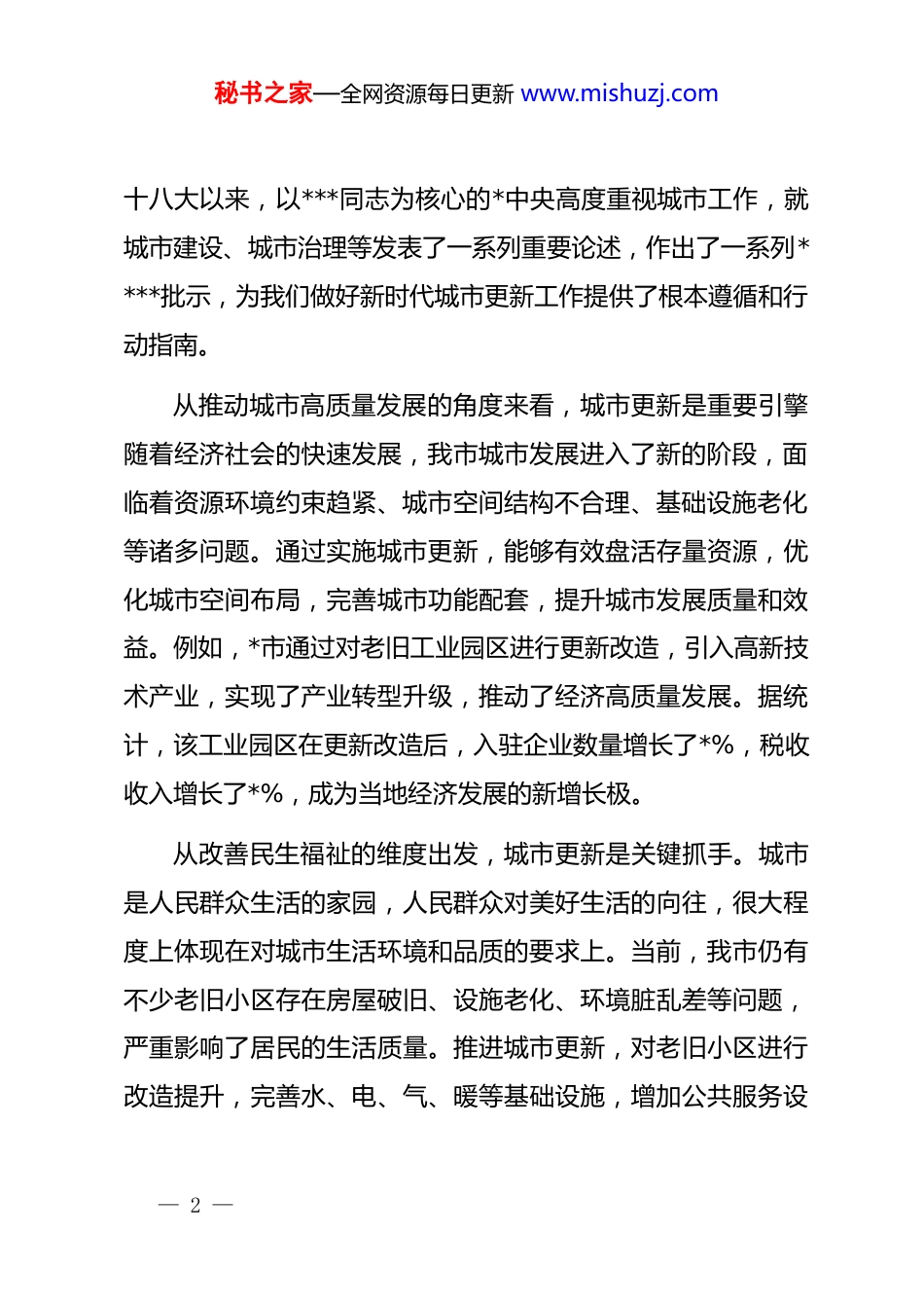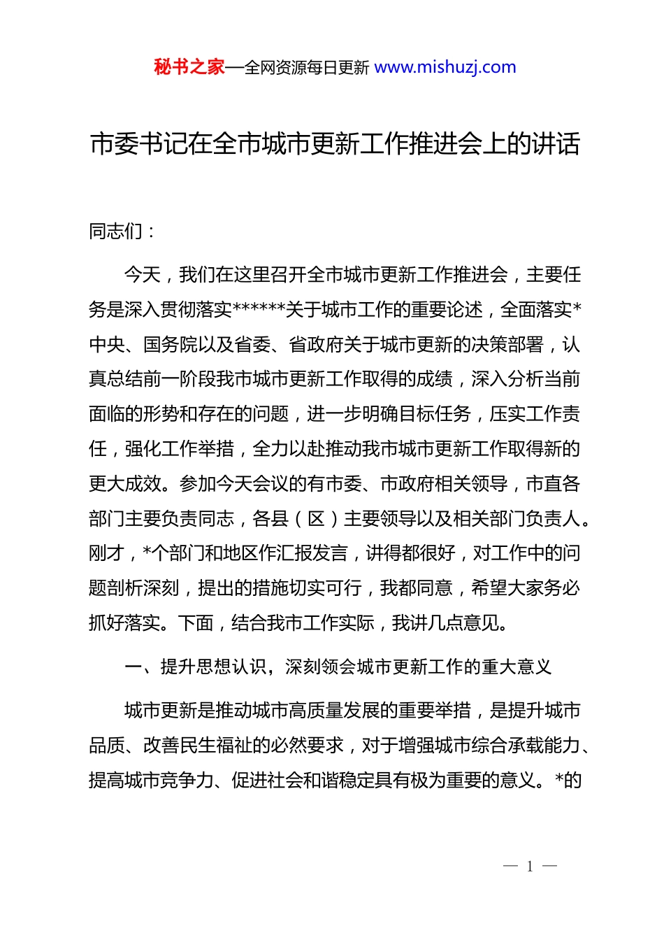 秘书之家—全网资源每日更新 www.mishuzj.com市委书记在全市城市更新工作推进会上的讲话同志们:今天,我们在这里召开全市城市更新工作推进会,主要任务是深入贯彻落实******关于城市工作的重要论述,全面落实*中央、国务院以及省委、省政府关于城市更新的决策部署,认真总结前一阶段我市城市更新工作取得的成绩,深入分析当前面临的形势和存在的问题,进一步明确目标任务,压实工作责任,强化工作举措,全力以赴推动我市城市更新工作取得新的更大成效。参加今天会议的有市委、市政府相关领导,市直各部门主要负责同志,各县(区)主要领导以及相关部门负责人。刚才,*个部门和地区作汇报发言,讲得都很好,对工作中的问题剖析深刻,提出的措施切实可行,我都同意,希望大家务必抓好落实。下面,结合我市工作实际,我讲几点意见。一、提升思想认识,深刻领会城市更新工作的重大意义城市更新是推动城市高质量发展的重要举措,是提升城市品质、改善民生福祉的必然要求,对于增强城市综合承载能力、提高城市竞争力、促进社会和谐稳定具有极为重要的意义。*的— 1 —秘书之家—全网资源每日更新 www.mishuzj.com十八大以来,以***同志为核心的*中央高度重视城市工作,就城市建设、城市治理等发表了一系列重要论述,作出了一系列****批示,为我们做好新时代城市更新工作提供了根本遵循和行动指南。从推动城市高质量发展的角度来看,城市更新是重要引擎随着经济社会的快速发展,我市城市发展进入了新的阶段,面临着资源环境约束趋紧、城市空间结构不合理、基础设施老化等诸多问题。通过实施城市更新,能够有效盘活存量资源,优化城市空间布局,完善城市功能配套,提升城市发展质量和效益。例如,*市通过对老旧工业园区进行更新改造,引入高新技术产业,实现了产业转型升级,推动了经济高质量发展。据统计,该工业园区在更新改造后,入驻企业数量增长了*%,税收收入增长了*%,成为当地经济发展的新增长极。从改善民生福祉的维度出发,城市更新是关键抓手。城市是人民群众生活的家园,人民群众对美好生活的向往,很大程度上体现在对城市生活环境和品质的要求上。当前,我市仍有不少老旧小区存在房屋破旧、设施老化、环境脏乱差等问题,严重影响了居民的生活质量。推进城市更新,对老旧小区进行改造提升,完善水、电、气、暖等基础设施,增加公共服务设— 2 —秘书之家—全网资源每日更新 www.mishuzj.com施,能够显著改善居民的居住条件,让人民群众共享城市发展成果。比如,*区*老旧小区改造项目,通过对小区道路、绿化、停车位等进行改造,新增了健身设施、社区服务中心等公共服务设施,居民的生活环境得到了极大改善,居民的满意度达到了*%以上。从提升城市形象和竞争力的层面考量,城市更新是有力支撑。在区域竞争日益激烈的今天,城市形象和竞争力已成为吸引人才、资金、技术等要素资源的重要因素。一个功能完善、环境优美、富有活力的城市,能够更好地吸引各类资源集聚,提升城市的影响力和辐射力。通过城市更新,打造高品质的城市空间,塑造独特的城市风貌,能够提升城市的形象和美誉度,增强城市的综合竞争力。以*市为例,该市通过实施城市更新行动,打造了一批具有特色的城市街区和景观,吸引了大量游客和投资,城市知名度和竞争力大幅提升。二、聚焦工作重点,全力推动城市更新工作取得实效(一)加强统筹规划,科学引领城市更新。科学合理地规划是城市更新工作顺利推进的前提和基础。我们要立足全市发展大局,加强统筹谋划,坚持高起点规划、高标准设计,确保城市更新工作符合城市发展规律和人民群众需求。一是完善城— 3 —秘书之家—全网资源每日更新 www.mishuzj.com市更新规划体系。要加快编制全市城市更新专项规划,明确城市更新的总体目标、重点任务、实施步骤和保障措施。同时,要指导各县(区)结合自身实际,编制本地区城市更新规划,形成上下衔接、相互协调的城市更新规划体系。在规划编制过程中,要充分征求社会各界的意见和建议,提高规划的科学性、民主性和可操作性。例如,*市在编制城市更新规划时,通过召开座谈会、问卷调查等方式,广泛征求了居民、...