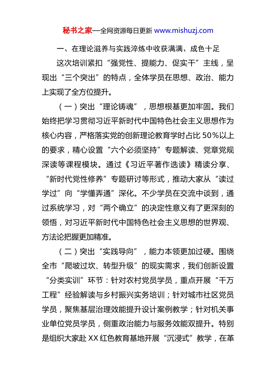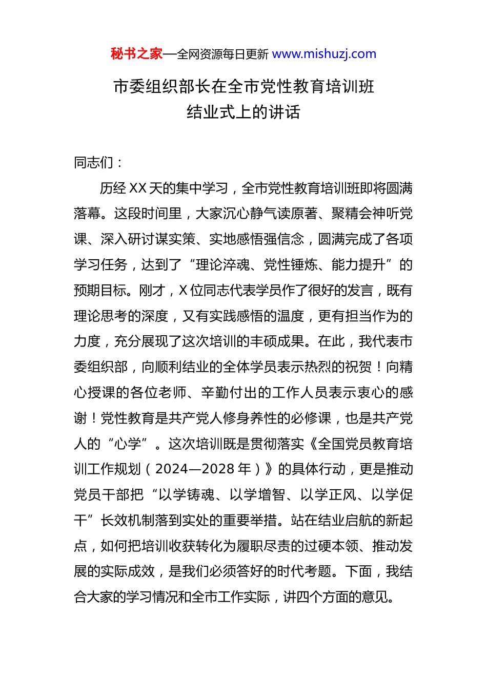 秘书之家—全网资源每日更新 www.mishuzj.com市委组织部长在全市党性教育培训班结业式上的讲话 同志们:历经 XX 天的集中学习,全市党性教育培训班即将圆满落幕。这段时间里,大家沉心静气读原著、聚精会神听党课、深入研讨谋实策、实地感悟强信念,圆满完成了各项学习任务,达到了“理论淬魂、党性锤炼、能力提升”的预期目标。刚才,X 位同志代表学员作了很好的发言,既有理论思考的深度,又有实践感悟的温度,更有担当作为的力度,充分展现了这次培训的丰硕成果。在此,我代表市委组织部,向顺利结业的全体学员表示热烈的祝贺!向精心授课的各位老师、辛勤付出的工作人员表示衷心的感谢!党性教育是共产党人修身养性的必修课,也是共产党人的“心学”。这次培训既是贯彻落实《全国党员教育培训工作规划(2024—2028 年)》的具体行动,更是推动党员干部把“以学铸魂、以学增智、以学正风、以学促干”长效机制落到实处的重要举措。站在结业启航的新起点,如何把培训收获转化为履职尽责的过硬本领、推动发展的实际成效,是我们必须答好的时代考题。下面,我结合大家的学习情况和全市工作实际,讲四个方面的意见。秘书之家—全网资源每日更新 www.mishuzj.com一、在理论滋养与实践淬炼中收获满满、成色十足这次培训紧扣“强党性、提能力、促实干”主线,呈现出“三个突出”的特点,全体学员在思想、政治、能力上实现了全方位提升。(一)突出“理论铸魂”,思想根基更加牢固。我们始终把学习贯彻习近平新时代中国特色社会主义思想作为核心内容,严格落实党的创新理论教育学时占比 50%以上的要求,精心设置“六个必须坚持”专题解读、党章党规深读等课程模块。通过《习近平著作选读》精读分享、“新时代党性修养”专题研讨等形式,推动大家从“读过学过”向“学懂弄通”深化。不少学员在交流中谈到,通过系统学习,对“两个确立”的决定性意义有了更深刻的领悟,对习近平新时代中国特色社会主义思想的世界观、方法论把握更加精准。(二)突出“实践导向”,能力本领更加过硬。围绕全市“爬坡过坎、转型升级”的现实需求,我们创新设置“分类实训”环节:针对农村党员学员,重点开展“千万工程”经验解读与乡村振兴实务培训;针对城市社区党员学员,聚焦基层治理效能提升设计案例教学;针对机关事业单位党员学员,侧重政治能力与服务效能双提升。特别是组织大家赴 XX 红色教育基地开展“沉浸式”教学,在革秘书之家—全网资源每日更新 www.mishuzj.com命先辈的奋斗事迹中感悟初心使命;深入重点项目现场进行“体验式”调研,在发展一线寻找解题思路。从培训成效看,大家普遍反映,这种“理论+实践”的模式,既补了“思想之钙”,又充了“能力之电”,面对实际工作中的“硬骨头”更有底气了。(三)突出“从严治学”,作风形象更加严实。我们严格落实学员管理规定,实行“每日考勤、每周小结、结业考评”制度,组建临时党支部强化自我管理,确保培训不走过场。从日常督查情况看,全体学员都能迅速实现“角色转换”,主动放下事务、静下心来学习,课堂上专心听讲、研讨中踊跃发言、调研时深入思考。有几位来自基层的学员,白天参加集中学习,晚上还在宿舍整理笔记、查阅资料,这种求知若渴的态度令人感动。更可贵的是,大家严格遵守中央八项规定精神,不搞迎来送往,不搞人情往来,展现了新时代党员干部的良好风貌。可以说,这次培训不是“一阵风”的学习,而是“沉浸式”的淬炼;不是“填鸭式”的灌输,而是“启发式”的提升。大家的收获,既有理论上的清醒,更有政治上的坚定;既有思想上的共鸣,更有行动上的自觉,为回到工作岗位后践行初心使命筑牢了坚实基础。二、在对标对表与自我检视中明晰方向、凝聚共识秘书之家—全网资源每日更新 www.mishuzj.com党性修养没有终点,只有连续不断的新起点。通过这次培训,大家对“什么是党性、如何强党性”有了更深刻的认识,这是最宝贵的精神财富。结合大家的学习感悟,我认为关键要把握好“三个维度”:(一)党性是“绝对忠诚”的政治品格,必须体现在“两个维护”的行动中。习近平总书记强调,“对党忠诚,必须是纯粹的、...