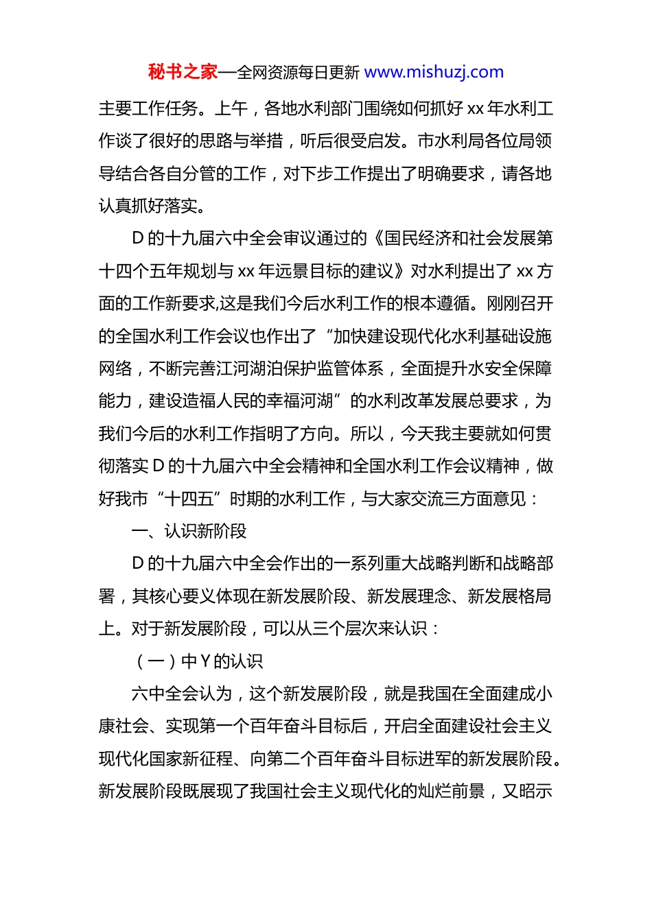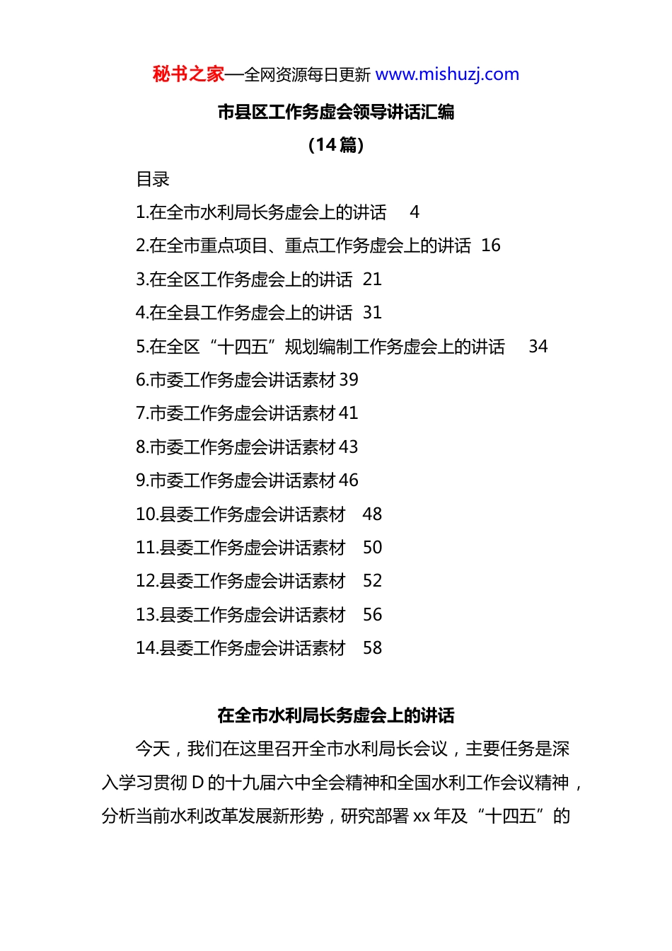 秘书之家—全网资源每日更新 www.mishuzj.com市县区工作务虚会领导讲话汇编(14 篇)目录1.在全市水利局长务虚会上的讲话42.在全市重点项目、重点工作务虚会上的讲话 163.在全区工作务虚会上的讲话 214.在全县工作务虚会上的讲话 315.在全区“十四五”规划编制工作务虚会上的讲话346.市委工作务虚会讲话素材 397.市委工作务虚会讲话素材 418.市委工作务虚会讲话素材 439.市委工作务虚会讲话素材 4610.县委工作务虚会讲话素材4811.县委工作务虚会讲话素材5012.县委工作务虚会讲话素材5213.县委工作务虚会讲话素材5614.县委工作务虚会讲话素材58在全市水利局长务虚会上的讲话今天,我们在这里召开全市水利局长会议,主要任务是深入学习贯彻 D 的十九届六中全会精神和全国水利工作会议精神,分析当前水利改革发展新形势,研究部署 xx 年及“十四五”的秘书之家—全网资源每日更新 www.mishuzj.com主要工作任务。上午,各地水利部门围绕如何抓好 xx 年水利工作谈了很好的思路与举措,听后很受启发。市水利局各位局领导结合各自分管的工作,对下步工作提出了明确要求,请各地认真抓好落实。D 的十九届六中全会审议通过的《国民经济和社会发展第十四个五年规划与 xx 年远景目标的建议》对水利提出了 xx 方面的工作新要求,这是我们今后水利工作的根本遵循。刚刚召开的全国水利工作会议也作出了“加快建设现代化水利基础设施网络,不断完善江河湖泊保护监管体系,全面提升水安全保障能力,建设造福人民的幸福河湖”的水利改革发展总要求,为我们今后的水利工作指明了方向。所以,今天我主要就如何贯彻落实 D 的十九届六中全会精神和全国水利工作会议精神,做好我市“十四五”时期的水利工作,与大家交流三方面意见:一、认识新阶段D 的十九届六中全会作出的一系列重大战略判断和战略部署,其核心要义体现在新发展阶段、新发展理念、新发展格局上。对于新发展阶段,可以从三个层次来认识:(一)中 Y 的认识六中全会认为,这个新发展阶段,就是我国在全面建成小康社会、实现第一个百年奋斗目标后,开启全面建设社会主义现代化国家新征程、向第二个百年奋斗目标进军的新发展阶段。新发展阶段既展现了我国社会主义现代化的灿烂前景,又昭示秘书之家—全网资源每日更新 www.mishuzj.com了前进道路上的艰巨任务和风险挑战。把握新发展阶段,必须统筹中华民族伟大复兴战略全局和世界百年未有之大变局,深刻认识我国社会主要矛盾变化带来的新特征新要求,深刻认识错综复杂的国际环境带来的新矛盾新挑战,善于在危机中育先机、于变局中开新局,抓住机遇,应对挑战,趋利避害,奋勇前进。这个新发展阶段,还可以从多个维度进行理解。从现代化维度看,新发展阶段是全面建设社会主义现代化国家的发展阶段。从经济发展维度看,这个阶段的重要特征是我国经济已由高速增长阶段转向高质量发展阶段。从国家 ZHI 理维度看,新发展阶段是不断推进实现国家 ZHI 理体系和 ZHI 理能力现代化的阶段。(二)水利部的认识在今年的全国水利工作会议上,xx 部长提出,新发展阶段是中华民族伟大复兴历史进程的大跨越,水利工作必须在全面建设社会主义现代化国家全局中明确发展方位,在把握“两个大局”中明晰发展环境,准确识变、科学应变、主动求变。主要从两个方面来理解:一是进入新发展阶段意味着对水利工作提出新的要求。鄂部长提出,要深刻认识人民对美好生活的向往已呈现多样化、多层次、多方面的特点,把握好从“有没有”转向“好不好”这个关键,正确认识 ZHI 水主要矛盾变化,在更好解决水灾害问题的同时,下大力气解决水资源短缺、水秘书之家—全网资源每日更新 www.mishuzj.com生态损坏、水环境污染等问题,更好地满足人民对美好生活的向往。二是进入新发展阶段意味着水利工作需要全面提升标准。具体来讲,就是在持久水安全、优质水资源、健康水生态、宜居水环境、先进水文化等五个方提高标准,实现新的进步。(三)xx 水利工作的认识联系到 xx 水利工作实际,我们的水利事业也随着社会发展进程迈入了新阶段,是“十三五”圆满收官、“十四五”全面起航的新发展阶...