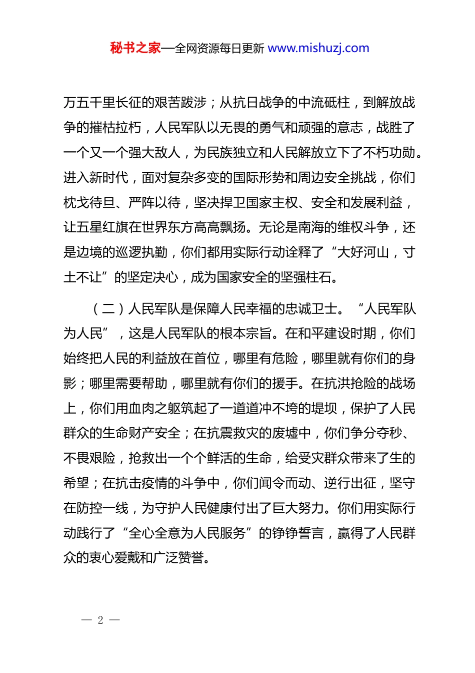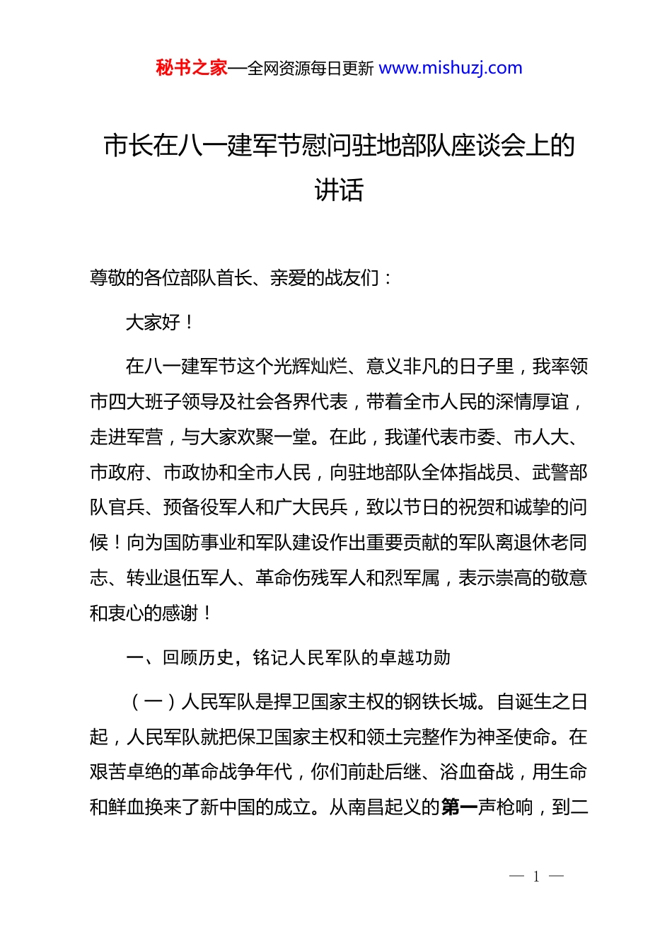 秘书之家—全网资源每日更新 www.mishuzj.com市长在八一建军节慰问驻地部队座谈会上的讲话尊敬的各位部队首长、亲爱的战友们:大家好!在八一建军节这个光辉灿烂、意义非凡的日子里,我率领市四大班子领导及社会各界代表,带着全市人民的深情厚谊,走进军营,与大家欢聚一堂。在此,我谨代表市委、市人大、市政府、市政协和全市人民,向驻地部队全体指战员、武警部队官兵、预备役军人和广大民兵,致以节日的祝贺和诚挚的问候!向为国防事业和军队建设作出重要贡献的军队离退休老同志、转业退伍军人、革命伤残军人和烈军属,表示崇高的敬意和衷心的感谢!一、回顾历史,铭记人民军队的卓越功勋(一)人民军队是捍卫国家主权的钢铁长城。自诞生之日起,人民军队就把保卫国家主权和领土完整作为神圣使命。在艰苦卓绝的革命战争年代,你们前赴后继、浴血奋战,用生命和鲜血换来了新中国的成立。从南昌起义的第一声枪响,到二— 1 —秘书之家—全网资源每日更新 www.mishuzj.com万五千里长征的艰苦跋涉;从抗日战争的中流砥柱,到解放战争的摧枯拉朽,人民军队以无畏的勇气和顽强的意志,战胜了一个又一个强大敌人,为民族独立和人民解放立下了不朽功勋。进入新时代,面对复杂多变的国际形势和周边安全挑战,你们枕戈待旦、严阵以待,坚决捍卫国家主权、安全和发展利益,让五星红旗在世界东方高高飘扬。无论是南海的维权斗争,还是边境的巡逻执勤,你们都用实际行动诠释了“大好河山,寸土不让”的坚定决心,成为国家安全的坚强柱石。(二)人民军队是保障人民幸福的忠诚卫士。“人民军队为人民”,这是人民军队的根本宗旨。在和平建设时期,你们始终把人民的利益放在首位,哪里有危险,哪里就有你们的身影;哪里需要帮助,哪里就有你们的援手。在抗洪抢险的战场上,你们用血肉之躯筑起了一道道冲不垮的堤坝,保护了人民群众的生命财产安全;在抗震救灾的废墟中,你们争分夺秒、不畏艰险,抢救出一个个鲜活的生命,给受灾群众带来了生的希望;在抗击疫情的斗争中,你们闻令而动、逆行出征,坚守在防控一线,为守护人民健康付出了巨大努力。你们用实际行动践行了“全心全意为人民服务”的铮铮誓言,赢得了人民群众的衷心爱戴和广泛赞誉。— 2 —秘书之家—全网资源每日更新 www.mishuzj.com(三)人民军队是推动地方发展的强大动力。长期以来,驻地部队在完成军事任务的同时,积极支持和参与地方经济建设,为地方发展作出了重要贡献。你们充分发挥自身优势,在基础设施建设、扶贫攻坚、生态保护等方面发挥了重要作用。在脱贫攻坚战场上,你们与贫困群众结对帮扶,出资出物、出谋划策,帮助贫困地区发展产业、改善民生,为如期打赢脱贫攻坚战贡献了力量;在生态保护方面,你们积极参与植树造林、环境整治等活动,为守护绿水青山、建设美丽家园发挥了积极作用;在军民融合发展领域,你们与地方企业开展深度合作,促进了科技交流和产业升级,为地方经济发展注入了新的活力。你们的无私奉献和辛勤付出,有力推动了地方经济社会高质量发展。二、立足当下,共叙军地深厚的鱼水情谊(一)军地共建成果丰硕。近年来,我市高度重视双拥工作,始终坚持军地合力、军民同心,不断巩固和发展军政军民团结的大好局面。我们深入开展双拥模范城创建活动,通过一系列扎实有效的工作举措,推动双拥工作取得了显著成效。军地双方在基础设施建设、文化教育、医疗卫生等领域开展了广泛合作,实现了资源共享、优势互补。驻地部队积极支持地方— 3 —秘书之家—全网资源每日更新 www.mishuzj.com建设,为地方发展排忧解难;地方*委政府关心关爱部队官兵,全力做好拥军优属工作,为部队建设创造了良好条件。军地双方相互理解、相互支持、相互配合,形成了“军爱民、民拥军,军民团结一家亲”的浓厚氛围。(二)拥军优属政策落实有力。我们始终把落实拥军优属政策作为双拥工作的重要内容,不断加大工作力度,确保各项政策落到实处。在转业安置方面,我们坚持阳光安置、公平公正,积极拓宽安置渠道,提高安置质量,让转业军人能够人尽其才、才尽其用;在随军家属就业方面,我们通过举办专场招聘会、提供公...