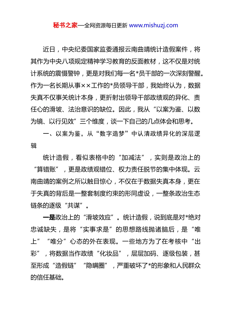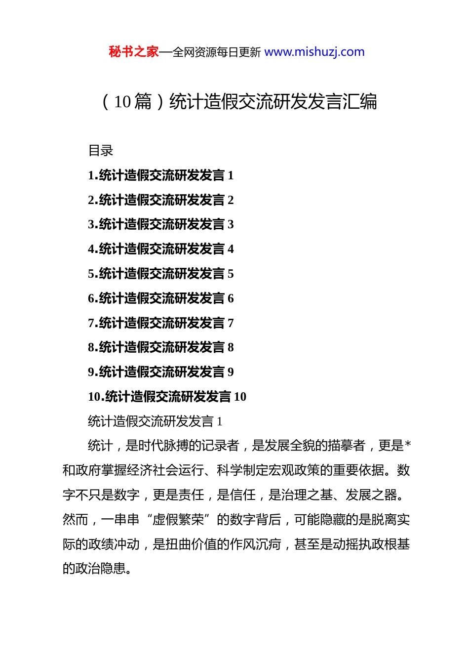秘书之家—全网资源每日更新 www.mishuzj.com(10 篇)统计造假交流研发发言汇编目录1.统计造假交流研发发言 12.统计造假交流研发发言 23.统计造假交流研发发言 34.统计造假交流研发发言 45.统计造假交流研发发言 56.统计造假交流研发发言 67.统计造假交流研发发言 78.统计造假交流研发发言 89.统计造假交流研发发言 910.统计造假交流研发发言 10统计造假交流研发发言 1统计,是时代脉搏的记录者,是发展全貌的描摹者,更是*和政府掌握经济社会运行、科学制定宏观政策的重要依据。数字不只是数字,更是责任,是信任,是治理之基、发展之器。然而,一串串“虚假繁荣”的数字背后,可能隐藏的是脱离实际的政绩冲动,是扭曲价值的作风沉疴,甚至是动摇执政根基的政治隐患。秘书之家—全网资源每日更新 www.mishuzj.com近日,中央纪委国家监委通报云南曲靖统计造假案件,将其作为中央八项规定精神学习教育的反面教材,这不仅是对统计系统的震慑警钟,更是对我们每一名*员干部的一次深刻警醒。作为一名长期从事××工作的*员领导干部,我始终认为,数据失真不仅事关统计本身,更折射出领导干部政绩观的异化、责任心的滑坡、法治意识的缺位。因此,我从“以案为鉴、以数为镜、以行见效”三个维度,谈一下自己的几点体会和思考。一、以案为鉴,从“数字造梦”中认清政绩异化的深层逻辑统计造假,看似表格中的“加减法”,实则是政治上的“算错账”,更是政绩观错位、权力责任脱节的集中体现。云南曲靖的案例之所以触目惊心,不仅在于数据失真本身,更在于失真的背后是一整套制度约束的形同虚设,一整条政治生态链条的逐级“共谋”。一是政治上的“滑坡效应”。统计造假,说到底是对*绝对忠诚缺失,是将“实事求是”的思想路线抛诸脑后,是“唯上”“唯分”心态的外在表现。一些地方为了在考核中“出彩”,将数据当作政绩“化妆品”,层层加码、逐级包装,甚至形成“造假链”“隐瞒圈”,严重破坏了*的形象和人民群众的信任基础。秘书之家—全网资源每日更新 www.mishuzj.com二是作风上的“顽疾显现”。形式主义、官僚主义以新的形态悄然渗透,一些干部只图报表好看、不顾实际发展,只想“上头满意”,不管群众感受;基层统计人员则在多重压力之下“唯上是从”,在数据处理上掺水注水、弄虚作假,久而久之,数字和现实脱钩,台账和民生“两张皮”。三是制度上的“失守失衡”。从数据采集到审核发布,原本应有的制度“关口”一一沦陷,责任不清、问责不明、监督不力,“只报不查”“只看报表”的现象比比皆是。一旦容忍“数字漂白”的存在,就等于为“带病政绩”打开了方便之门,也为风腐问题埋下了制度隐患。曲靖之“病”,不仅在于其错,更在于它戳中了当下部分干部对政绩的扭曲认知。我们必须深刻汲取其中教训,把反对统计造假上升到政治纪律的高度来认识、来推进。二、以数为镜,在“真实数据”中校准发展导向与治理坐标数字是干部行为的“映像”,是发展成效的“刻度”,更是群众感知的“温度计”。一个地方经济发展得好不好,百姓的获得感强不强,不在于报表有多“靓丽”,而在于数据能否映照真实,是否指导有方。一要强化“数字思维”,让数据真正成为科学决策的依据。秘书之家—全网资源每日更新 www.mishuzj.com*的二十大报告提出,要健全统计体系,强化统计监督。我们要扭转“唯数是从”的惯性,构建反映高质量发展要求的指标体系,坚持用数据说话、用实情决策,在真实中发现问题、在问题中推动发展。二要提升“数据素养”,让干部切实做到识数懂数会用数从过去的“材料支撑型”向“数据驱动型”治理转变,推动各级领导干部掌握经济数据分析能力,善于从细微波动中把握趋势,从结构性变化中找准症结,让科学数据服务治理提效。三要完善“监管机制”,让假数彻底失去滋生蔓延的空间。推动各级统计、纪检、组织、审计等部门协同联动,对重点领域、重点指标开展交叉比对、穿透式监督、全流程审查。运用大数据、区块链等技术手段提升数据可追溯性,推动“留痕监管”常态化,真正让数据“跑不掉”“假不了”。如果说政治是方向、发展是路径,那么统计数据就是指南针。...