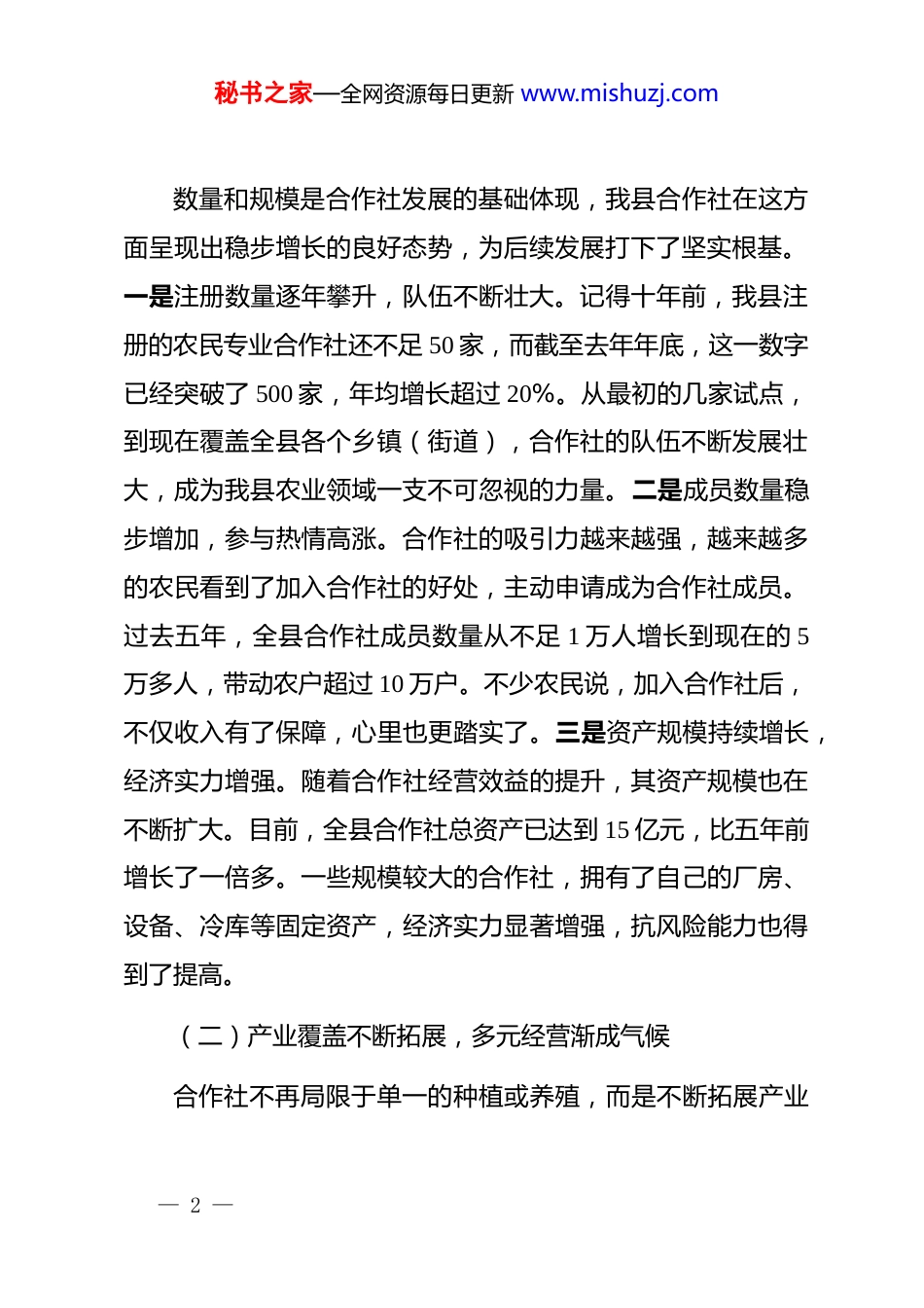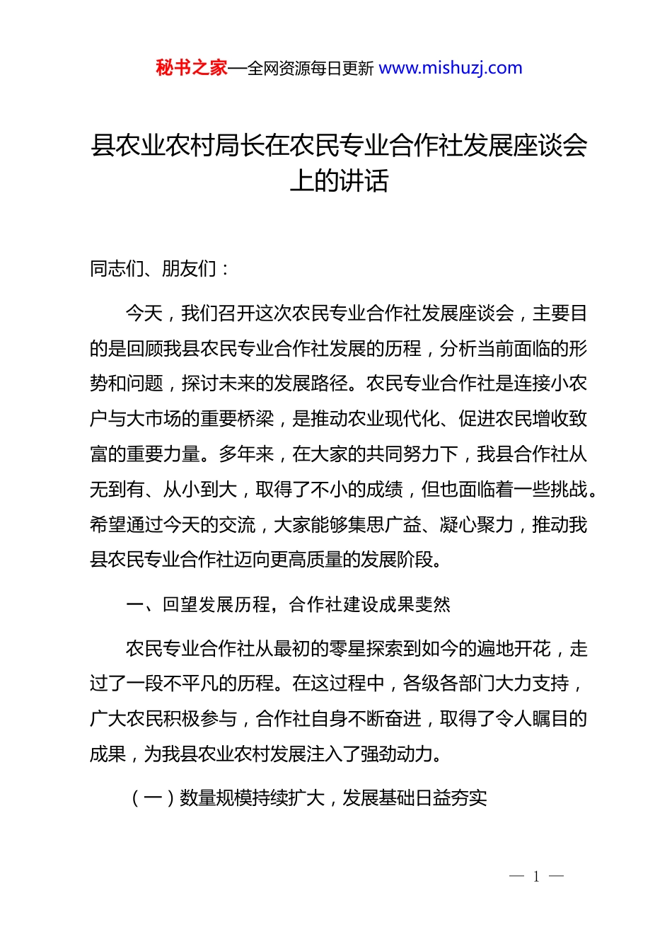 秘书之家—全网资源每日更新 www.mishuzj.com县农业农村局长在农民专业合作社发展座谈会上的讲话同志们、朋友们:今天,我们召开这次农民专业合作社发展座谈会,主要目的是回顾我县农民专业合作社发展的历程,分析当前面临的形势和问题,探讨未来的发展路径。农民专业合作社是连接小农户与大市场的重要桥梁,是推动农业现代化、促进农民增收致富的重要力量。多年来,在大家的共同努力下,我县合作社从无到有、从小到大,取得了不小的成绩,但也面临着一些挑战。希望通过今天的交流,大家能够集思广益、凝心聚力,推动我县农民专业合作社迈向更高质量的发展阶段。一、回望发展历程,合作社建设成果斐然农民专业合作社从最初的零星探索到如今的遍地开花,走过了一段不平凡的历程。在这过程中,各级各部门大力支持,广大农民积极参与,合作社自身不断奋进,取得了令人瞩目的成果,为我县农业农村发展注入了强劲动力。(一)数量规模持续扩大,发展基础日益夯实— 1 —秘书之家—全网资源每日更新 www.mishuzj.com数量和规模是合作社发展的基础体现,我县合作社在这方面呈现出稳步增长的良好态势,为后续发展打下了坚实根基。一是注册数量逐年攀升,队伍不断壮大。记得十年前,我县注册的农民专业合作社还不足 50 家,而截至去年年底,这一数字已经突破了 500 家,年均增长超过 20%。从最初的几家试点,到现在覆盖全县各个乡镇(街道),合作社的队伍不断发展壮大,成为我县农业领域一支不可忽视的力量。二是成员数量稳步增加,参与热情高涨。合作社的吸引力越来越强,越来越多的农民看到了加入合作社的好处,主动申请成为合作社成员。过去五年,全县合作社成员数量从不足 1 万人增长到现在的 5万多人,带动农户超过 10 万户。不少农民说,加入合作社后,不仅收入有了保障,心里也更踏实了。三是资产规模持续增长,经济实力增强。随着合作社经营效益的提升,其资产规模也在不断扩大。目前,全县合作社总资产已达到 15 亿元,比五年前增长了一倍多。一些规模较大的合作社,拥有了自己的厂房、设备、冷库等固定资产,经济实力显著增强,抗风险能力也得到了提高。(二)产业覆盖不断拓展,多元经营渐成气候合作社不再局限于单一的种植或养殖,而是不断拓展产业— 2 —秘书之家—全网资源每日更新 www.mishuzj.com领域,形成了多元经营的格局,为农业产业发展注入了新的活力。一是种植养殖全面发展,传统产业焕新颜。在种植业方面,从最初的粮食种植合作社,发展到现在涵盖蔬菜、水果、中药材、花卉等多个品种的合作社。比如,xx 镇的蔬菜种植合作社,通过统一管理、统一销售,使当地蔬菜产业规模不断扩大,产品远销周边多个省市。在养殖业方面,生猪、家禽、水产等养殖合作社也蓬勃发展,形成了规模化、标准化的养殖模式。二是加工流通同步推进,产业链条不断延伸。越来越多的合作社认识到,只做初级产品不行,必须延伸产业链条。于是,不少合作社开始涉足农产品加工领域,建设了农产品加工厂,对农产品进行清洗、包装、深加工等,提高了产品附加值。同时,合作社还积极发展流通业务,建立了自己的销售渠道,通过电商平台、批发市场、连锁超市等,将产品直接送到消费者手中。三是休闲农业融合发展,新业态崭露头角。随着乡村旅游的兴起,一些合作社结合自身资源优势,发展起了休闲农业。有的合作社开设了采摘园、农家乐,让城市居民体验农耕乐趣;有的合作社举办了农产品文化节、采摘节等活动,吸引了大量游客。休闲农业的发展,不仅增加了合作社的收入,也带动了当地乡村旅游的发展。— 3 —秘书之家—全网资源每日更新 www.mishuzj.com(三)带动效益逐步凸显,农户增收渠道拓宽合作社的发展,最终目的是带动农民增收致富。我县合作社在这方面发挥了重要作用,通过多种方式让农户分享发展成果。一是就业岗位有效增加,农民务工有保障。合作社的发展需要大量的劳动力,为当地农民提供了许多就业岗位。无论是种植、养殖环节,还是加工、销售环节,都吸纳了不少农民就业。据统计,全县合作社常年吸纳农民就业超过 2 万人,季节性用工更是达到 5 万人次以上。农...