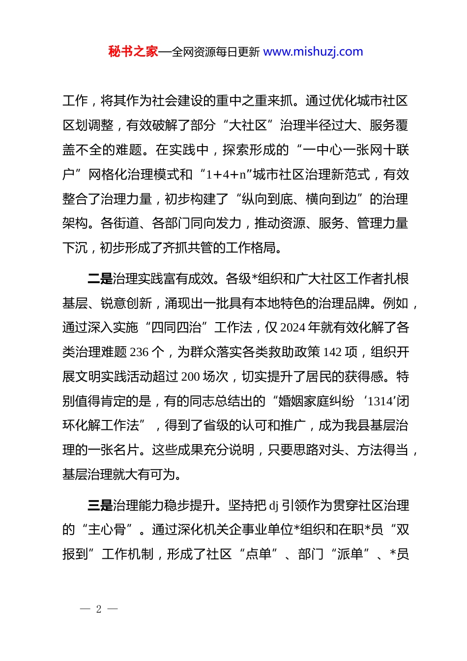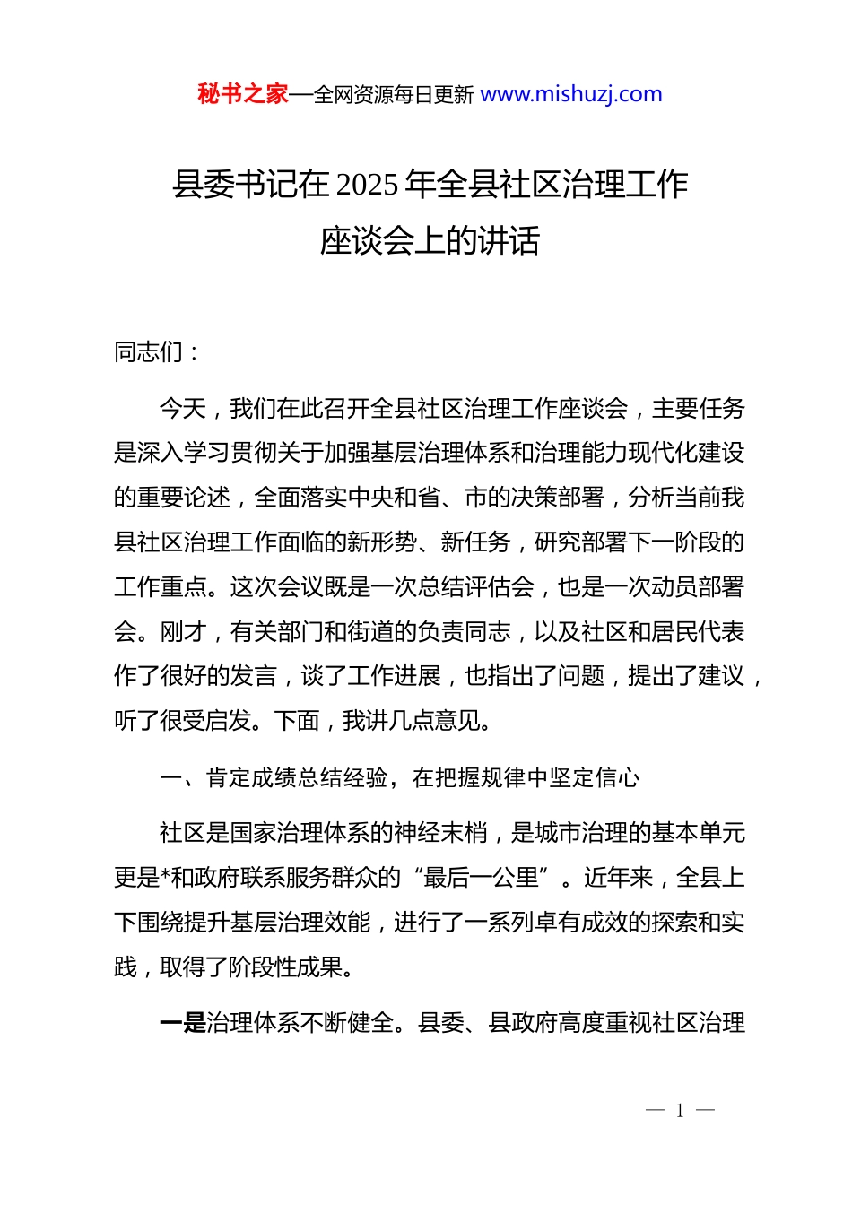 秘书之家—全网资源每日更新 www.mishuzj.com县委书记在 2025 年全县社区治理工作座谈会上的讲话同志们:今天,我们在此召开全县社区治理工作座谈会,主要任务是深入学习贯彻关于加强基层治理体系和治理能力现代化建设的重要论述,全面落实中央和省、市的决策部署,分析当前我县社区治理工作面临的新形势、新任务,研究部署下一阶段的工作重点。这次会议既是一次总结评估会,也是一次动员部署会。刚才,有关部门和街道的负责同志,以及社区和居民代表作了很好的发言,谈了工作进展,也指出了问题,提出了建议,听了很受启发。下面,我讲几点意见。一、肯定成绩总结经验,在把握规律中坚定信心社区是国家治理体系的神经末梢,是城市治理的基本单元更是*和政府联系服务群众的“最后一公里”。近年来,全县上下围绕提升基层治理效能,进行了一系列卓有成效的探索和实践,取得了阶段性成果。一是治理体系不断健全。县委、县政府高度重视社区治理— 1 —秘书之家—全网资源每日更新 www.mishuzj.com工作,将其作为社会建设的重中之重来抓。通过优化城市社区区划调整,有效破解了部分“大社区”治理半径过大、服务覆盖不全的难题。在实践中,探索形成的“一中心一张网十联户”网格化治理模式和“1+4+n”城市社区治理新范式,有效整合了治理力量,初步构建了“纵向到底、横向到边”的治理架构。各街道、各部门同向发力,推动资源、服务、管理力量下沉,初步形成了齐抓共管的工作格局。二是治理实践富有成效。各级*组织和广大社区工作者扎根基层、锐意创新,涌现出一批具有本地特色的治理品牌。例如,通过深入实施“四同四治”工作法,仅 2024 年就有效化解了各类治理难题 236 个,为群众落实各类救助政策 142 项,组织开展文明实践活动超过 200 场次,切实提升了居民的获得感。特别值得肯定的是,有的同志总结出的“婚姻家庭纠纷‘1314’闭环化解工作法”,得到了省级的认可和推广,成为我县基层治理的一张名片。这些成果充分说明,只要思路对头、方法得当,基层治理就大有可为。三是治理能力稳步提升。坚持把 dj 引领作为贯穿社区治理的“主心骨”。通过深化机关企事业单位*组织和在职*员“双报到”工作机制,形成了社区“点单”、部门“派单”、*员— 2 —秘书之家—全网资源每日更新 www.mishuzj.com“接单”的服务闭环,有效破解了社区“看得见、管不着”和部门“管得着、看不见”的治理困境。同时,积极推进智慧小区建设,在县城 10 个小区开展智能平安创建试点,建成“天网”探头 1067 个,依托“网格通 app”等平台,提升了社会治理的智能化、专业化水平。这些探索,为我们下一步深化社区治理现代化建设积累了宝贵经验。这些成绩的取得,是全县上下共同努力的结果,凝聚了广大基层干部和社区工作者的心血与汗水。在此,我代表县委、县政府,向长期奋战在社区治理一线的全体同志,表示衷心的感谢!二、正视问题认清形势,在应对挑战中增强自觉在肯定成绩的同时,也必须清醒地看到,对照新时代新要求,对照人民群众对美好生活的新期待,我县的社区治理工作仍存在一些不容忽视的短板和挑战。首先,治理体系的系统性有待加强。随着城镇化进程加快我县城市人口结构、社会结构、利益格局正在发生深刻变化。特别是部分易地搬迁安置点,人口集中、来源多样,管理服务难度巨大。居民的诉求也日益呈现出个性化、多元化的特点。— 3 —秘书之家—全网资源每日更新 www.mishuzj.com当前,一些社区仍然存在资源力量薄弱、工作手段单一的问题,部门之间的协同联动还不够顺畅,存在“资源配置内卷化、治理体系互斥化”的现象。传统的“人海战术”和行政化管理方式,已难以适应当前复杂多变的治理需求。其次,治理能力的专业化水平有待提升。社区工作者是基层治理的骨干力量,但这支队伍的专业化、职业化建设仍处于起步阶段。存在队伍力量相对单一、人员素质参差不齐、教育培训不成体系等问题。2023 年虽然选派了 44 人次外出培训,但相较于庞大的工作需求,这种零散式培训难以从根本上解决能力短板问题。部分社区干部对政策法规、群众工作方法、现代信息技术等的掌...