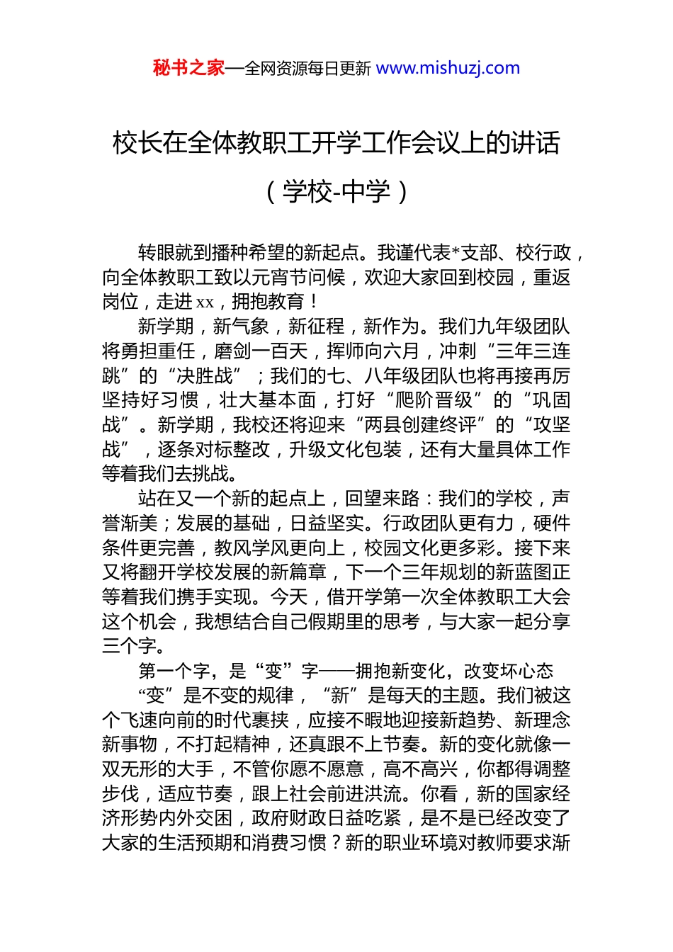 秘书之家—全网资源每日更新 www.mishuzj.com校长在全体教职工开学工作会议上的讲话(学校-中学)转眼就到播种希望的新起点。我谨代表*支部、校行政,向全体教职工致以元宵节问候,欢迎大家回到校园,重返岗位,走进 xx,拥抱教育!新学期,新气象,新征程,新作为。我们九年级团队将勇担重任,磨剑一百天,挥师向六月,冲刺“三年三连跳”的“决胜战”;我们的七、八年级团队也将再接再厉坚持好习惯,壮大基本面,打好“爬阶晋级”的“巩固战”。新学期,我校还将迎来“两县创建终评”的“攻坚战”,逐条对标整改,升级文化包装,还有大量具体工作等着我们去挑战。站在又一个新的起点上,回望来路:我们的学校,声誉渐美;发展的基础,日益坚实。行政团队更有力,硬件条件更完善,教风学风更向上,校园文化更多彩。接下来又将翻开学校发展的新篇章,下一个三年规划的新蓝图正等着我们携手实现。今天,借开学第一次全体教职工大会这个机会,我想结合自己假期里的思考,与大家一起分享三个字。第一个字,是“变”字——拥抱新变化,改变坏心态“变”是不变的规律,“新”是每天的主题。我们被这个飞速向前的时代裹挟,应接不暇地迎接新趋势、新理念新事物,不打起精神,还真跟不上节奏。新的变化就像一双无形的大手,不管你愿不愿意,高不高兴,你都得调整步伐,适应节奏,跟上社会前进洪流。你看,新的国家经济形势内外交困,政府财政日益吃紧,是不是已经改变了大家的生活预期和消费习惯?新的职业环境对教师要求渐秘书之家—全网资源每日更新 www.mishuzj.com高,“学在缙云”的金字招牌正经历风雨洗礼,是不是也开始倒逼我们成为教育路上的学习者、探路者、捍卫者?学校下一步发展蓝图正徐徐展开,校本课程建设也方兴未艾,是不是也需要我们以更大的热情投身其中,迈开步子做更多实践?当下 deepseek 正风靡全球,无论是 ai 几秒钟思考后给出的答案,或是创作的《缙云赋》,都足够令人惊叹、甚至汗颜,面对科技革命重塑教育的新可能,我们教师这个角色是否又真的无可取代?记得刚到 xx 时,面对着年久失修、发展滞缓的学校,我就反复思考这些问题——我们 xx 是“变”,还是“不变”?若“变”又如何去“变”?我若选择躺平不变,就意味着放任学校慢性自杀;唯有困中思变,方能于“改变”中求“生机”。大家这两年也都见证了,正是因为求“变”,学校无论是在硬件环境,还是在育人文化、教育质量、社会口碑等方面,都在发生着积极而深刻的改变。我想和大家一起珍惜可以改变的机会,毕竟学校是属于我们每一个人的家园,是我们每一个人体现自我价值的事业作为 xx 人,作为教育人,面对新时期、新变化、新挑战,我们都应该顺“新”而“变“。人生实短,责任实大,要么出色,要么出局!是做一条风干的咸鱼,还是身化“鱼龙”一跃而起?是自闭于狭隘的水沟鱼缸,还是放开胸怀游向江河大海?我们都该做出无愧于职业良心的选择!就让我们一起顺应新变化,接受新挑战,拥抱新学习,从改变自己的心态开始,从而改变学生,改变学校,改变教育!第二个字,是“立”字——大处立师心,小处立人设我们老师,都是读书之人、知识分子。北宋张载的横渠四句,堪称中国传统知识分子的人格宣言。这四句掷地有声,振聋发聩:为天地立心,为生民立命,为往圣继绝学,为万世开太平!短短 xx 多字,传达的价值观念和思想情怀,以及对民众和社会的责任担当,成为知识分子的人格理想和精神坐标。作为人民教师,不苛求能成圣贤学问秘书之家—全网资源每日更新 www.mishuzj.com千秋伟业,但起码也要立得起“学高为师、身正为范“的天地师心、师道尊严。大家都是知识分子,在有生之年,须时时警醒自己,不违教育初心。我也知道,当下各种价值观念冲突,个人主义大有市场,躺平主义四下盛行,很多人也只想把教书用来安身立命。但我想,教师这个职业实在太特殊了,我们既要教书更该育人,怎么可以谋生而已,苟且偷安!电影《第二十条》里有一句话令人震撼:“你们有没有想过,我们判的不是别人的案子,而是别人的人生!”对于我们教师而言我们肩上的责任又何尝不是如此?我们教的何止是书,更...