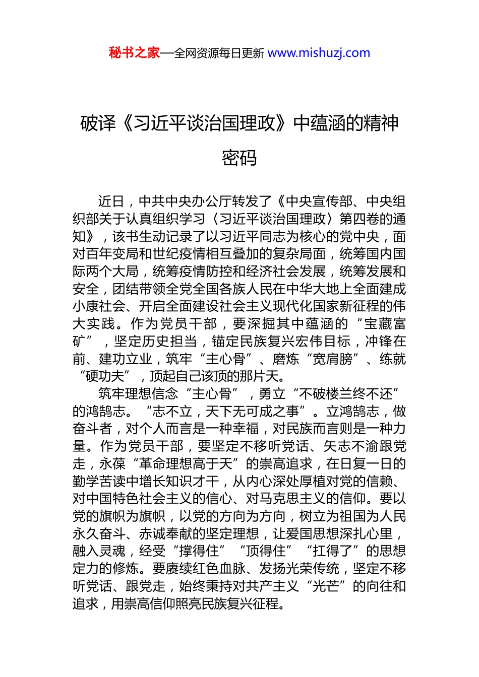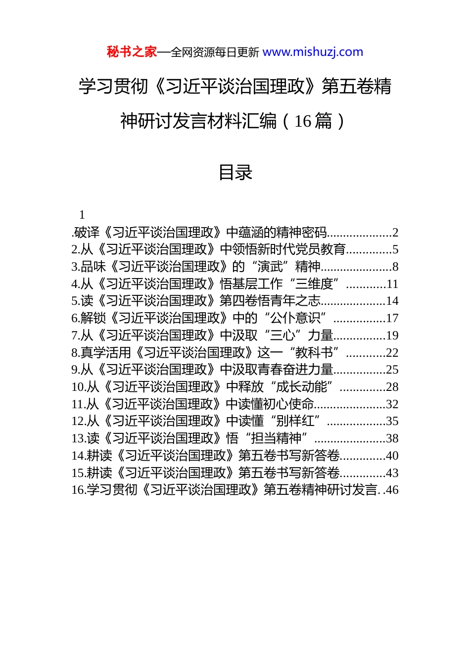 秘书之家—全网资源每日更新 www.mishuzj.com学习贯彻《习近平谈治国理政》第五卷精神研讨发言材料汇编(16 篇)目录1.破译《习近平谈治国理政》中蕴涵的精神密码....................22.从《习近平谈治国理政》中领悟新时代党员教育..............53.品味《习近平谈治国理政》的“演武”精神......................84.从《习近平谈治国理政》悟基层工作“三维度”............115.读《习近平谈治国理政》第四卷悟青年之志....................146.解锁《习近平谈治国理政》中的“公仆意识”................177.从《习近平谈治国理政》中汲取“三心”力量................198.真学活用《习近平谈治国理政》这一“教科书”............229.从《习近平谈治国理政》中汲取青春奋进力量................2510.从《习近平谈治国理政》中释放“成长动能”..............2811.从《习近平谈治国理政》中读懂初心使命......................3212.从《习近平谈治国理政》中读懂“别样红”..................3513.读《习近平谈治国理政》悟“担当精神”......................3814.耕读《习近平谈治国理政》第五卷书写新答卷..............4015.耕读《习近平谈治国理政》第五卷书写新答卷..............4316.学习贯彻《习近平谈治国理政》第五卷精神研讨发言. .46秘书之家—全网资源每日更新 www.mishuzj.com破译《习近平谈治国理政》中蕴涵的精神密码近日,中共中央办公厅转发了《中央宣传部、中央组织部关于认真组织学习〈习近平谈治国理政〉第四卷的通知》,该书生动记录了以习近平同志为核心的党中央,面对百年变局和世纪疫情相互叠加的复杂局面,统筹国内国际两个大局,统筹疫情防控和经济社会发展,统筹发展和安全,团结带领全党全国各族人民在中华大地上全面建成小康社会、开启全面建设社会主义现代化国家新征程的伟大实践。作为党员干部,要深掘其中蕴涵的“宝藏富矿”,坚定历史担当,锚定民族复兴宏伟目标,冲锋在前、建功立业,筑牢“主心骨”、磨炼“宽肩膀”、练就“硬功夫”,顶起自己该顶的那片天。筑牢理想信念“主心骨”,勇立“不破楼兰终不还”的鸿鹄志。“志不立,天下无可成之事”。立鸿鹄志,做奋斗者,对个人而言是一种幸福,对民族而言则是一种力量。作为党员干部,要坚定不移听党话、矢志不渝跟党走,永葆“革命理想高于天”的崇高追求,在日复一日的勤学苦读中增长知识才干,从内心深处厚植对党的信赖、对中国特色社会主义的信心、对马克思主义的信仰。要以党的旗帜为旗帜,以党的方向为方向,树立为祖国为人民永久奋斗、赤诚奉献的坚定理想,让爱国思想深扎心里,融入灵魂,经受“撑得住”“顶得住”“扛得了”的思想定力的修炼。要赓续红色血脉、发扬光荣传统,坚定不移听党话、跟党走,始终秉持对共产主义“光芒”的向往和追求,用崇高信仰照亮民族复兴征程。秘书之家—全网资源每日更新 www.mishuzj.com磨砺干事创业“宽肩膀”,走好“敢教日月换新天”的奋进路。奋斗,是一个闪闪发光的词语。作为党员干部,要以“奋斗之我”担“有为之责”,永葆攻坚克难、不惧危难的顽强意志,跳出“安乐窝”迎接挑战,走出“舒适区”逆风飞翔,在经历“风吹浪打”、捧“烫手山芋”的实践磨砺中挺起脊梁、冲锋在前。要高扬奋斗之帆、紧握奋斗之桨,自觉肩负起时代赋予的神圣职责与光荣使命,在实践中勇担重任,在奋斗中点亮青春,切实做到不怕事、不畏险、不避难、不推责,用实际行动来回应组织的回应和人民的重托。要以“大道至简,实干为要”的责任感,积聚形成千里奔涌、万壑归流的磅礴伟力,创造更多“惊涛骇浪从容渡”的奋斗成果,书写更多“越是艰险越向前”的精彩篇章。练就为民服务“硬功夫”,唱响“俯首甘为孺子牛”的奉献曲。“江山就是人民,人民就是江山”。作为党员干部,要多思民生之忧、常谋民生之利、勤解民生之困,永远保持同人民群众的血肉联系,始终同人民群众想在一起、干在一起、风雨同舟、同甘共苦,用实际行动践行为民造福的赤子情怀。要严守廉洁自律底线,在细照笃行中不断修炼自我,在服务人民、奉献社会、建设祖国的生动实践中体现人生价值...