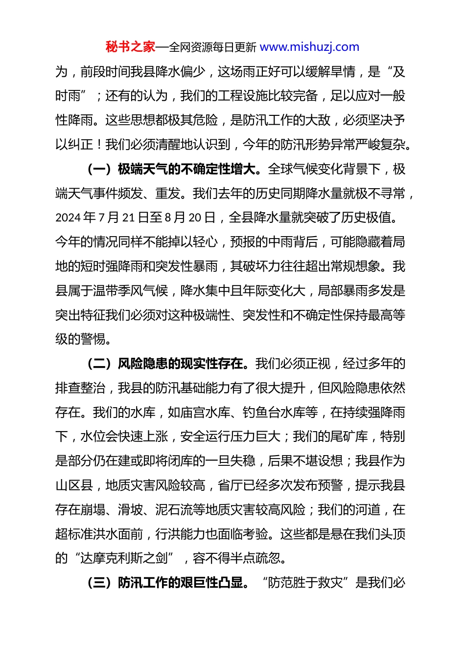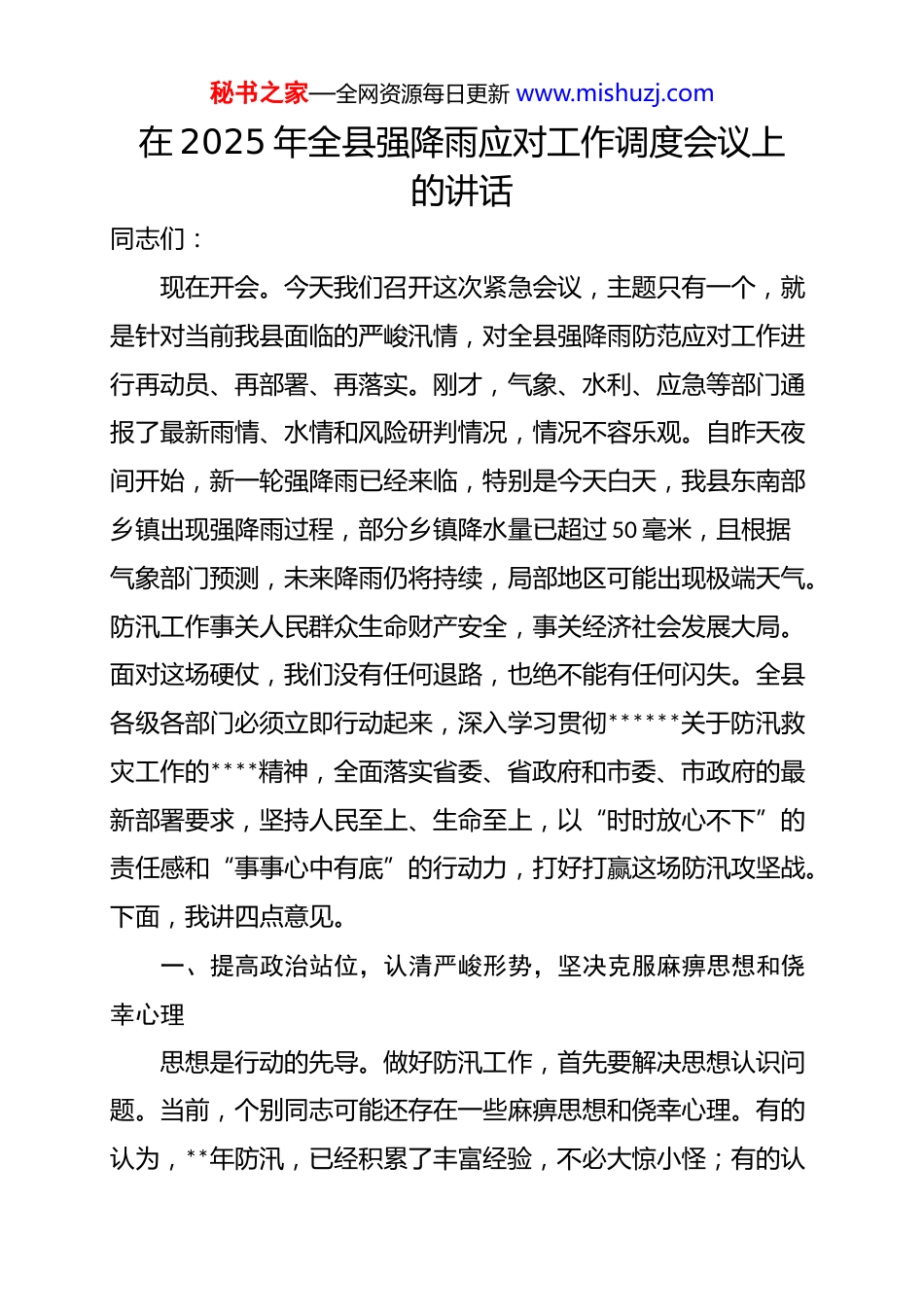 秘书之家—全网资源每日更新 www.mishuzj.com在 2025 年全县强降雨应对工作调度会议上的讲话同志们:现在开会。今天我们召开这次紧急会议,主题只有一个,就是针对当前我县面临的严峻汛情,对全县强降雨防范应对工作进行再动员、再部署、再落实。刚才,气象、水利、应急等部门通报了最新雨情、水情和风险研判情况,情况不容乐观。自昨天夜间开始,新一轮强降雨已经来临,特别是今天白天,我县东南部乡镇出现强降雨过程,部分乡镇降水量已超过 50 毫米,且根据气象部门预测,未来降雨仍将持续,局部地区可能出现极端天气。防汛工作事关人民群众生命财产安全,事关经济社会发展大局。面对这场硬仗,我们没有任何退路,也绝不能有任何闪失。全县各级各部门必须立即行动起来,深入学习贯彻******关于防汛救灾工作的****精神,全面落实省委、省政府和市委、市政府的最新部署要求,坚持人民至上、生命至上,以“时时放心不下”的责任感和“事事心中有底”的行动力,打好打赢这场防汛攻坚战。下面,我讲四点意见。一、提高政治站位,认清严峻形势,坚决克服麻痹思想和侥幸心理思想是行动的先导。做好防汛工作,首先要解决思想认识问题。当前,个别同志可能还存在一些麻痹思想和侥幸心理。有的认为,**年防汛,已经积累了丰富经验,不必大惊小怪;有的认秘书之家—全网资源每日更新 www.mishuzj.com为,前段时间我县降水偏少,这场雨正好可以缓解旱情,是“及时雨”;还有的认为,我们的工程设施比较完备,足以应对一般性降雨。这些思想都极其危险,是防汛工作的大敌,必须坚决予以纠正!我们必须清醒地认识到,今年的防汛形势异常严峻复杂。(一)极端天气的不确定性增大。全球气候变化背景下,极端天气事件频发、重发。我们去年的历史同期降水量就极不寻常,2024 年 7 月 21 日至 8 月 20 日,全县降水量就突破了历史极值。今年的情况同样不能掉以轻心,预报的中雨背后,可能隐藏着局地的短时强降雨和突发性暴雨,其破坏力往往超出常规想象。我县属于温带季风气候,降水集中且年际变化大,局部暴雨多发是突出特征我们必须对这种极端性、突发性和不确定性保持最高等级的警惕。(二)风险隐患的现实性存在。我们必须正视,经过多年的排查整治,我县的防汛基础能力有了很大提升,但风险隐患依然存在。我们的水库,如庙宫水库、钓鱼台水库等,在持续强降雨下,水位会快速上涨,安全运行压力巨大;我们的尾矿库,特别是部分仍在建或即将闭库的一旦失稳,后果不堪设想;我县作为山区县,地质灾害风险较高,省厅已经多次发布预警,提示我县存在崩塌、滑坡、泥石流等地质灾害较高风险;我们的河道,在超标准洪水面前,行洪能力也面临考验。这些都是悬在我们头顶的“达摩克利斯之剑”,容不得半点疏忽。(三)防汛工作的艰巨性凸显。“防范胜于救灾”是我们必秘书之家—全网资源每日更新 www.mishuzj.com须牢固树立的理念。防汛工作千头万绪,涉及监测预警、隐患排查、物资储备、人员转移、应急抢险、恢复重建等方方面面,环环相扣、缺一不可。任何一个环节的疏漏,都可能导致“千里之堤,毁于蚁穴”。全县上下必须立即进入战时状态,把思想的弦绷到最紧,把工作的发条拧到最实,坚决摒弃“看天吃饭”的侥幸心理和“雨还不大”的麻痹思想,立足于防大汛、抢大险、救大灾,做好最充分的准备,争取最好的结果。二、突出防御重点,精准有效施策,全面筑牢安全度汛的坚固防线防汛工作,必须抓住关键、突出重点。各级各部门要聚焦重点区域和薄弱环节,采取超常规举措,下足“绣花”功夫,确保各项防御措施精准落地、万无一失。(一)深化隐患排查整治,坚决做到防患于未然。隐患险于明火,防范胜于救灾。要立即组织力量,以“拉网式”、“地毯式”的方式,对全县所有风险点进行再排查、再梳理、再整治,确保不留死角、不留盲区。一要突出抓好水库和尾矿库安全。水务、应急、自然资源等部门要牵头,对全县所有水库、水电站、尾矿库进行 24 小时不间断巡查监测。要重点检查坝体、溢洪道、排洪设施等关键部位,密切监测库水位、浸润线和位移变化。对于承德市应急管理局反复强调的尾矿库...