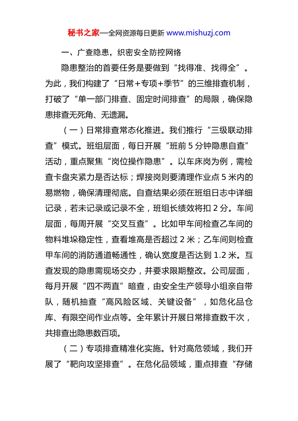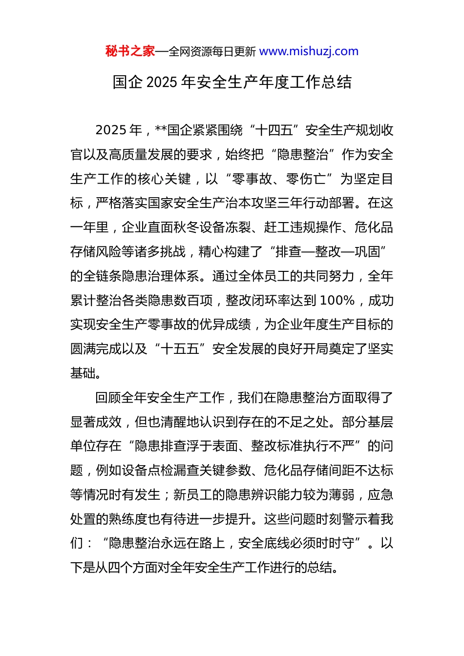 秘书之家—全网资源每日更新 www.mishuzj.com国企 2025 年安全生产年度工作总结 2025 年,**国企紧紧围绕“十四五”安全生产规划收官以及高质量发展的要求,始终把“隐患整治”作为安全生产工作的核心关键,以“零事故、零伤亡”为坚定目标,严格落实国家安全生产治本攻坚三年行动部署。在这一年里,企业直面秋冬设备冻裂、赶工违规操作、危化品存储风险等诸多挑战,精心构建了“排查—整改—巩固”的全链条隐患治理体系。通过全体员工的共同努力,全年累计整治各类隐患数百项,整改闭环率达到 100%,成功实现安全生产零事故的优异成绩,为企业年度生产目标的圆满完成以及“十五五”安全发展的良好开局奠定了坚实基础。回顾全年安全生产工作,我们在隐患整治方面取得了显著成效,但也清醒地认识到存在的不足之处。部分基层单位存在“隐患排查浮于表面、整改标准执行不严”的问题,例如设备点检漏查关键参数、危化品存储间距不达标等情况时有发生;新员工的隐患辨识能力较为薄弱,应急处置的熟练度也有待进一步提升。这些问题时刻警示着我们:“隐患整治永远在路上,安全底线必须时时守”。以下是从四个方面对全年安全生产工作进行的总结。秘书之家—全网资源每日更新 www.mishuzj.com一、广查隐患,织密安全防控网络隐患整治的首要任务是要做到“找得准、找得全”。为此,我们构建了“日常+专项+季节”的三维排查机制,打破了“单一部门排查、固定时间排查”的局限,确保隐患排查无死角、无遗漏。(一)日常排查常态化推进。我们推行“三级联动排查”模式。班组层面,每日开展“班前 5 分钟隐患自查”活动,重点聚焦“岗位操作隐患”。以车床岗为例,需检查卡盘夹紧力是否达标;焊接岗则要清理作业点 5 米内的易燃物,确保清理彻底。自查结果必须在班组日志中详细记录,若未记录或记录不全,班组长绩效将扣 2 分。车间层面,每周开展“交叉互查”。比如甲车间检查乙车间的物料堆垛稳定性,查看堆高是否超过 2 米;乙车间则检查甲车间的消防通道畅通性,确认宽度是否达到 1.2 米。互查发现的隐患需现场交办,并要求限期整改。公司层面,每月开展“四不两直”暗查,由安全生产领导小组亲自带队,随机抽查“高风险区域、关键设备”,如危化品仓库、有限空间作业点等。全年累计开展日常排查数千次,共排查出隐患数百项。(二)专项排查精准化实施。针对高危领域,我们开展了“靶向攻坚排查”。在危化品领域,重点排查“存储秘书之家—全网资源每日更新 www.mishuzj.com隔离、泄漏检测、应急物资”等方面。例如,检查腐蚀性与易燃物料间距是否超过 1 米,是否安装智能检测仪,是否配备吸附棉与中和剂等。对于不符合要求的情况,一律责令停工整改。如“某车间乙醇储罐未安装泄漏报警仪”,要求在 3 日内完成加装并调试合格。在建筑施工领域,排查“深基坑支护、高支模架体、起重机械”等关键环节。检查深基坑是否有位移监测记录,高支模架体立杆间距是否符合方案要求,起重机械安全限位是否灵敏等。未落实专项方案的项目立即叫停,全年共整改建筑施工隐患 23 项。在特种设备领域,排查“安全阀校验、压力表精度”等内容。检查安全阀是否在有效期内,压力表误差是否超过±0.5%,过期或超差的立即送检,全年特种设备隐患整改率达到 100%。(三)季节排查动态化调整。结合不同季节的风险特点,我们及时调整排查重点。春季,聚焦“防雷防静电”,排查户外设备、储罐区防雷装置是否完好,检测接地电阻是否达标(不大于 10 欧姆),对于不合格的要求在24 小时内完成整改。夏季,聚焦“防暑降温与防汛”,检查车间通风设备是否正常运行,应急防汛物资(沙袋、水泵)是否充足。在高温时段(11:00-15:00),严禁户外作业。秋冬季节,聚焦“设备防冻与火灾防控”,排查户秘书之家—全网资源每日更新 www.mishuzj.com外管道是否加装保温层(厚度不低于 50mm),液压系统是否更换低温油液,同时清理“三合一”场所的违规住人情况。全年季节排查共整改隐患 80 余项,有效防范了低温冻裂、火灾等季节性事故的发生。二、严抓整改,闭环管理消除隐患隐患整治的核心在于“...