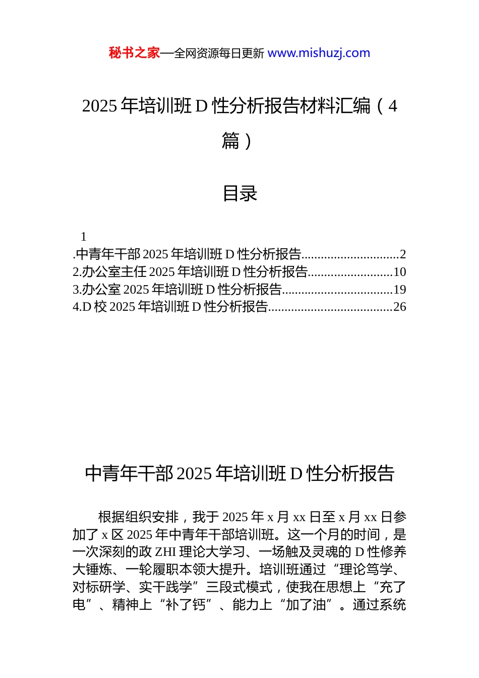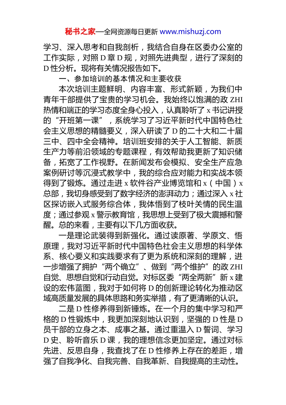 秘书之家—全网资源每日更新 www.mishuzj.com2025 年培训班 D 性分析报告材料汇编(4篇)目录1.中青年干部 2025 年培训班 D 性分析报告..............................22.办公室主任 2025 年培训班 D 性分析报告..........................103.办公室 2025 年培训班 D 性分析报告..................................194.D 校 2025 年培训班 D 性分析报告......................................26中青年干部 2025 年培训班 D 性分析报告根据组织安排,我于 2025 年 x 月 xx 日至 x 月 xx 日参加了 x 区 2025 年中青年干部培训班。这一个月的时间,是一次深刻的政 ZHI 理论大学习、一场触及灵魂的 D 性修养大锤炼、一轮履职本领大提升。培训班通过“理论笃学、对标研学、实干践学”三段式模式,使我在思想上“充了电”、精神上“补了钙”、能力上“加了油”。通过系统秘书之家—全网资源每日更新 www.mishuzj.com学习、深入思考和自我剖析,我结合自身在区委办公室的工作实际,对照 D 章 D 规,对照先进典型,进行了深刻的D 性分析。现将有关情况报告如下。一、参加培训的基本情况和主要收获本次培训主题鲜明、内容丰富、形式新颖,为我们中青年干部提供了宝贵的学习机会。我始终以饱满的政 ZHI热情和端正的学习态度全身心投入,认真聆听了 x 书记讲授的“开班第一课”,系统学习了习近平新时代中国特色社会主义思想的精髓要义,深入研读了 D 的二十大和二十届三中、四中全会精神。培训班安排的关于人工智能、新质生产力等前沿领域的专题课程,有效帮助我更新了知识储备,拓宽了工作视野。在新闻发布会模拟、安全生产应急案例研讨等沉浸式教学中,我的综合应对能力和实战本领得到了锻炼。通过走进 x 软件谷产业博览馆和 x(中国)x总部,我切身感受到了数字经济的澎湃动力;通过深入 x 社区探访嵌入式服务综合体,我体悟到了枝叶关情的民生温度;通过参观 x 警示教育馆,我思想上受到了极大震撼和警醒。总的来看,主要有以下几方面收获。一是理论武装得到新强化。通过读原著、学原文、悟原理,我对习近平新时代中国特色社会主义思想的科学体系、核心要义和实践要求有了更为系统和深刻的理解,进一步增强了拥护“两个确立”、做到“两个维护”的政 ZHI自觉、思想自觉和行动自觉。对标区委“两全两新”新 x 建设的宏伟蓝图,我对于如何将 D 的创新理论转化为推动区域高质量发展的具体思路和务实举措,有了更清晰的认识。二是 D 性修养得到新锤炼。在一个月的集中学习和严格的 D 性锻炼中,我更加深刻地认识到,坚强的 D 性是 D员干部的立身之本、成事之基。通过重温入 D 誓词、学习D 史、聆听音乐 D 课,我的理想信念更加坚定。通过对标先进、反思自身,我查找了在 D 性修养上存在的差距,增强了自我净化、自我完善、自我革新、自我提高的主动性。秘书之家—全网资源每日更新 www.mishuzj.com三是能力本领得到新提升。区委办公室作为区委的中枢机构,对干部能力素质要求极高。本次培训不仅有理论高度,更有实践深度。围绕中心、服务大局的宏观思维能力,参谋辅政、以文辅政的综合文字能力,统筹协调、推动落实的组织执行能力,以及应对复杂局面、处理突发事件的应急处突能力,都通过针对性的课程和研讨得到了有效提升,一定程度上缓解了我的“本领恐慌”。二、存在的主要问题和不足对照习近平总书记对年轻干部提出的“五个自觉”要求,对照 D 章 D 规和 D 员标准,我坚持刀刃向内、自我检视,深刻查摆出自身在思想、作风、能力等方面仍然存在一些亟待解决的问题。一是在理论学习方面,深钻细研的韧劲不足。虽然能够按照要求完成学习任务,但学习的系统性、深入性还有欠缺。有时满足于“学过了”“知道了”,对于 D 的创新理论背后蕴含的马克思主义立场、观点、方法,未能做到完全融会贯通。特别是将新思想新理论与区委办公室“三服务”工作紧密结合,用以指导实践、破解难题的能力尚有不足。比如,面对新质生产力、人工智能等新概念新领域,虽然在培训中有所涉猎,但如何将其与我区产业发...