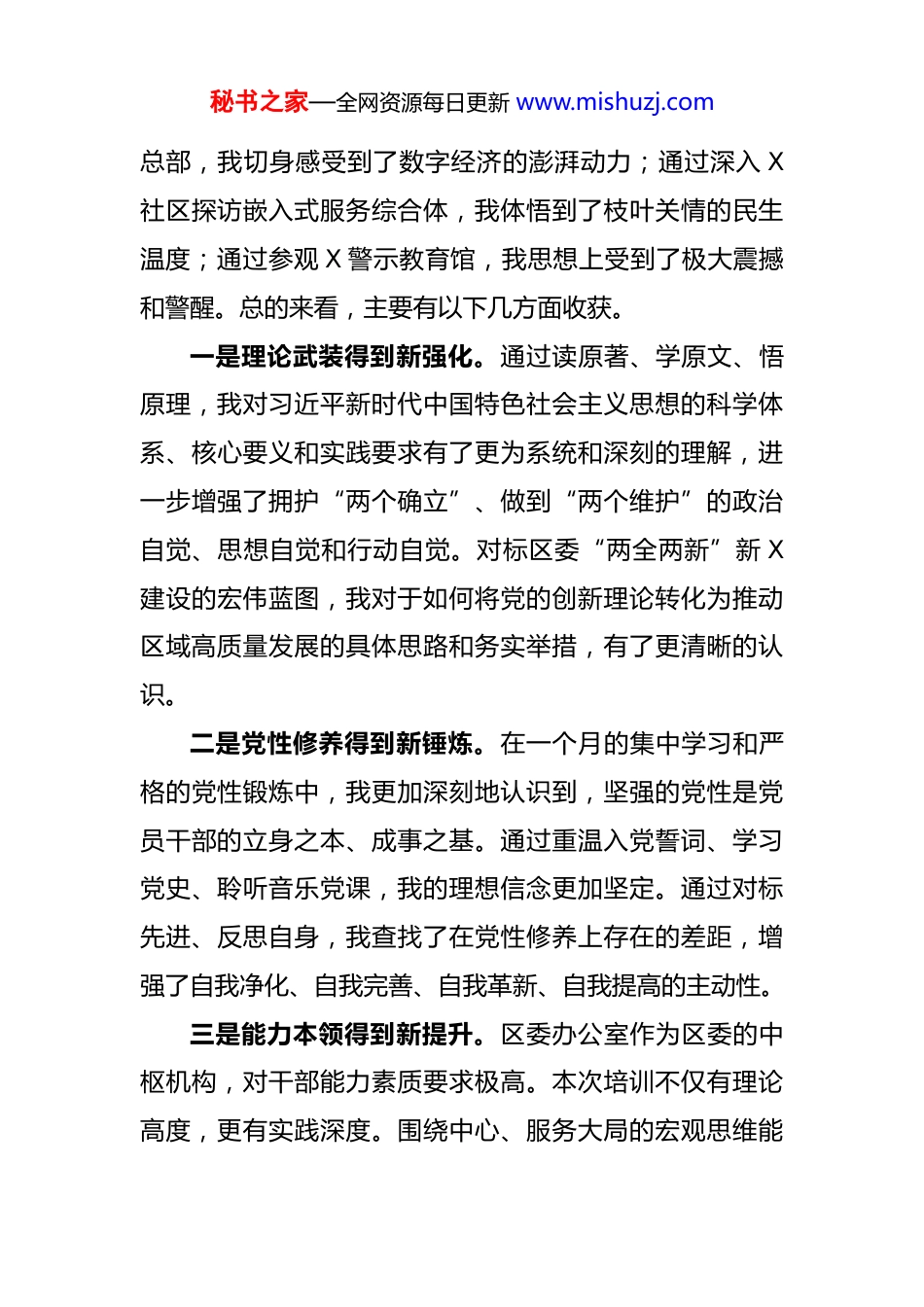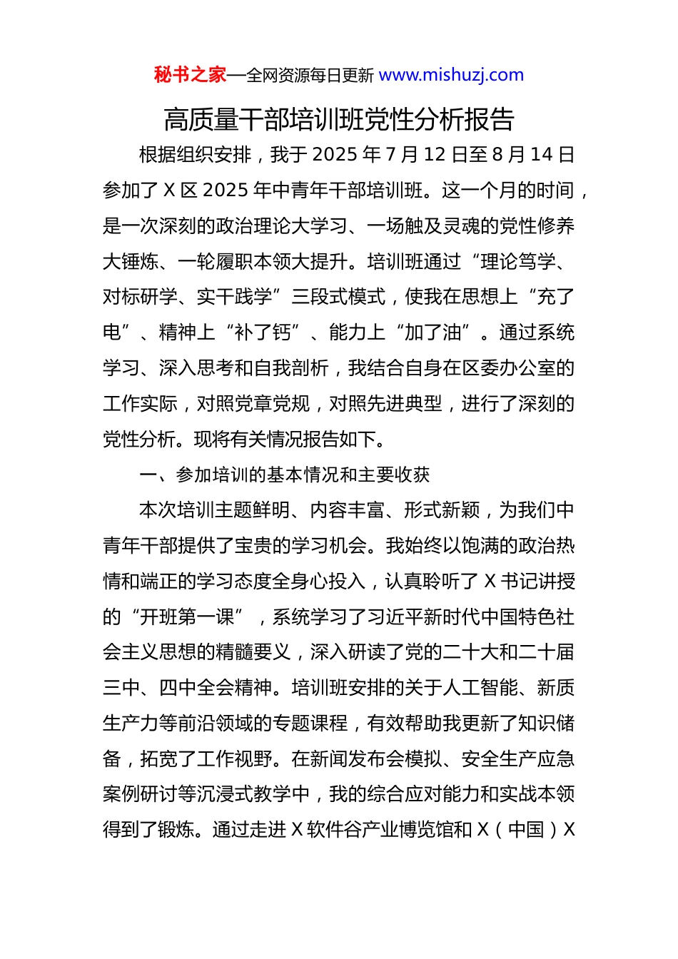 秘书之家—全网资源每日更新 www.mishuzj.com高质量干部培训班党性分析报告根据组织安排,我于 2025 年 7 月 12 日至 8 月 14 日参加了 X 区 2025 年中青年干部培训班。这一个月的时间,是一次深刻的政治理论大学习、一场触及灵魂的党性修养大锤炼、一轮履职本领大提升。培训班通过“理论笃学、对标研学、实干践学”三段式模式,使我在思想上“充了电”、精神上“补了钙”、能力上“加了油”。通过系统学习、深入思考和自我剖析,我结合自身在区委办公室的工作实际,对照党章党规,对照先进典型,进行了深刻的党性分析。现将有关情况报告如下。一、参加培训的基本情况和主要收获本次培训主题鲜明、内容丰富、形式新颖,为我们中青年干部提供了宝贵的学习机会。我始终以饱满的政治热情和端正的学习态度全身心投入,认真聆听了 X 书记讲授的“开班第一课”,系统学习了习近平新时代中国特色社会主义思想的精髓要义,深入研读了党的二十大和二十届三中、四中全会精神。培训班安排的关于人工智能、新质生产力等前沿领域的专题课程,有效帮助我更新了知识储备,拓宽了工作视野。在新闻发布会模拟、安全生产应急案例研讨等沉浸式教学中,我的综合应对能力和实战本领得到了锻炼。通过走进 X 软件谷产业博览馆和 X(中国)X秘书之家—全网资源每日更新 www.mishuzj.com总部,我切身感受到了数字经济的澎湃动力;通过深入 X社区探访嵌入式服务综合体,我体悟到了枝叶关情的民生温度;通过参观 X 警示教育馆,我思想上受到了极大震撼和警醒。总的来看,主要有以下几方面收获。一是理论武装得到新强化。通过读原著、学原文、悟原理,我对习近平新时代中国特色社会主义思想的科学体系、核心要义和实践要求有了更为系统和深刻的理解,进一步增强了拥护“两个确立”、做到“两个维护”的政治自觉、思想自觉和行动自觉。对标区委“两全两新”新 X建设的宏伟蓝图,我对于如何将党的创新理论转化为推动区域高质量发展的具体思路和务实举措,有了更清晰的认识。二是党性修养得到新锤炼。在一个月的集中学习和严格的党性锻炼中,我更加深刻地认识到,坚强的党性是党员干部的立身之本、成事之基。通过重温入党誓词、学习党史、聆听音乐党课,我的理想信念更加坚定。通过对标先进、反思自身,我查找了在党性修养上存在的差距,增强了自我净化、自我完善、自我革新、自我提高的主动性。三是能力本领得到新提升。区委办公室作为区委的中枢机构,对干部能力素质要求极高。本次培训不仅有理论高度,更有实践深度。围绕中心、服务大局的宏观思维能秘书之家—全网资源每日更新 www.mishuzj.com力,参谋辅政、以文辅政的综合文字能力,统筹协调、推动落实的组织执行能力,以及应对复杂局面、处理突发事件的应急处突能力,都通过针对性的课程和研讨得到了有效提升,一定程度上缓解了我的“本领恐慌”。二、存在的主要问题和不足对照习近平总书记对年轻干部提出的“五个自觉”要求,对照党章党规和党员标准,我坚持刀刃向内、自我检视,深刻查摆出自身在思想、作风、能力等方面仍然存在一些亟待解决的问题。一是在理论学习方面,深钻细研的韧劲不足。虽然能够按照要求完成学习任务,但学习的系统性、深入性还有欠缺。有时满足于“学过了”“知道了”,对于党的创新理论背后蕴含的马克思主义立场、观点、方法,未能做到完全融会贯通。特别是将新思想新理论与区委办公室“三服务”工作紧密结合,用以指导实践、破解难题的能力尚有不足。比如,面对新质生产力、人工智能等新概念新领域,虽然在培训中有所涉猎,但如何将其与我区产业发展实际相结合,提出有前瞻性、可操作性的政策建议,我的知识储备和思考深度还远远不够,参谋助手作用的发挥受到一定限制。二是在党性修养方面,自我革命的精神不足。在严格秘书之家—全网资源每日更新 www.mishuzj.com的党内政治生活中锤炼党性的自觉性还不够强。有时以事务性工作繁忙为由,对参加党支部组织生活、开展批评与自我批评不够积极主动,自我剖析的深度和力度有待加强害怕“丢面子”的思想依然存在。在面对一些社会上的错误思潮和消极言论时,...