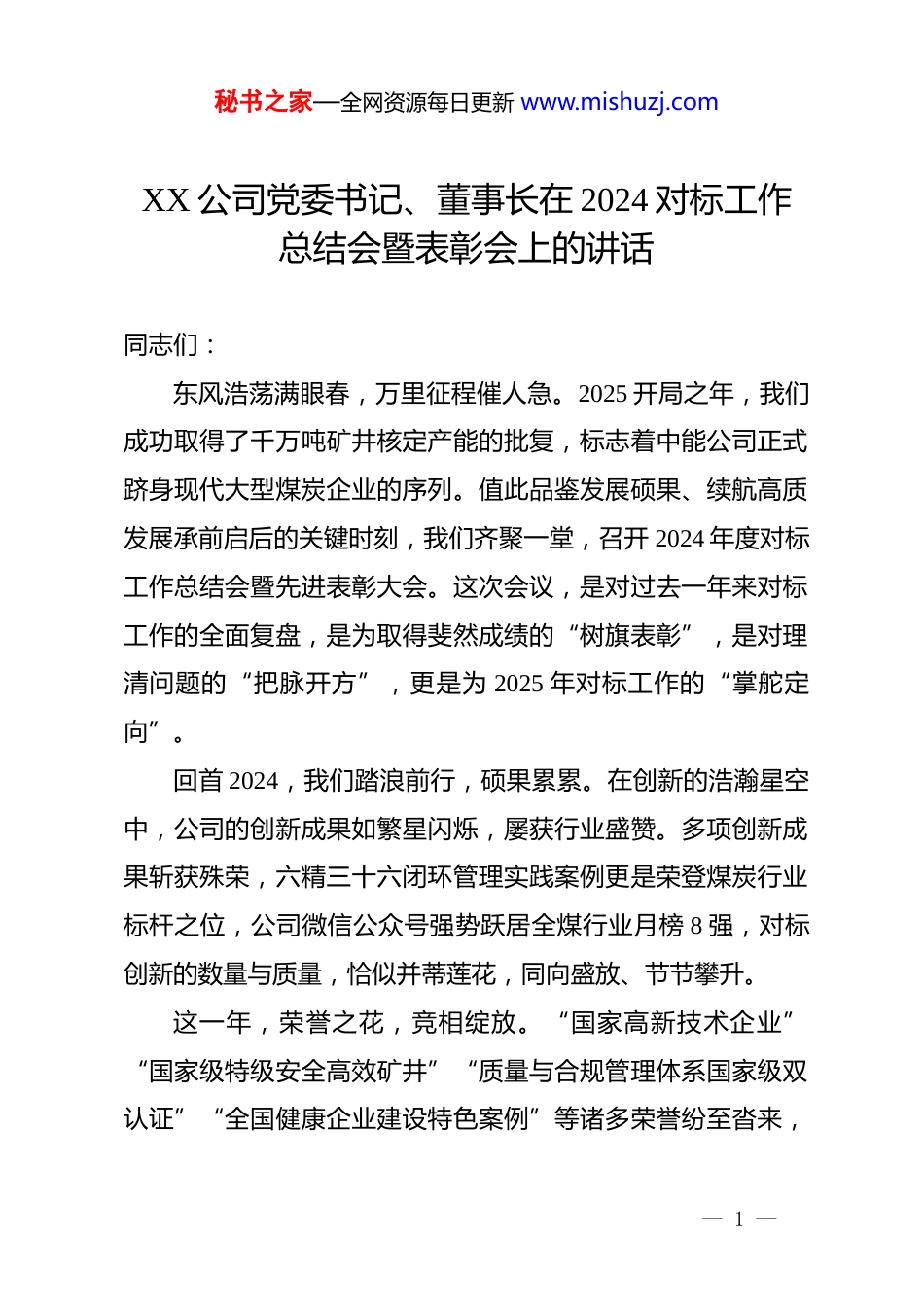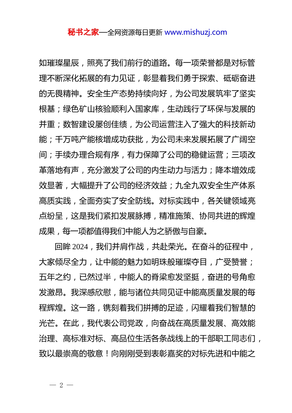 秘书之家—全网资源每日更新 www.mishuzj.comXX 公司党委书记、董事长在 2024 对标工作总结会暨表彰会上的讲话同志们:东风浩荡满眼春,万里征程催人急。2025 开局之年,我们成功取得了千万吨矿井核定产能的批复,标志着中能公司正式跻身现代大型煤炭企业的序列。值此品鉴发展硕果、续航高质发展承前启后的关键时刻,我们齐聚一堂,召开 2024 年度对标工作总结会暨先进表彰大会。这次会议,是对过去一年来对标工作的全面复盘,是为取得斐然成绩的“树旗表彰”,是对理清问题的“把脉开方”,更是为 2025 年对标工作的“掌舵定向”。回首 2024,我们踏浪前行,硕果累累。在创新的浩瀚星空中,公司的创新成果如繁星闪烁,屡获行业盛赞。多项创新成果斩获殊荣,六精三十六闭环管理实践案例更是荣登煤炭行业标杆之位,公司微信公众号强势跃居全煤行业月榜 8 强,对标创新的数量与质量,恰似并蒂莲花,同向盛放、节节攀升。这一年,荣誉之花,竞相绽放。“国家高新技术企业”“国家级特级安全高效矿井”“质量与合规管理体系国家级双认证”“全国健康企业建设特色案例”等诸多荣誉纷至沓来,— 1 —秘书之家—全网资源每日更新 www.mishuzj.com如璀璨星辰,照亮了我们前行的道路。每一项荣誉都是对标管理不断深化拓展的有力见证,彰显着我们勇于探索、砥砺奋进的无畏精神。安全生产态势持续向好,为公司发展筑牢了坚实根基;绿色矿山核验顺利入国家库,生动践行了环保与发展的并重;数智建设屡创佳绩,为公司运营注入了强大的科技新动能;千万吨产能核增成功获批,为公司未来发展拓展了广阔空间;手续办理合规有序,有力保障了公司的稳健运营;三项改革落地有声,充分激发了公司的内生动力与活力;降本增效成效显著,大幅提升了公司的经济效益;九全九双安全生产体系高质实践,全面夯实了安全防线。对标实践中,各关键领域亮点纷呈,这是我们紧扣发展脉搏,精准施策、协同共进的辉煌成果,每一项都值得我们中能人为之骄傲与自豪。回眸 2024,我们并肩作战,共赴荣光。在奋斗的征程中,大家倾尽全力,让中能的魅力如明珠般璀璨夺目,广受赞誉;五年之约,已然过半,中能人的脊梁愈发坚挺,奋进的号角愈发激昂。我深感欣慰,能与诸位共同见证中能高质量发展的每程辉煌。这一路,镌刻着我们拼搏的足迹,闪耀着我们智慧的光芒。在此,我代表公司党政,向奋战在高质量发展、高效能治理、高标准对标、高品位生活各条战线上的干部职工同志们,致以最崇高的敬意!向刚刚受到表彰嘉奖的对标先进和中能之— 2 —秘书之家—全网资源每日更新 www.mishuzj.com星,表示最热烈的祝贺!并衷心地感谢为中能事业倾心付出的每位中能人!同志们,对标工作,绝非简单的模仿借鉴,而是一场关乎中能长远发展的深刻变革,是驱动中能持续进化、迈向卓越的关键密码。在这一背景下,2025 年对标管理工作如何高瞻远瞩地谋篇布局,如何匠心独运地精细雕琢,如何坚定不移地贯彻执行,全方面激活公司发展潜能,全方位提升公司核心竞争力,实现从优秀到卓越的蝶变跃升,铸就行业内的领军,这不仅是我们亟待深入剖析、全力求解的核心命题,更是每一位中能人责无旁贷、需用智慧与汗水奋力书写的时代答卷。下面,就对标工作,谈三点意见。一、紧握时代对标秘钥,开启战略发展高度习近平总书记指出:新时代的发展浪潮中,对标工作已然成为推动国企改革、实现高质量发展的关键举措。从国家层面看,对标工作是国企改革高质量发展的鲜明旗帜。当前,发展新质生产力,是谋求发展的关键破题点;建设世界一流企业,是应对变局、争取国际主动权与话语权的战略之举。依据中共中央全面深化改革委员会《关于加快建设世界一流企业的指导意见》和“开展对标世界一流价值创造行动”的部署要求,国有企业需持续深化对标管理提升行动,积极布— 3 —秘书之家—全网资源每日更新 www.mishuzj.com局新赛道、发展新产业、培育新动能。从煤炭行业来看,2023年 8 家煤炭企业产量超亿吨,17 家超 5000 万吨,全国煤矿数量减至 4300 处;2024 年 26 家企业上榜中国企业 500 强,全国 859处煤矿实现智能化工作...