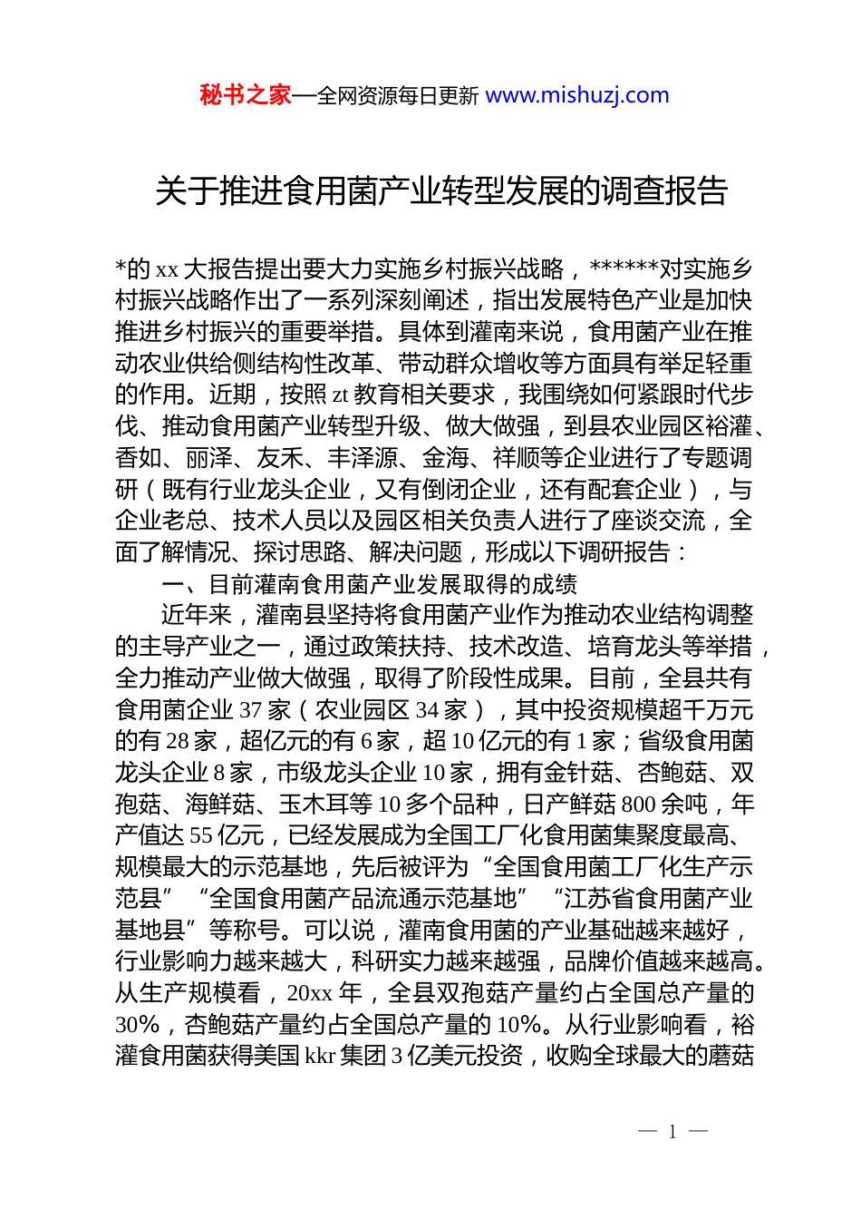 秘书之家—全网资源每日更新 www.mishuzj.com关于推进食用菌产业转型发展的调查报告*的 xx 大报告提出要大力实施乡村振兴战略,******对实施乡村振兴战略作出了一系列深刻阐述,指出发展特色产业是加快推进乡村振兴的重要举措。具体到灌南来说,食用菌产业在推动农业供给侧结构性改革、带动群众增收等方面具有举足轻重的作用。近期,按照 zt 教育相关要求,我围绕如何紧跟时代步伐、推动食用菌产业转型升级、做大做强,到县农业园区裕灌、香如、丽泽、友禾、丰泽源、金海、祥顺等企业进行了专题调研(既有行业龙头企业,又有倒闭企业,还有配套企业),与企业老总、技术人员以及园区相关负责人进行了座谈交流,全面了解情况、探讨思路、解决问题,形成以下调研报告:一、目前灌南食用菌产业发展取得的成绩近年来,灌南县坚持将食用菌产业作为推动农业结构调整的主导产业之一,通过政策扶持、技术改造、培育龙头等举措,全力推动产业做大做强,取得了阶段性成果。目前,全县共有食用菌企业 37 家(农业园区 34 家),其中投资规模超千万元的有 28 家,超亿元的有 6 家,超 10 亿元的有 1 家;省级食用菌龙头企业 8 家,市级龙头企业 10 家,拥有金针菇、杏鲍菇、双孢菇、海鲜菇、玉木耳等 10 多个品种,日产鲜菇 800 余吨,年产值达 55 亿元,已经发展成为全国工厂化食用菌集聚度最高、规模最大的示范基地,先后被评为“全国食用菌工厂化生产示范县”“全国食用菌产品流通示范基地”“江苏省食用菌产业基地县”等称号。可以说,灌南食用菌的产业基础越来越好,行业影响力越来越大,科研实力越来越强,品牌价值越来越高。从生产规模看,20xx 年,全县双孢菇产量约占全国总产量的30%,杏鲍菇产量约占全国总产量的 10%。从行业影响看,裕灌食用菌获得美国 kkr 集团 3 亿美元投资,收购全球最大的蘑菇— 1 —秘书之家—全网资源每日更新 www.mishuzj.com菌种生产企业美国施尔丰公司,获评首批“江苏省外国专家工作室”,成为全球单体最大、技术水平最高、全产业链的食用菌企业;香如食用菌实现新三板上市,与李玉院士合作成立了院士工作站,两个企业分别成为双孢菇、杏鲍菇行业标准制定牵头企业,拥有较强的话语权。从品牌价值看,“灌南金针菇”获评国家地理标志,“香意”牌杏鲍菇先后荣获第十届国际农产品交易会金奖、中国工厂化食用菌十大品牌、江苏名牌等荣誉,食用菌企业累计获得“三品”基地认定证书 80 个,县农业园区获评省级现代农业示范园区,创成国家级出口食用菌质量安全示范区。二、灌南食用菌产业面临的问题随着全国食用菌产业快速发展和市场竞争越来越激烈,我县食用菌企业发展也凸显出不少问题和短板,主要表现在以下几个方面:一是产业规模还不够大。从规模上看,我县食用菌产业虽然有了长足的发展,但与具有“中国食用菌之都”之称的福建省古田县相比,无论在产业规模、产业链条、行业影响都还存在较大差距。古田县目前已开发种植食用菌品种 30 多个,产业总产值超百亿元人民币,具有全国最全的食用菌产业链条,原料采购、鲜品精加工、冷链物流、批发销售等全线产业聚合度极高,专业分工最细、生产规模最大、销售市场最广。二是外部竞争态势日益加剧。省外及周边许多市县都把发展食用菌产业作为促进农民增收的重要途径,推出诸多吸引力较强的优惠政策,瞄着我们园区的企业招商。例如,贵州、云南等地,利用国家扶贫资金大力引进食用菌企业,补贴标准最高甚至达投资总额的 30%;泗阳县采取政府建厂房出租给企业和给予企业固定资产投资总额不低于 10%奖励的政策,以吸引企业落户发展;灌云县、东海县、涟水县、金湖县、沭阳县也都出台政策大力引进规模型食用菌企业,而我县受制于土地等— 2 —秘书之家—全网资源每日更新 www.mishuzj.com资源约束,难以再给出优惠度较高的招商政策,竞争力相对减弱。三是企业的竞争力不强。当前,食用菌产业逐步进入第三个发展阶段,即资本化、技术化、智能化阶段,资金实力雄厚、技术水平高的食用菌企业不断涌现,而我县大部分食用菌企业还处于第二个发展阶段(机械化阶段),无论是企...