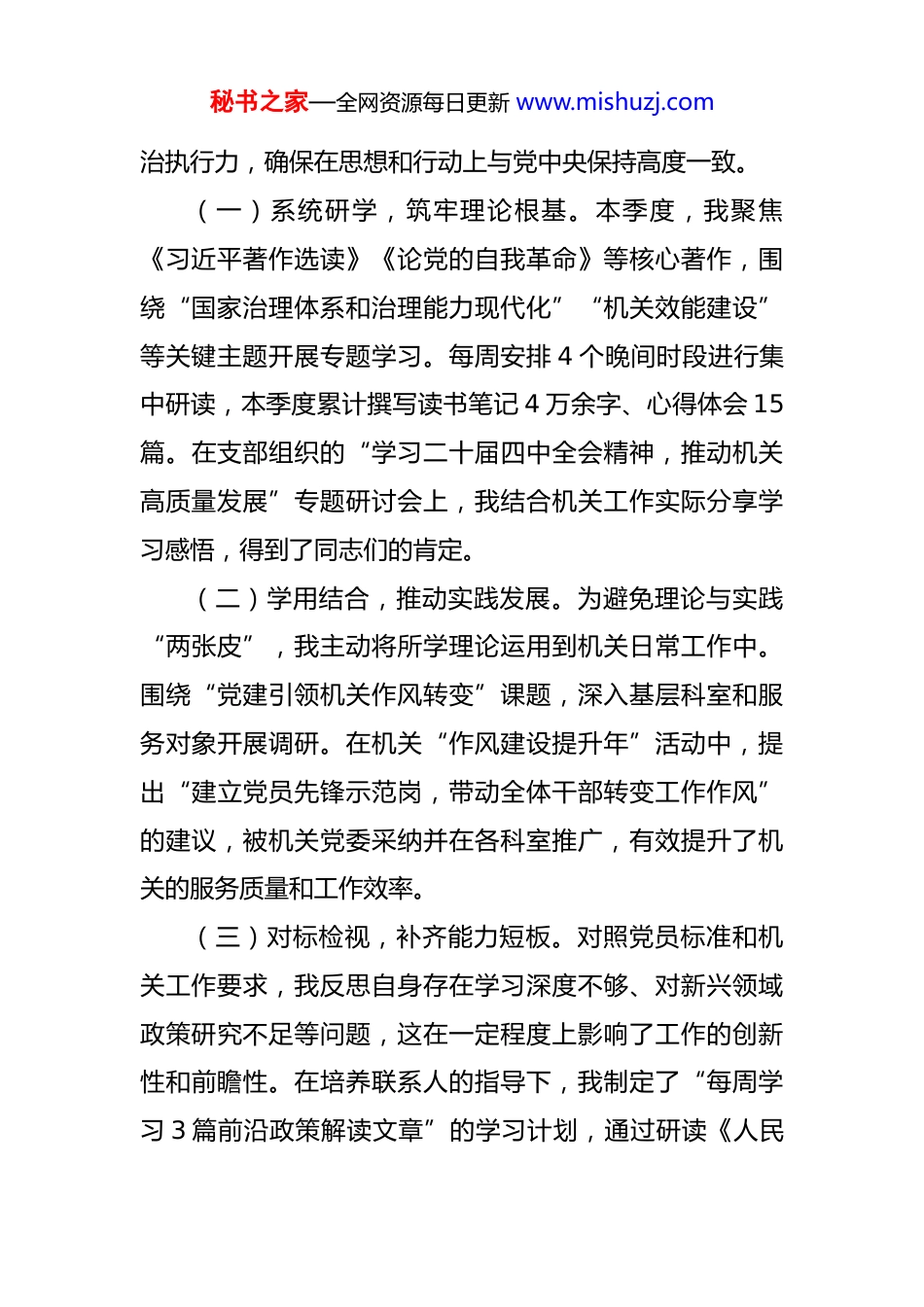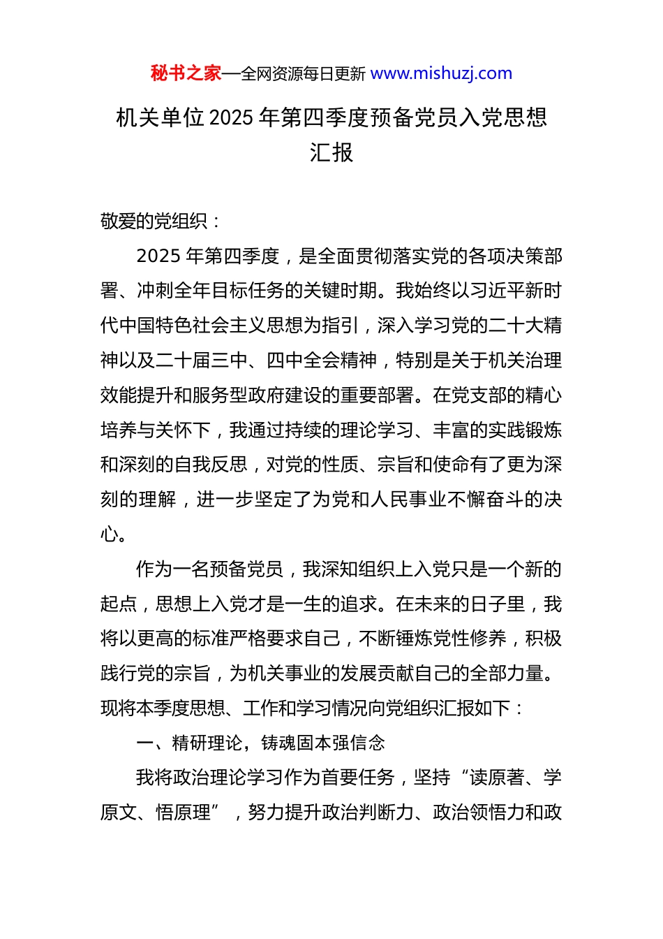 秘书之家—全网资源每日更新 www.mishuzj.com机关单位 2025 年第四季度预备党员入党思想汇报 敬爱的党组织:2025 年第四季度,是全面贯彻落实党的各项决策部署、冲刺全年目标任务的关键时期。我始终以习近平新时代中国特色社会主义思想为指引,深入学习党的二十大精神以及二十届三中、四中全会精神,特别是关于机关治理效能提升和服务型政府建设的重要部署。在党支部的精心培养与关怀下,我通过持续的理论学习、丰富的实践锻炼和深刻的自我反思,对党的性质、宗旨和使命有了更为深刻的理解,进一步坚定了为党和人民事业不懈奋斗的决心。作为一名预备党员,我深知组织上入党只是一个新的起点,思想上入党才是一生的追求。在未来的日子里,我将以更高的标准严格要求自己,不断锤炼党性修养,积极践行党的宗旨,为机关事业的发展贡献自己的全部力量。现将本季度思想、工作和学习情况向党组织汇报如下:一、精研理论,铸魂固本强信念我将政治理论学习作为首要任务,坚持“读原著、学原文、悟原理”,努力提升政治判断力、政治领悟力和政秘书之家—全网资源每日更新 www.mishuzj.com治执行力,确保在思想和行动上与党中央保持高度一致。(一)系统研学,筑牢理论根基。本季度,我聚焦《习近平著作选读》《论党的自我革命》等核心著作,围绕“国家治理体系和治理能力现代化”“机关效能建设”等关键主题开展专题学习。每周安排 4 个晚间时段进行集中研读,本季度累计撰写读书笔记 4 万余字、心得体会 15篇。在支部组织的“学习二十届四中全会精神,推动机关高质量发展”专题研讨会上,我结合机关工作实际分享学习感悟,得到了同志们的肯定。(二)学用结合,推动实践发展。为避免理论与实践“两张皮”,我主动将所学理论运用到机关日常工作中。围绕“党建引领机关作风转变”课题,深入基层科室和服务对象开展调研。在机关“作风建设提升年”活动中,提出“建立党员先锋示范岗,带动全体干部转变工作作风”的建议,被机关党委采纳并在各科室推广,有效提升了机关的服务质量和工作效率。(三)对标检视,补齐能力短板。对照党员标准和机关工作要求,我反思自身存在学习深度不够、对新兴领域政策研究不足等问题,这在一定程度上影响了工作的创新性和前瞻性。在培养联系人的指导下,我制定了“每周学习 3 篇前沿政策解读文章”的学习计划,通过研读《人民秘书之家—全网资源每日更新 www.mishuzj.com日报》评论文章、政府部门发布的行业动态等,拓宽知识视野,提升综合素养。二、勤勉履职,担当作为促发展机关工作责任重大、使命光荣。我始终牢记党员身份,立足本职岗位,积极担当作为,努力为机关事业发展贡献力量。(一)立足岗位,提升工作质效。在工作中,我认真履行岗位职责,积极参与机关各项重点工作任务。本季度,我负责组织筹备了多次重要会议和活动,从会议方案制定、嘉宾邀请到现场组织协调,每一个环节我都精心谋划、认真落实,确保了会议和活动的顺利进行。同时,我积极参与机关文件起草、政策制定等工作,充分发挥自己的专业优势,为机关决策提供了有力的支持。(二)勇于担当,破解工作难题。面对工作中的困难和挑战,我始终保持积极乐观的态度,勇于担当、敢于负责。在推进机关数字化转型工作中,我主动承担起了部分系统开发和数据整合的任务。面对技术难题和时间紧迫的双重压力,我加班加点、刻苦钻研,通过查阅大量资料、请教专家学者,最终成功完成了任务,为机关数字化转型工作的顺利推进做出了重要贡献。(三)团结协作,凝聚工作合力。机关工作需要各部秘书之家—全网资源每日更新 www.mishuzj.com门之间的密切配合和协同作战。我注重与同事之间的沟通交流和团结协作,积极参与团队活动,营造良好的工作氛围。在工作中,我主动分享自己的经验和想法,同时也虚心听取同事的意见和建议,共同推动工作的开展。通过团队的共同努力,我们顺利完成了多项重要工作任务,得到了领导和同事的一致好评。三、修身律己,清正廉洁守底线廉洁自律是党员干部的基本要求。我始终严格遵守党的纪律和规矩,自觉遵守廉洁自律的各项规定,做到清正廉洁、公私分明。(一)加...