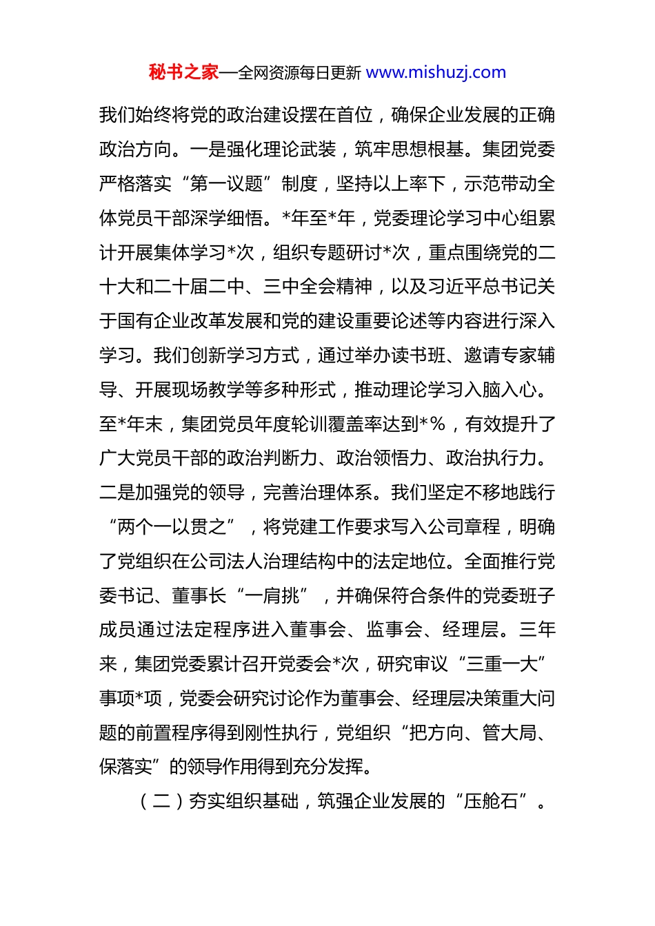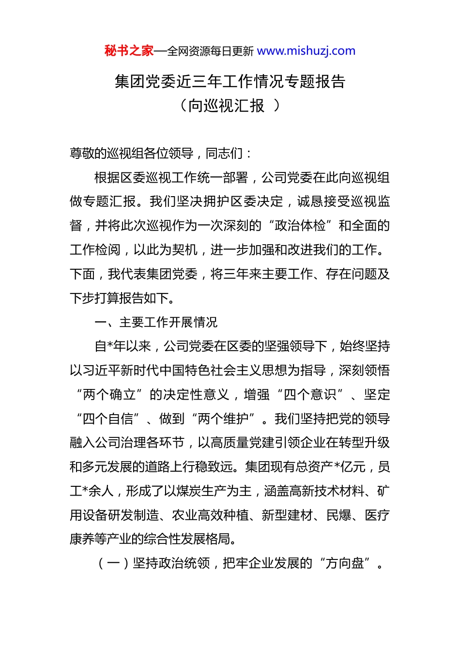 秘书之家—全网资源每日更新 www.mishuzj.com集团党委近三年工作情况专题报告(向巡视汇报 )尊敬的巡视组各位领导,同志们:根据区委巡视工作统一部署,公司党委在此向巡视组做专题汇报。我们坚决拥护区委决定,诚恳接受巡视监督,并将此次巡视作为一次深刻的“政治体检”和全面的工作检阅,以此为契机,进一步加强和改进我们的工作。下面,我代表集团党委,将三年来主要工作、存在问题及下步打算报告如下。一、主要工作开展情况自*年以来,公司党委在区委的坚强领导下,始终坚持以习近平新时代中国特色社会主义思想为指导,深刻领悟“两个确立”的决定性意义,增强“四个意识”、坚定“四个自信”、做到“两个维护”。我们坚持把党的领导融入公司治理各环节,以高质量党建引领企业在转型升级和多元发展的道路上行稳致远。集团现有总资产*亿元,员工*余人,形成了以煤炭生产为主,涵盖高新技术材料、矿用设备研发制造、农业高效种植、新型建材、民爆、医疗康养等产业的综合性发展格局。(一)坚持政治统领,把牢企业发展的“方向盘”。秘书之家—全网资源每日更新 www.mishuzj.com我们始终将党的政治建设摆在首位,确保企业发展的正确政治方向。一是强化理论武装,筑牢思想根基。集团党委严格落实“第一议题”制度,坚持以上率下,示范带动全体党员干部深学细悟。*年至*年,党委理论学习中心组累计开展集体学习*次,组织专题研讨*次,重点围绕党的二十大和二十届二中、三中全会精神,以及习近平总书记关于国有企业改革发展和党的建设重要论述等内容进行深入学习。我们创新学习方式,通过举办读书班、邀请专家辅导、开展现场教学等多种形式,推动理论学习入脑入心。至*年末,集团党员年度轮训覆盖率达到*%,有效提升了广大党员干部的政治判断力、政治领悟力、政治执行力。二是加强党的领导,完善治理体系。我们坚定不移地践行“两个一以贯之”,将党建工作要求写入公司章程,明确了党组织在公司法人治理结构中的法定地位。全面推行党委书记、董事长“一肩挑”,并确保符合条件的党委班子成员通过法定程序进入董事会、监事会、经理层。三年来,集团党委累计召开党委会*次,研究审议“三重一大”事项*项,党委会研究讨论作为董事会、经理层决策重大问题的前置程序得到刚性执行,党组织“把方向、管大局、保落实”的领导作用得到充分发挥。(二)夯实组织基础,筑强企业发展的“压舱石”。秘书之家—全网资源每日更新 www.mishuzj.com我们坚持大抓基层的鲜明导向,推动基层党组织全面进步、全面过硬。一是建强战斗堡垒。持续推进党支部标准化规范化建设,严格执行“三会一课”、组织生活会、民主评议党员等制度。我们着力破解党建与业务“两张皮”问题,连续三年开展“时代先锋”党员攻坚项目大赛,设立“党员责任区”*个,“党员先锋岗”*个。在*煤矿智能化工作面建设、新材料公司技术攻关等急难险重任务中,党员干部冲锋在前,先后有*个基层党组织、*余名党员因此受到集团及以上表彰,党组织的战斗堡垒作用和党员的先锋模范作用在生产经营一线熠熠生辉。二是锻造过硬队伍。坚持党管干部、党管人才原则,树立重实干、重实绩、重担当的选人用人导向。近三年来,我们选拔任用中层干部*人,其中*%以上来自生产一线和关键技术岗位。同时,加大年轻干部培养力度,建立后备干部库,对*名优秀年轻干部实行“导师制”培养,为企业长远发展储备了有生力量。(三)深化正风肃纪,筑牢企业发展的“防火墙”。我们坚定不移推进全面从严治党,持续营造风清气正的政治生态。一是压实“两个责任”。集团党委切实担负起主体责任,每年至少两次专题研究党风廉政建设工作,制定年度责任清单,层层传导压力。集团纪委聚焦主责主业,秘书之家—全网资源每日更新 www.mishuzj.com履行监督责任,运用“四种形态”处理*人次,其中第一、第二种形态占比超过*%,做到了抓早抓小、防微杜渐。二是深化廉洁教育。我们坚持教育在先、预防为主,组织关键岗位人员、新提任干部等到我区廉政教育基地接受警示教育*余场次,观看警示教育片*余部。组织全体中层以上管理人员签订《廉洁从业承诺书》超过*份,基本实...
