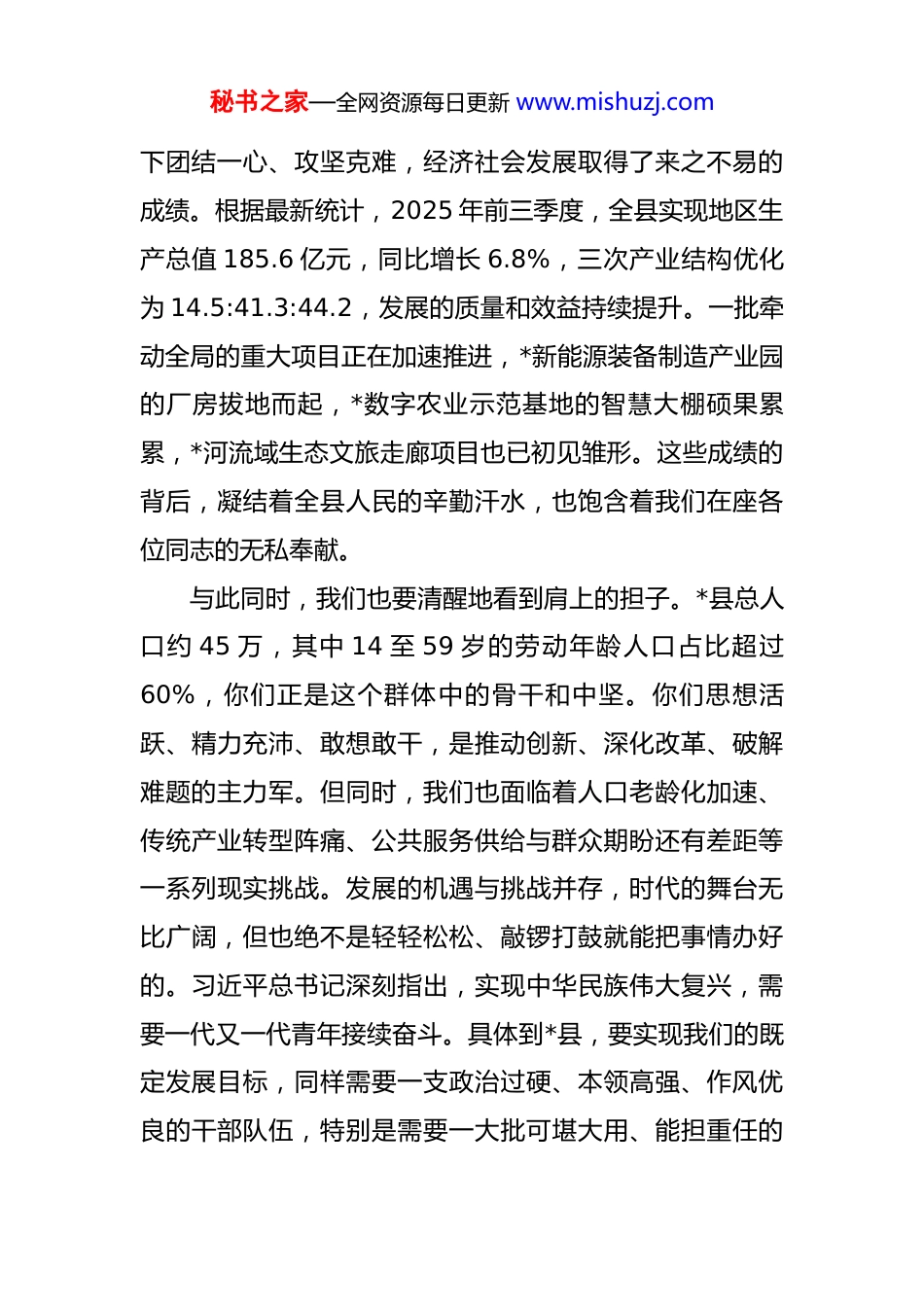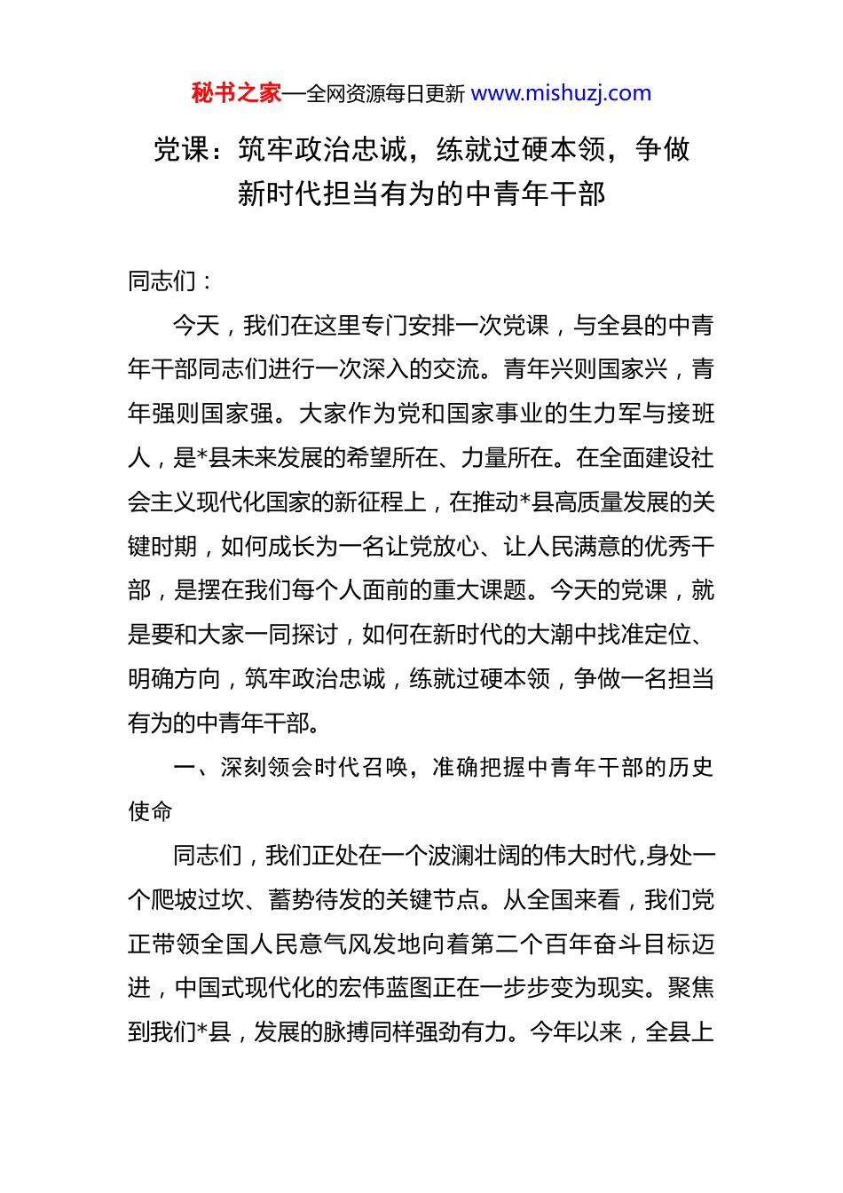 秘书之家—全网资源每日更新 www.mishuzj.com党课:筑牢政治忠诚,练就过硬本领,争做新时代担当有为的中青年干部 同志们:今天,我们在这里专门安排一次党课,与全县的中青年干部同志们进行一次深入的交流。青年兴则国家兴,青年强则国家强。大家作为党和国家事业的生力军与接班人,是*县未来发展的希望所在、力量所在。在全面建设社会主义现代化国家的新征程上,在推动*县高质量发展的关键时期,如何成长为一名让党放心、让人民满意的优秀干部,是摆在我们每个人面前的重大课题。今天的党课,就是要和大家一同探讨,如何在新时代的大潮中找准定位、明确方向,筑牢政治忠诚,练就过硬本领,争做一名担当有为的中青年干部。一、深刻领会时代召唤,准确把握中青年干部的历史使命同志们,我们正处在一个波澜壮阔的伟大时代,身处一个爬坡过坎、蓄势待发的关键节点。从全国来看,我们党正带领全国人民意气风发地向着第二个百年奋斗目标迈进,中国式现代化的宏伟蓝图正在一步步变为现实。聚焦到我们*县,发展的脉搏同样强劲有力。今年以来,全县上秘书之家—全网资源每日更新 www.mishuzj.com下团结一心、攻坚克难,经济社会发展取得了来之不易的成绩。根据最新统计,2025 年前三季度,全县实现地区生产总值 185.6 亿元,同比增长 6.8%,三次产业结构优化为 14.5:41.3:44.2,发展的质量和效益持续提升。一批牵动全局的重大项目正在加速推进,*新能源装备制造产业园的厂房拔地而起,*数字农业示范基地的智慧大棚硕果累累,*河流域生态文旅走廊项目也已初见雏形。这些成绩的背后,凝结着全县人民的辛勤汗水,也饱含着我们在座各位同志的无私奉献。与此同时,我们也要清醒地看到肩上的担子。*县总人口约 45 万,其中 14 至 59 岁的劳动年龄人口占比超过60%,你们正是这个群体中的骨干和中坚。你们思想活跃、精力充沛、敢想敢干,是推动创新、深化改革、破解难题的主力军。但同时,我们也面临着人口老龄化加速、传统产业转型阵痛、公共服务供给与群众期盼还有差距等一系列现实挑战。发展的机遇与挑战并存,时代的舞台无比广阔,但也绝不是轻轻松松、敲锣打鼓就能把事情办好的。习近平总书记深刻指出,实现中华民族伟大复兴,需要一代又一代青年接续奋斗。具体到*县,要实现我们的既定发展目标,同样需要一支政治过硬、本领高强、作风优良的干部队伍,特别是需要一大批可堪大用、能担重任的秘书之家—全网资源每日更新 www.mishuzj.com中青年干部脱颖而出。因此,大家必须深刻认识到自己所处的历史方位,把个人的成长融入时代发展的洪流,把个人的理想追求融入党和人民的事业之中,以“功成不必在我,功成必定有我”的境界和担当,奋力跑好我们这一代人的“接力棒”。二、筑牢政治忠诚,始终做政治上的“明白人”“老实人”对党忠诚,是共产党人首要的政治品质。习近平总书记反复强调,衡量干部是否有理想信念,关键看是否对党忠诚。这种忠诚,不是空洞的口号,而是具体的、实践的。它体现在我们工作和生活的方方面面,是我们立身之本、成事之基。对于中青年干部而言,政治上的成熟是成长道路上最关键的一步。如何做到对党忠诚?我认为,核心就是要深刻领会并自觉践行习近平总书记在 2024 年春季学期中央党校中青年干部培训班上提出的“五个自觉”重要要求。第一,要自觉做党的创新理论的笃信笃行者。理论上的清醒是政治上坚定的基础。党的十八大以来,我们党在实践中创立了习近平新时代中国特色社会主义思想,这是当代中国马克思主义、二十一世纪马克思主义。学习这一思想,绝不能满足于读了几本书、记了几个名词,而是要秘书之家—全网资源每日更新 www.mishuzj.com往深里走、往实里走、往心里走。要通过学习,深刻理解其核心要义、精神实质、丰富内涵和实践要求,真正搞清楚我们党“为什么能”、马克思主义“为什么行”、中国特色社会主义“为什么好”。县委党校要发挥好主阵地作用,不断创新教学方式,把党的创新理论讲深、讲透、讲活,帮助大家真正做到学思用贯通、知信行统一。大家要把理论学习当作一种生活方式、一种精神追求,用党的创新理论武装头脑、指导实践、...