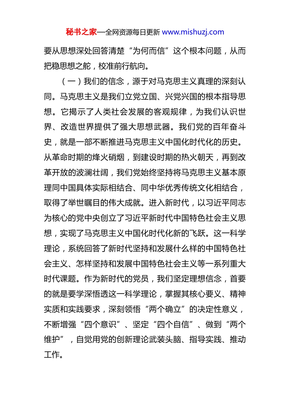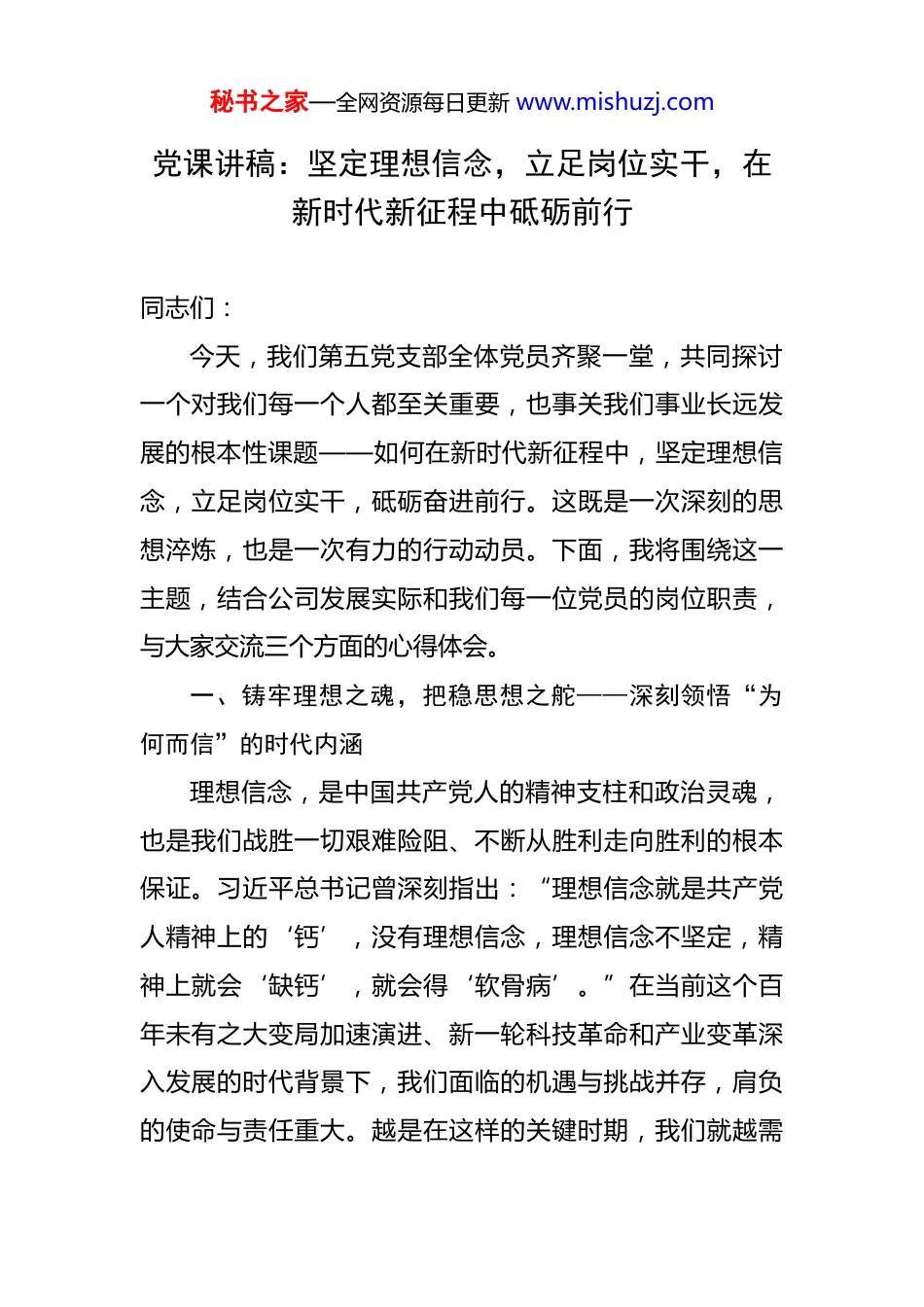 秘书之家—全网资源每日更新 www.mishuzj.com党课讲稿:坚定理想信念,立足岗位实干,在新时代新征程中砥砺前行 同志们:今天,我们第五党支部全体党员齐聚一堂,共同探讨一个对我们每一个人都至关重要,也事关我们事业长远发展的根本性课题——如何在新时代新征程中,坚定理想信念,立足岗位实干,砥砺奋进前行。这既是一次深刻的思想淬炼,也是一次有力的行动动员。下面,我将围绕这一主题,结合公司发展实际和我们每一位党员的岗位职责,与大家交流三个方面的心得体会。一、铸牢理想之魂,把稳思想之舵——深刻领悟“为何而信”的时代内涵理想信念,是中国共产党人的精神支柱和政治灵魂,也是我们战胜一切艰难险阻、不断从胜利走向胜利的根本保证。习近平总书记曾深刻指出:“理想信念就是共产党人精神上的‘钙’,没有理想信念,理想信念不坚定,精神上就会‘缺钙’,就会得‘软骨病’。”在当前这个百年未有之大变局加速演进、新一轮科技革命和产业变革深入发展的时代背景下,我们面临的机遇与挑战并存,肩负的使命与责任重大。越是在这样的关键时期,我们就越需秘书之家—全网资源每日更新 www.mishuzj.com要从思想深处回答清楚“为何而信”这个根本问题,从而把稳思想之舵,校准前行航向。(一)我们的信念,源于对马克思主义真理的深刻认同。马克思主义是我们立党立国、兴党兴国的根本指导思想。它揭示了人类社会发展的客观规律,为我们认识世界、改造世界提供了强大思想武器。我们党的百年奋斗史,就是一部不断推进马克思主义中国化时代化的历史。从革命时期的烽火硝烟,到建设时期的热火朝天,再到改革开放的波澜壮阔,我们党始终坚持将马克思主义基本原理同中国具体实际相结合、同中华优秀传统文化相结合,取得了举世瞩目的伟大成就。进入新时代,以习近平同志为核心的党中央创立了习近平新时代中国特色社会主义思想,实现了马克思主义中国化时代化新的飞跃。这一科学理论,系统回答了新时代坚持和发展什么样的中国特色社会主义、怎样坚持和发展中国特色社会主义等一系列重大时代课题。作为新时代的党员,我们坚定理想信念,首要的就是要学深悟透这一科学理论,掌握其核心要义、精神实质和实践要求,深刻领悟“两个确立”的决定性意义,不断增强“四个意识”、坚定“四个自信”、做到“两个维护”,自觉用党的创新理论武装头脑、指导实践、推动工作。秘书之家—全网资源每日更新 www.mishuzj.com(二)我们的信念,源于对中国特色社会主义的无比自信。道路问题是关系党的事业兴衰成败第一位的问题。中国特色社会主义道路,是党和人民历经千辛万苦、付出巨大代价取得的根本成就。这条道路,既坚持了科学社会主义的基本原则,又根据我国国情和时代特点赋予其鲜明的中国特色。实践是检验真理的唯一标准。几十年来,我们在这条道路上创造了经济快速发展和社会长期稳定两大奇迹,中华民族迎来了从站起来、富起来到强起来的伟大飞跃。反观世界上一些国家,由于道路选择的错误,陷入了政治动荡、经济停滞甚至社会撕裂的困境。历史和现实都雄辩地证明,中国特色社会主义道路是完全正确的、是行得通的。我们作为国有企业的党员,是这条道路的坚定实践者和捍卫者。*公司的发展壮大,正是中国特色社会主义制度优越性的生动缩影。我们必须倍加珍惜、长期坚持,以高度的道路自信、理论自信、制度自信、文化自信,心无旁骛地走好我们自己的路。(三)我们的信念,源于对实现中华民族伟大复兴的使命担当。实现中华民族伟大复兴,是近代以来中华民族最伟大的梦想。今天,我们比历史上任何时期都更接近、更有信心和能力实现这个目标。但行百里者半九十,越是接近目标,我们面临的风险挑战就越严峻复杂。作为国家秘书之家—全网资源每日更新 www.mishuzj.com经济体系的重要组成部分,我们*公司承担着服务区域经济发展、推动产业转型升级、保障关键供应链稳定的重要使命。我们正在推进的*智慧港口项目、*国际物流枢纽建设,以及我们*子公司正在攻坚的新能源汽车核心零部件国产化替代等重点任务,都与国家发展战略紧密相连,是我们服务构建新发展格局的具体行动。因此,我们每一位党员...