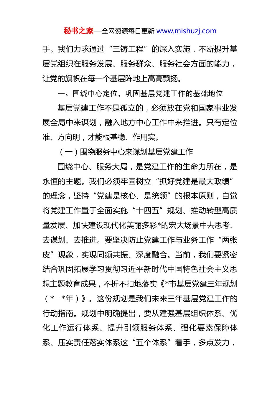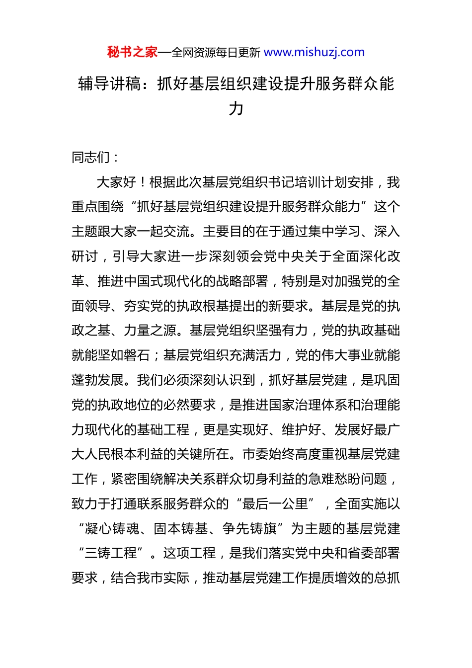 秘书之家—全网资源每日更新 www.mishuzj.com辅导讲稿:抓好基层组织建设提升服务群众能力 同志们:大家好!根据此次基层党组织书记培训计划安排,我重点围绕“抓好基层党组织建设提升服务群众能力”这个主题跟大家一起交流。主要目的在于通过集中学习、深入研讨,引导大家进一步深刻领会党中央关于全面深化改革、推进中国式现代化的战略部署,特别是对加强党的全面领导、夯实党的执政根基提出的新要求。基层是党的执政之基、力量之源。基层党组织坚强有力,党的执政基础就能坚如磐石;基层党组织充满活力,党的伟大事业就能蓬勃发展。我们必须深刻认识到,抓好基层党建,是巩固党的执政地位的必然要求,是推进国家治理体系和治理能力现代化的基础工程,更是实现好、维护好、发展好最广大人民根本利益的关键所在。市委始终高度重视基层党建工作,紧密围绕解决关系群众切身利益的急难愁盼问题,致力于打通联系服务群众的“最后一公里”,全面实施以“凝心铸魂、固本铸基、争先铸旗”为主题的基层党建“三铸工程”。这项工程,是我们落实党中央和省委部署要求,结合我市实际,推动基层党建工作提质增效的总抓秘书之家—全网资源每日更新 www.mishuzj.com手。我们力求通过“三铸工程”的深入实施,不断提升基层党组织在服务发展、服务群众、服务社会方面的能力,让党的旗帜在每一个基层阵地上高高飘扬。一、围绕中心定位,巩固基层党建工作的基础地位基层党建工作不是孤立的,必须放在党和国家事业发展全局中来谋划,融入地方中心工作中来推进。只有定位准、方向明,才能根基稳、作用实。(一)围绕服务中心来谋划基层党建工作围绕中心、服务大局,是党建工作的生命力所在,是永恒的主题。我们必须牢固树立“抓好党建是最大政绩”的理念,坚持“党建是核心、是统领”的根本原则,自觉将党建工作置于全面实施“十四五”规划、推动转型高质量发展、加快建设现代化美丽多彩*的宏大场景中去思考、去谋划、去推进。要坚决防止党建工作与业务工作“两张皮”现象,实现同频共振、深度融合。当前,我们要紧密结合巩固拓展学习贯彻习近平新时代中国特色社会主义思想主题教育成果,不折不扣地落实《*市基层党建三年规划(*—*年)》。这份规划是我们未来三年基层党建工作的行动指南。规划中明确提出,要从建强基层组织体系、优化工作运行体系、提升引领服务体系、强化要素保障体系、压实责任落实体系这“五个体系”着手,多点发力,秘书之家—全网资源每日更新 www.mishuzj.com协同推进。具体而言,就是要持续“抓基础、提质效”,夯实组织根基,提升工作效能;“树典型、创品牌”,发挥示范引领,打造特色亮点;“补短板、扬优势”,针对薄弱环节精准发力,将成功做法固化深化。检验党建工作成效的最终标准,要看发展实绩。我们要牢固树立“以发展成果检验党建成效”的鲜明导向。各级党组织书记要经常反思:我们的党建工作,是否真正转化为推动本地区、本部门、本单位中心工作的强大动力?是否在招商引资、项目建设、产业升级、乡村振兴、优化营商环境等主战场上发挥了不可替代的引领和保障作用?是否通过扎实的党建工作和有效的群众工作,凝聚了人心、汇聚了力量,推动了经济社会持续健康发展?例如,在推进乡村振兴中,村党组织是否成为产业发展的“主心骨”;在社区治理中,社区党组织是否成为化解矛盾、服务居民的“贴心人”;在机关单位,党组织是否成为改进作风、提升效能的“示范窗”。这些都是我们需要用实践来回答的重要课题。(二)坚持改革创新来推动基层党建工作改革创新是时代精神的核心,也是破解基层党建难题、激发基层活力的关键钥匙。面对新形势新任务,故步自封没有出路,因循守旧只会停滞不前。我们必须勇于探秘书之家—全网资源每日更新 www.mishuzj.com索,敢于突破,用改革的思路和创新的办法,解决基层党建工作中遇到的新情况新问题,特别是要着力破解基层治理中长期存在的“小马拉大车”等突出矛盾。为此,市委、市政府下了很大决心,纵深推进基层管理体制改革。我们不仅印发了详细的“重点任务清单”,将宏观要求细化为*项可操作、可考核的具体任务,明确了每项...