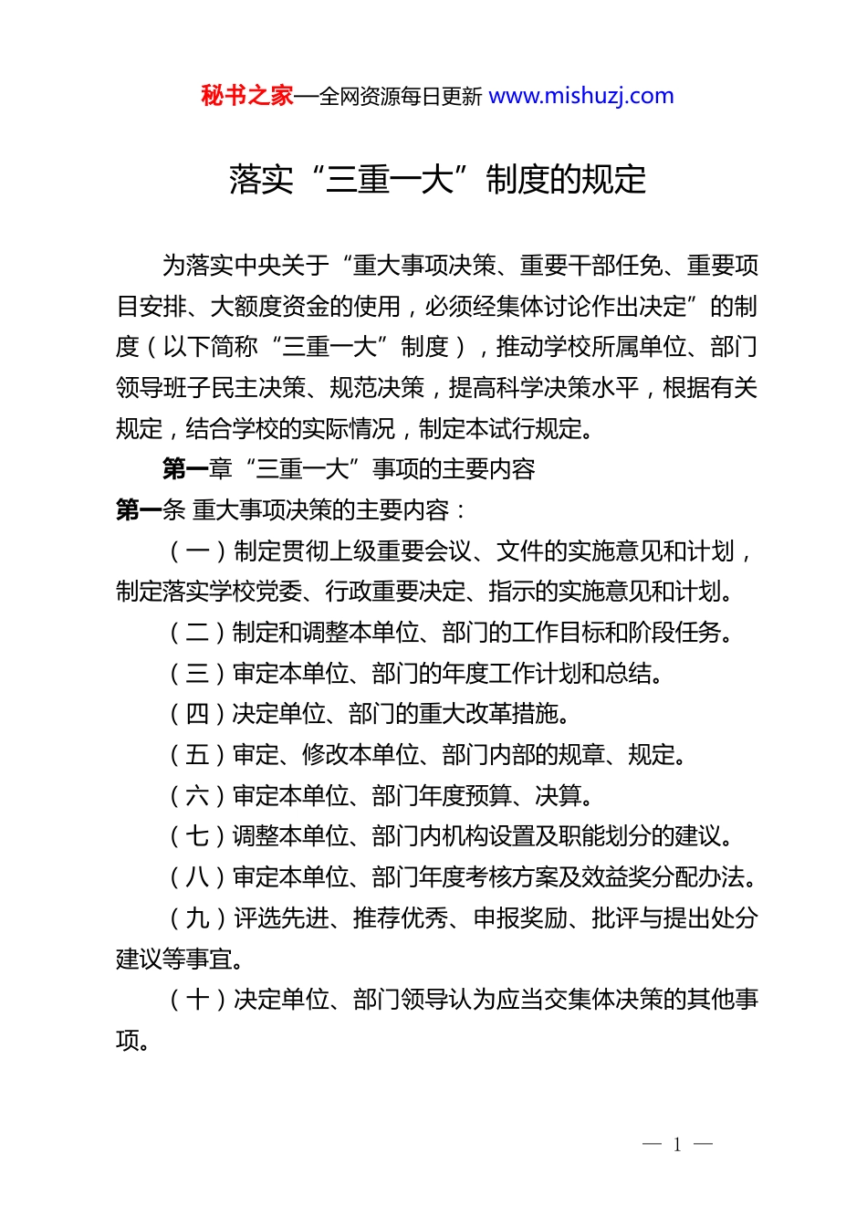 秘书之家—全网资源每日更新 www.mishuzj.com落实“三重一大”制度的规定为落实中央关于“重大事项决策、重要干部任免、重要项目安排、大额度资金的使用,必须经集体讨论作出决定”的制度(以下简称“三重一大”制度),推动学校所属单位、部门领导班子民主决策、规范决策,提高科学决策水平,根据有关规定,结合学校的实际情况,制定本试行规定。第一章“三重一大”事项的主要内容第一条 重大事项决策的主要内容:(一)制定贯彻上级重要会议、文件的实施意见和计划,制定落实学校党委、行政重要决定、指示的实施意见和计划。(二)制定和调整本单位、部门的工作目标和阶段任务。(三)审定本单位、部门的年度工作计划和总结。(四)决定单位、部门的重大改革措施。(五)审定、修改本单位、部门内部的规章、规定。(六)审定本单位、部门年度预算、决算。(七)调整本单位、部门内机构设置及职能划分的建议。(八)审定本单位、部门年度考核方案及效益奖分配办法。(九)评选先进、推荐优秀、申报奖励、批评与提出处分建议等事宜。(十)决定单位、部门领导认为应当交集体决策的其他事项。— 1 —秘书之家—全网资源每日更新 www.mishuzj.com第二条 干部任免和重要人事安排的范围:(一)组织人事部门建议任命本单位、部门科级(含副科)干部。(二)审定科级后备干部名单。(三)本单位、部门工作岗位人事安排及人员招聘工作。(四)单位、部门领导认为应当交集体讨论决定的其他重要安排。第三条 重要项目安排的范围:(一)未列入计划和预算的不动产购置、置换的提出。(二)未列入计划和预算的涉及到学校较大额度支出的仪器设备材料添置更新、重要修缮项目的提出。(三)单位、部门人员的学历教育和培训进修的安排。(四)单位、部门领导认为应当交集体讨论决定的其他重要项目安排。第四条 大额度资金的使用范围:(一)未列入单位、部门年度经费预算范围,单项支出在10 万元以上项目的提出;(二)未列入年度经费预算,因工作任务发生变化,年中需增加经费支出 10 万元以上的;(三)财务预算内 10 万元以上计划(含专项经费使用计划)的调整和改变。(四)单位、部门领导认为应交集体讨论决定的其它开支— 2 —秘书之家—全网资源每日更新 www.mishuzj.com项目。第二章决策的程序和办法第五条 “三重一大”事项必须根据具体内容,提交单位、部门领导班子会议决策。班子成员三人以上的,应有三分之二以上人员出席方可举行会议;班子成员为三人或三人以下的,必须全部出席方可举行会议。决议采取表决制,赞成人数超过到会人员半数以上为通过。第六条 “三重一大”事项提交会议讨论决策前,可根据需要召开单位、部门成员会议,或通过员工座谈会、听取其他部门意见等形式,征求各方意见。第七条 “三重一大”事项提交会议讨论决策前,应在单位、部门领导班子内充分酝酿,不得临时动议。第八条 单位、部门领导班子内部对“三重一大”事项存在较大分歧,或因情况不清感到决策把握不大,若无时限要求,一般应推迟决议,待时机成熟后,再提交会议决策。第九条 已经单位、部门领导班子集体决策的“三重一大”事项,如有半数以上领导班子成员提出复议,可上会复议,重新进行集体决策。第十条 单位、部门领导班子成员参与集体决策“三重一大”事项,遇到与本人有直接利益关系或涉及本人亲属的情况,应主动回避。第十一条 对尚未正式公布的决策和绝密的会议内容,与会— 3 —秘书之家—全网资源每日更新 www.mishuzj.com人员不得泄露,如有违反将追究责任。第十二条 “三重一大”事项的讨论决策情况,包括参与人员、事项内容、讨论过程和决策结论等,要有记录,并存档备案。第三章决策的执行第十三条 “三重一大”事项经集体讨论决策后,由单位、部门领导班子成员按分工和职责组织实施。遇有分工不明或职责交叉的,由领导班子明确一名成员牵头协调。第十四条 集体决策已经形成,每个领导班子成员都要维护集体决策,齐心贯彻执行。个人有不同意见的,可以保留意见,但不能在领导班子外散布不同意见。在领导班子没有作出新的集体决定前,应无条件执行原有决...