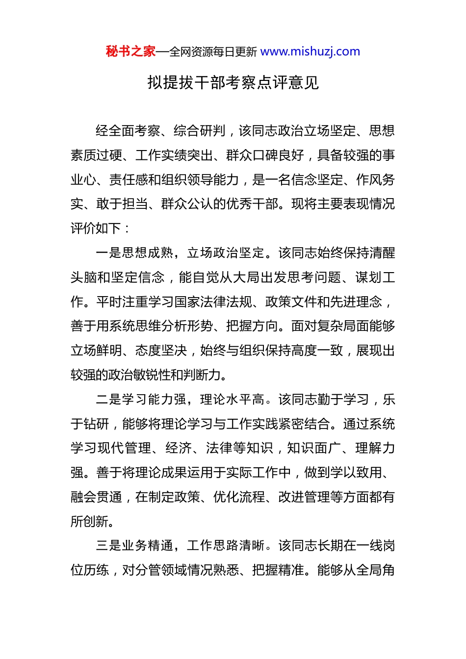 秘书之家—全网资源每日更新 www.mishuzj.com拟提拔干部考察点评意见 经全面考察、综合研判,该同志政治立场坚定、思想素质过硬、工作实绩突出、群众口碑良好,具备较强的事业心、责任感和组织领导能力,是一名信念坚定、作风务实、敢于担当、群众公认的优秀干部。现将主要表现情况评价如下:一是思想成熟,立场政治坚定。该同志始终保持清醒头脑和坚定信念,能自觉从大局出发思考问题、谋划工作。平时注重学习国家法律法规、政策文件和先进理念,善于用系统思维分析形势、把握方向。面对复杂局面能够立场鲜明、态度坚决,始终与组织保持高度一致,展现出较强的政治敏锐性和判断力。二是学习能力强,理论水平高。该同志勤于学习,乐于钻研,能够将理论学习与工作实践紧密结合。通过系统学习现代管理、经济、法律等知识,知识面广、理解力强。善于将理论成果运用于实际工作中,做到学以致用、融会贯通,在制定政策、优化流程、改进管理等方面都有所创新。三是业务精通,工作思路清晰。该同志长期在一线岗位历练,对分管领域情况熟悉、把握精准。能够从全局角秘书之家—全网资源每日更新 www.mishuzj.com度统筹谋划工作思路,善于抓重点、破难题,条理清晰、思路明晰。多次牵头完成重点项目,推动本部门工作实现新突破,展现出较强的专业素养与执行力。四是能力突出,善抓关键环节。该同志擅长从整体上分析问题、统筹布局,注重前瞻性思考。制定工作计划时,能够抓住关键点、找准突破口,在统筹兼顾与突出重点中取得平衡。对待复杂任务不畏难、不拖延,善于在矛盾中寻找解决方案,确保各项工作稳步推进。五是执行力强,落实成效显著。无论是上级部署任务还是本部门重点项目,该同志都能第一时间响应,第一时间行动。对工作进度实行清单化、节点化、责任化管理,确保每项任务落实到人、执行到位。敢于攻坚克难、冲锋在前,做到了“定一件、成一件、报一件”,推动了整体工作提速增效。六是创新意识强,敢闯敢试。该同志具有较强的创新精神,敢于打破固有模式,善于在工作中发现问题、提出新思路。主持的多项创新实践在单位内部形成经验并推广应用。注重运用信息化、数字化手段提升工作效能,推动工作流程精简化、规范化。七是敢于担当,勇于负责。该同志面对急难任务不推诿、不畏难,能够主动迎难而上,善于应对突发情况。遇秘书之家—全网资源每日更新 www.mishuzj.com事冷静果断、处理有方,既坚持原则,又注重方法,赢得了干部职工的信任与支持。能够在关键时刻挺身而出、主动担责,表现出强烈的责任感与使命感。八是作风务实,工作细致。无论岗位轻重,该同志都以严谨、细致、务实的态度对待每一项任务。能沉下心、俯下身,深入基层掌握实情,坚持问题导向、结果导向,不做表面文章。工作中注重总结经验、举一反三,推动工作持续改进。九是组织协调能力强。在工作中善于沟通衔接,注重横向协作与纵向联动。无论是跨部门任务还是多层级项目,该同志都能统筹资源、整合力量,促进协作配合。尤其在重点工程推进、应急处置等环节中,能够果断指挥、科学调度,体现出较高的组织协调水平。十是应变能力强。在面对紧急事件或突发问题时,能够沉着冷静、果断决策,快速找到应对方案,防止事态扩大。具备较强的心理承压能力和危机应对经验。十一是群众观念牢固。始终把群众利益放在首位,深入基层了解情况、倾听意见,注重解决实际问题。坚持“从群众中来,到群众中去”的工作方法,重视群众建议反馈,积极改进服务质量,赢得群众的普遍赞誉。十二是沟通协调到位。在日常管理和跨部门合作中,秘书之家—全网资源每日更新 www.mishuzj.com该同志善于倾听、善于表达,能够有效协调不同意见、化解矛盾分歧。语言表达清晰、逻辑严密,沟通效果好。既能坚持原则,又能照顾情绪,保持团队稳定和工作顺畅。十三是领导艺术较高。善于根据不同对象采取不同的领导方式,既能严管,又能厚爱。工作中注重以身作则,带动团队积极性和创造力。能做到严而有度、管而有方,形成了既有纪律又有温度的团队氛围。十四是团队意识强,善于凝聚合力。能够在集体中起到核心作用,带头团结同事,调动团队活力。...