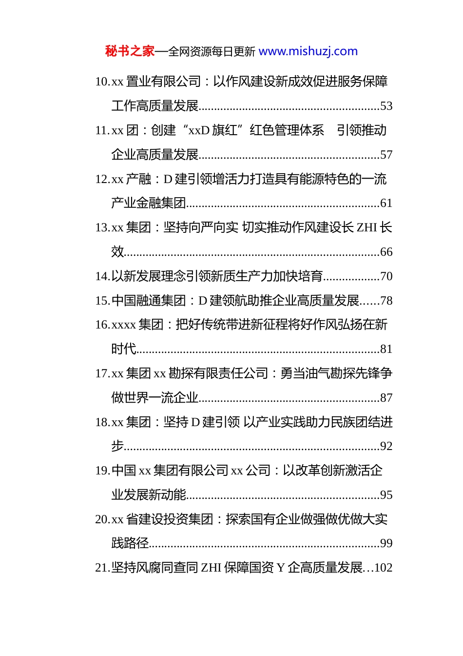 秘书之家—全网资源每日更新 www.mishuzj.com企业 D 建文稿汇编(31 篇)目录1. xxxx 水电开发有限责任公司:在助力新时代西部大开发中展现 xx 担当......................................................42. 新质生产力赋能高质量发展的实现路径....................83. 把现代能源经济这篇文章做好..................................144. 大国重器彰显国家创新能力......................................235. xx 国际电力股份有限公司 xx 开发区分公司:统筹高质量发展和高水平安全 当好能源保供“顶梁柱”.276. 国企 D 建“链”上发力 D 旗引领攀高向新.............347. xx 高速 xx 公路有限公司:厚植廉洁之基 涵养清风正气..............................................................................398. 中国 xx 集团有限公司 xx 分公司:以推进高质量发展为主线进一步提升企业核心竞争力......................429. 国网 xx 省电力有限公司培训中心:推动国企领导人员培训提升质效..........................................................48秘书之家—全网资源每日更新 www.mishuzj.com10.xx 置业有限公司:以作风建设新成效促进服务保障工作高质量发展..........................................................5311.xx 团:创建“xxD 旗红”红色管理体系 引领推动企业高质量发展..........................................................5712.xx 产融:D 建引领增活力打造具有能源特色的一流产业金融集团..............................................................6113.xx 集团:坚持向严向实 切实推动作风建设长 ZHI 长效..................................................................................6614.以新发展理念引领新质生产力加快培育..................7015.中国融通集团:D 建领航助推企业高质量发展......7816.xxxx 集团:把好传统带进新征程将好作风弘扬在新时代..............................................................................8117.xx 集团 xx 勘探有限责任公司:勇当油气勘探先锋争做世界一流企业..........................................................8718.xx 集团:坚持 D 建引领 以产业实践助力民族团结进步..................................................................................9219.中国 xx 集团有限公司 xx 公司:以改革创新激活企业发展新动能..............................................................9520.xx 省建设投资集团:探索国有企业做强做优做大实践路径..........................................................................9921.坚持风腐同查同 ZHI 保障国资 Y 企高质量发展...102秘书之家—全网资源每日更新 www.mishuzj.com22.高质量 D 建引领“轨道上的 xx”建设跑出加速度. 11123.以 D 建引领加快发展新质生产力............................11324.xx 八局新型建造工程有限公司:D 建引领科技创新 赋能企业高质量发展................................................11925.优化机制推动国企更好服务国家战略....................12226.xx 集团:汇聚建设世界一流企业强大精神力量...12527.xx 三局 xx 公司 xx 分公司:以 D 建联建赋能企业高质量发展....................................................................13128.深学细悟践初心 笃行实干担使命...........................13329.xx 有限公司:牢记“国之大者” 扛牢使命责任 把国企 D 建政 ZHI 优势转化为发展优势...................13930.xx 电网鼎和保险公司:D 建引领促发展加快打造“能源行业保险专家”............................................14931.协同联动护航国企发展............................................153xxxx 水电开发有限责任公司:在助力新时代西部大开发中展现 xx 担当习近平总书记在 xx 考察时指出,坚持以高质量发展统揽全局,在中国...